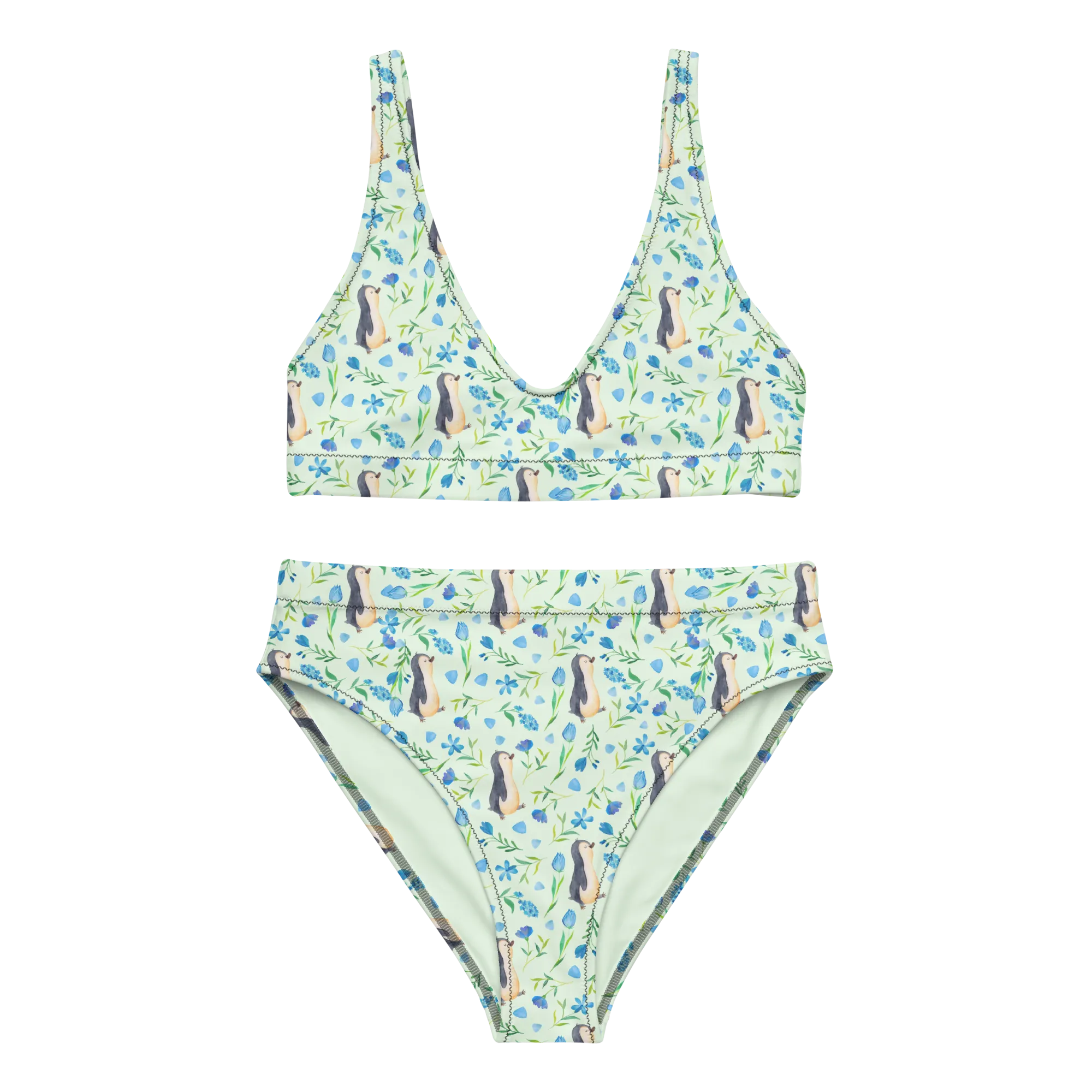 Bikini Penguin Love Design Zweiteiler, 2er Set, Bikinihose, High Waist Bikini, Bikini, Bademode, Bikinioberteil, Muster, Blaue Blumen, Pinguin, Aquarell, Pinguine, Blumen
