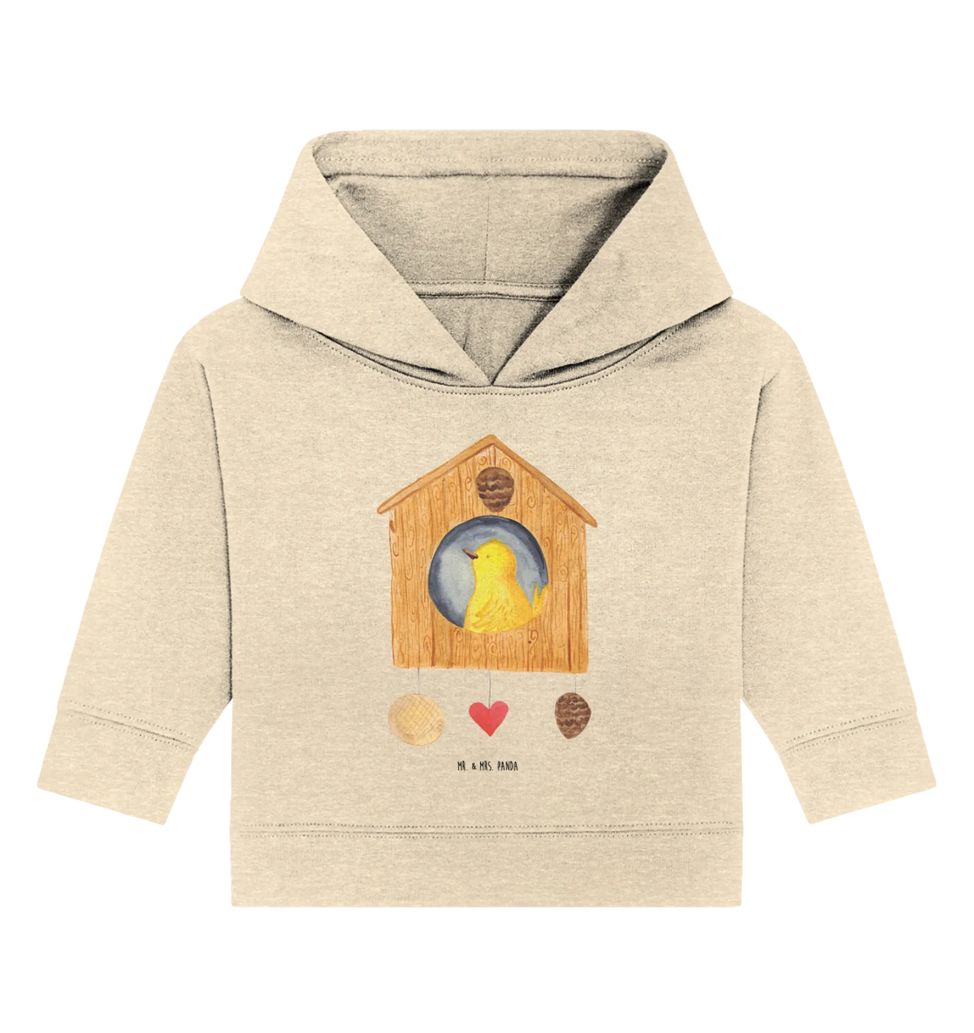 Made from soft, organic cotton, this pullover will keep your little one cozy while they explore their surroundings. Imagine your baby snugged up in this adorable hoodie, showcasing a delightful scene of a proud little bird perched comfortably in its charming birdhouse. Hand-painted by Mrs. Panda using watercolors, this beautiful design evokes the warmth of "home sweet home" and resonates perfectly with any family moving into a new home or celebrating the arrival of their bundle of joy.