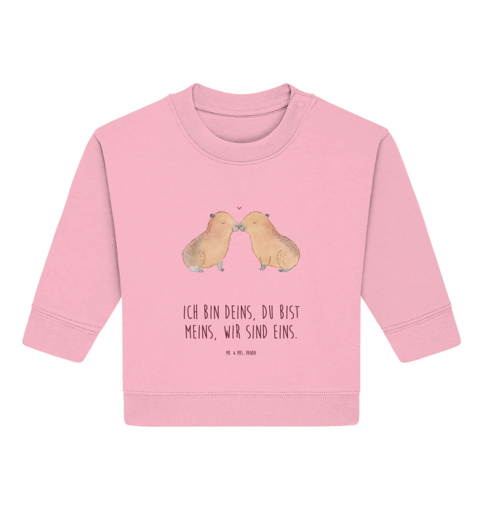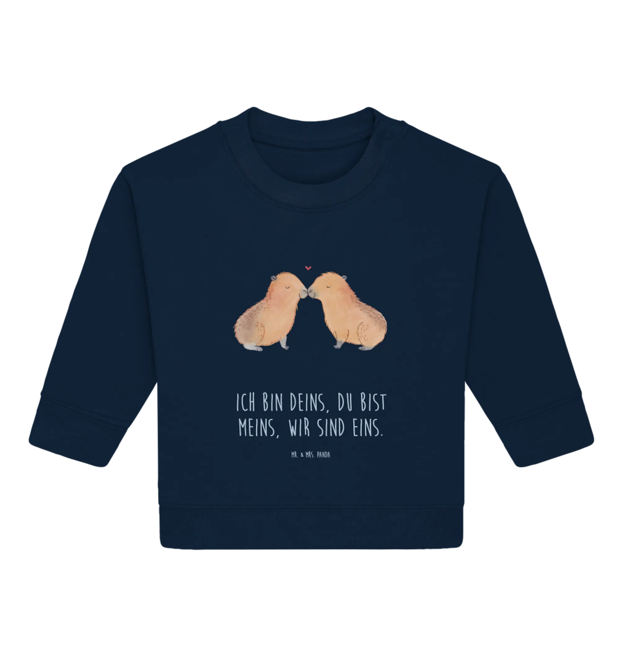 Die beiden Capybaras, die sich an der Schnauze berühren und durch ein kleines rotes Herz verbunden sind, drücken eine herzliche Tierliebe aus, die schon die Kleinsten begeistert. Egal, ob du auf der Suche nach einem niedlichen Geburtstagsgeschenk, einem liebevollen Valentinstagsgeschenk oder einem besonderen Präsent zur Feier eines Ehejubiläums bist – dieser Baby Pullover ist die ideale Wahl! Auch für einen Jahrestag zwischen Paaren ist das Motiv ein perfekter Ausdruck von Zuneigung.