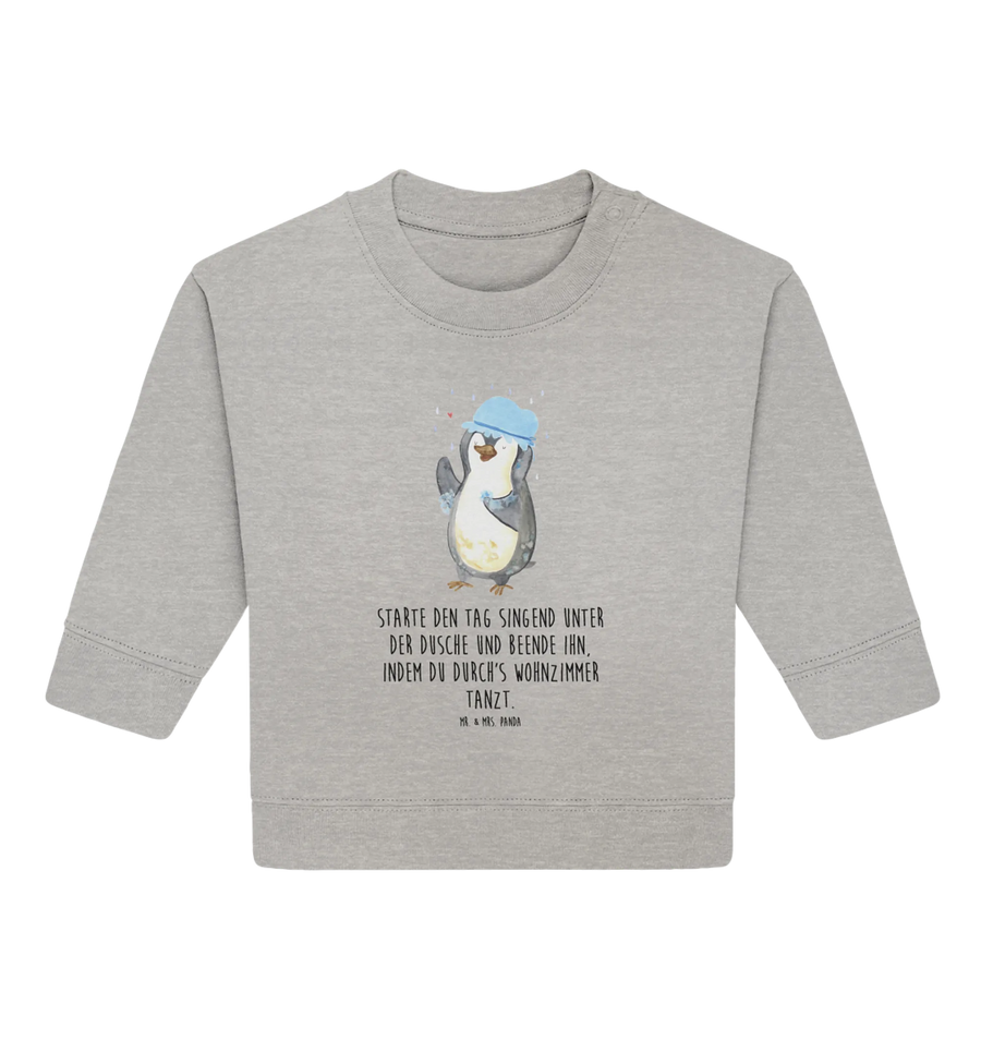 Der Organic Baby Pullover "Pinguin duscht" aus der bezaubernden Pinguin-Kollektion von Mr. & Mrs. Panda ist das perfekte Geschenk für kleine Wasserliebhaber! 🌧️ Der süße Pinguin hat es sich zur Aufgabe gemacht, jedem Kind ein Lächeln ins Gesicht zu zaubern – und genau das gelingt ihm mit seinem fröhlichen Dusch-Motiv!