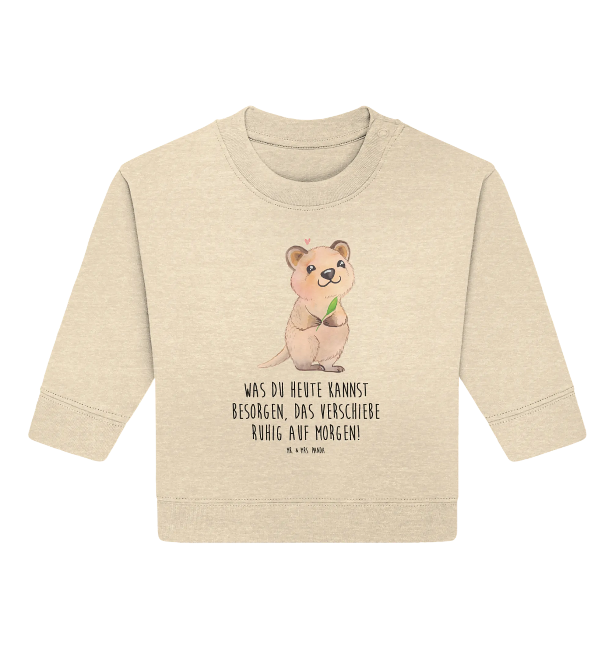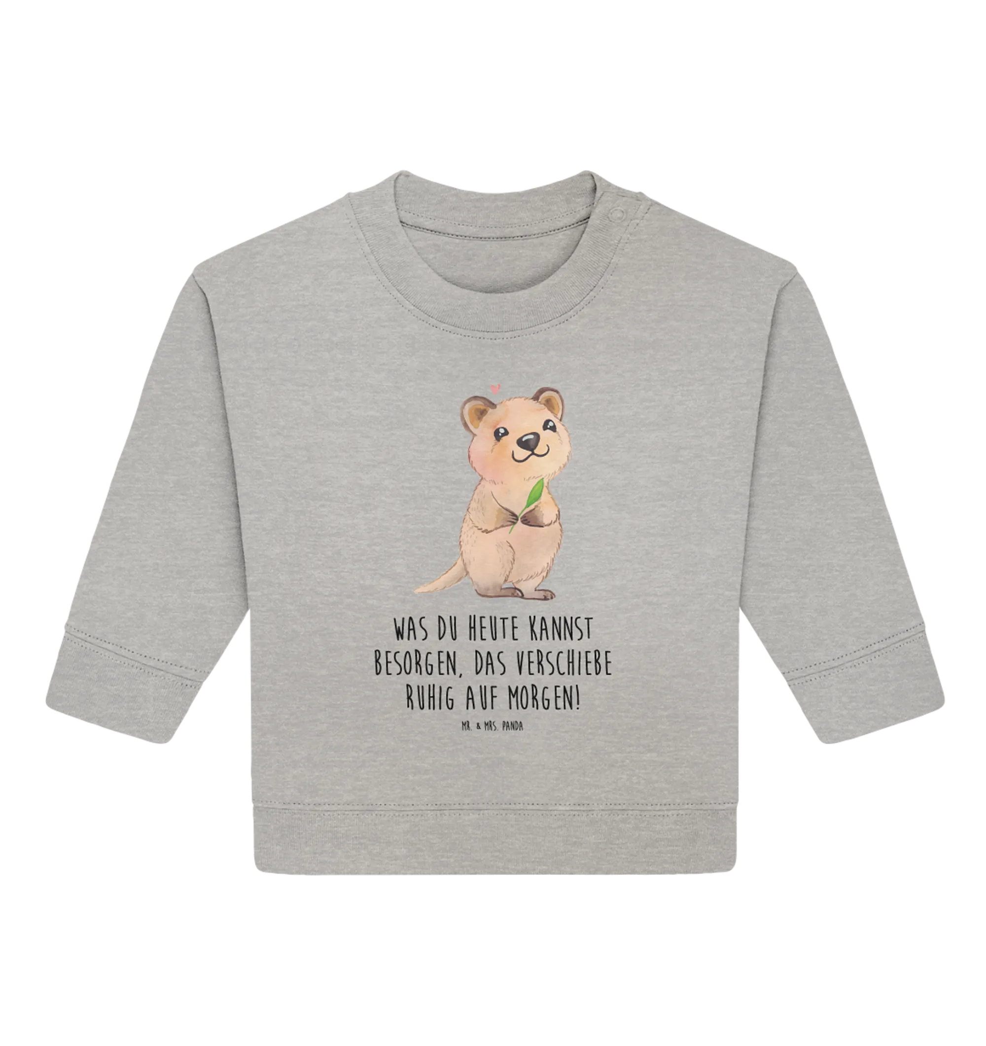 Auf dem Pullover leuchtet ein fröhliches Quokka, das mit einem freundlichen Lächeln und einem kleinen, rosa Herz über seinem Kopf einladend wirkt. Das Quokka bringt die Botschaft perfekt auf den Punkt: „Was du heute kannst besorgen, das verschiebe ruhig auf morgen!“ – ein Spruch, der schon den Kleinsten Humor und Lebensfreude lehrt.