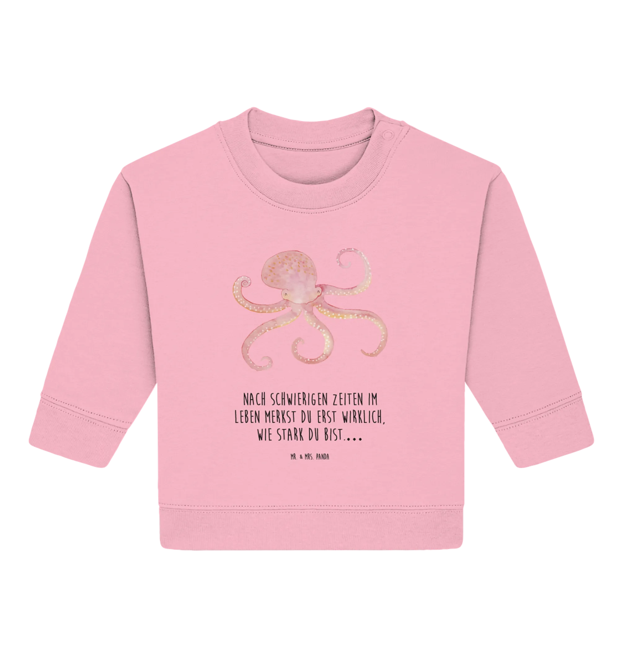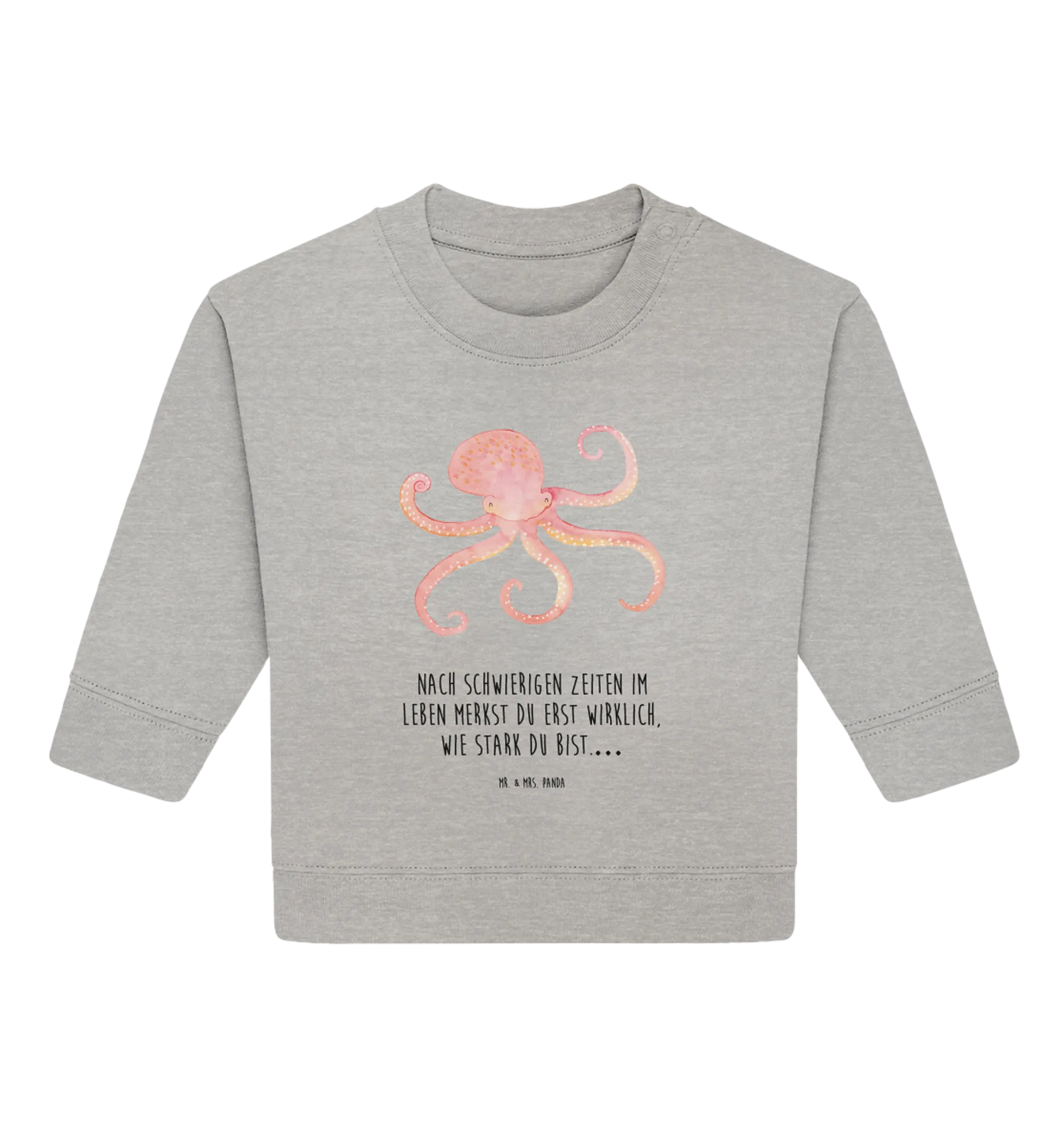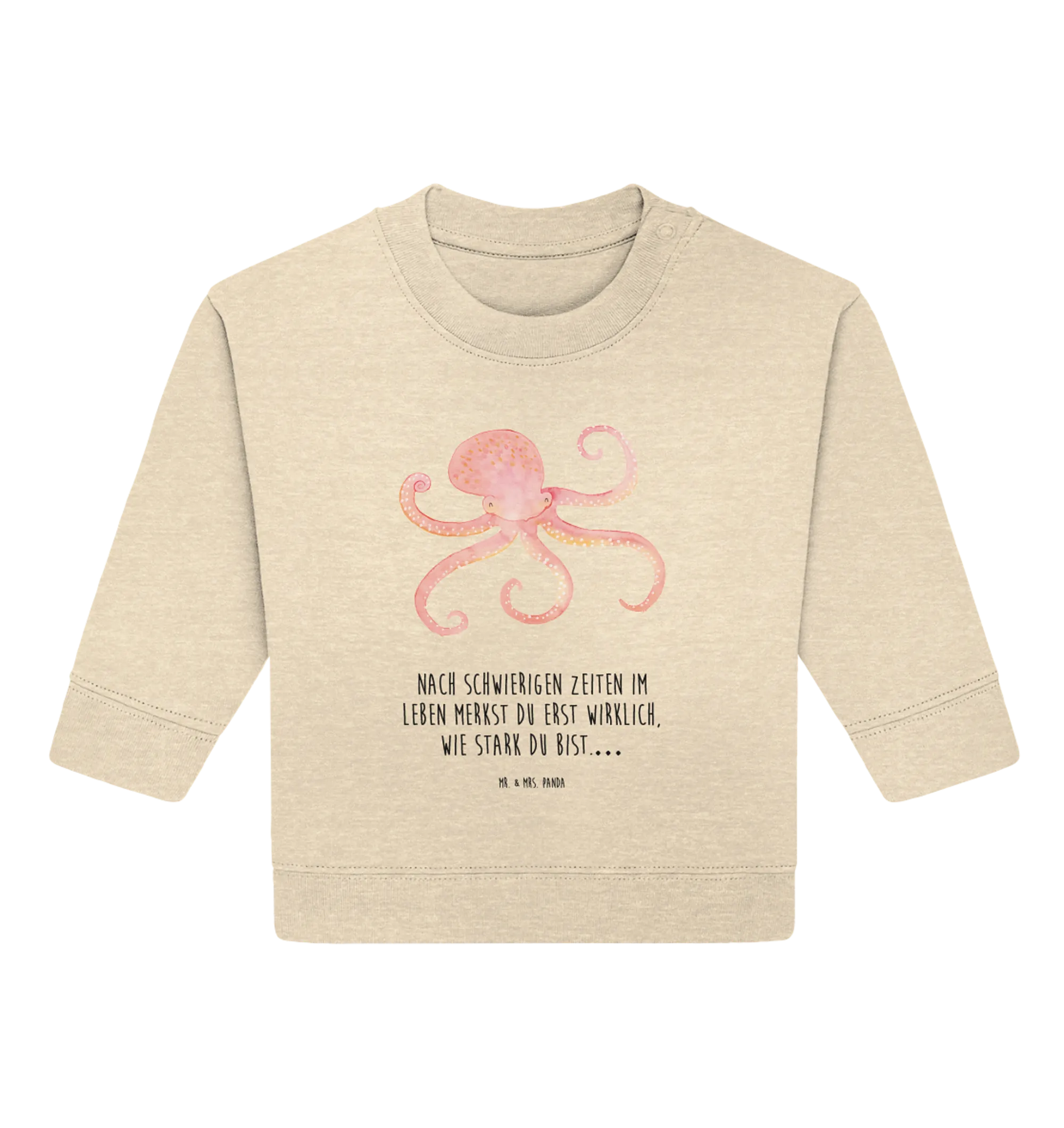 Außerdem eignet sich der Pullover mit dem Tintenfisch als niedliches Geschenk zur Geburt oder zu einem ersten Geburtstag. Immer wenn ein kleines Wunder das Licht der Welt erblickt, sind liebevolle Geschenke gefragt, die sowohl praktisch als auch schön sind. Der Baby Pullover mit dem Tintenfisch-Motiv ist hier genau das Richtige! Er zeigt, dass das kleine Wesen in der Welt nicht alleine ist. Der Slogan "Nach schwierigen Zeiten im Leben merkst du erst wirklich, wie stark du bist…" erinnert Eltern und Kinder daran, stark und optimistisch zu bleiben, ganz gleich welche Herausforderungen das Leben mit sich bringt.