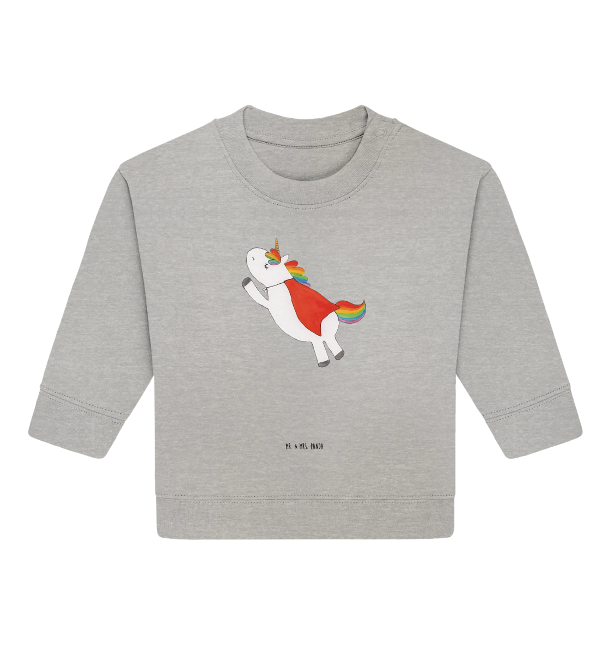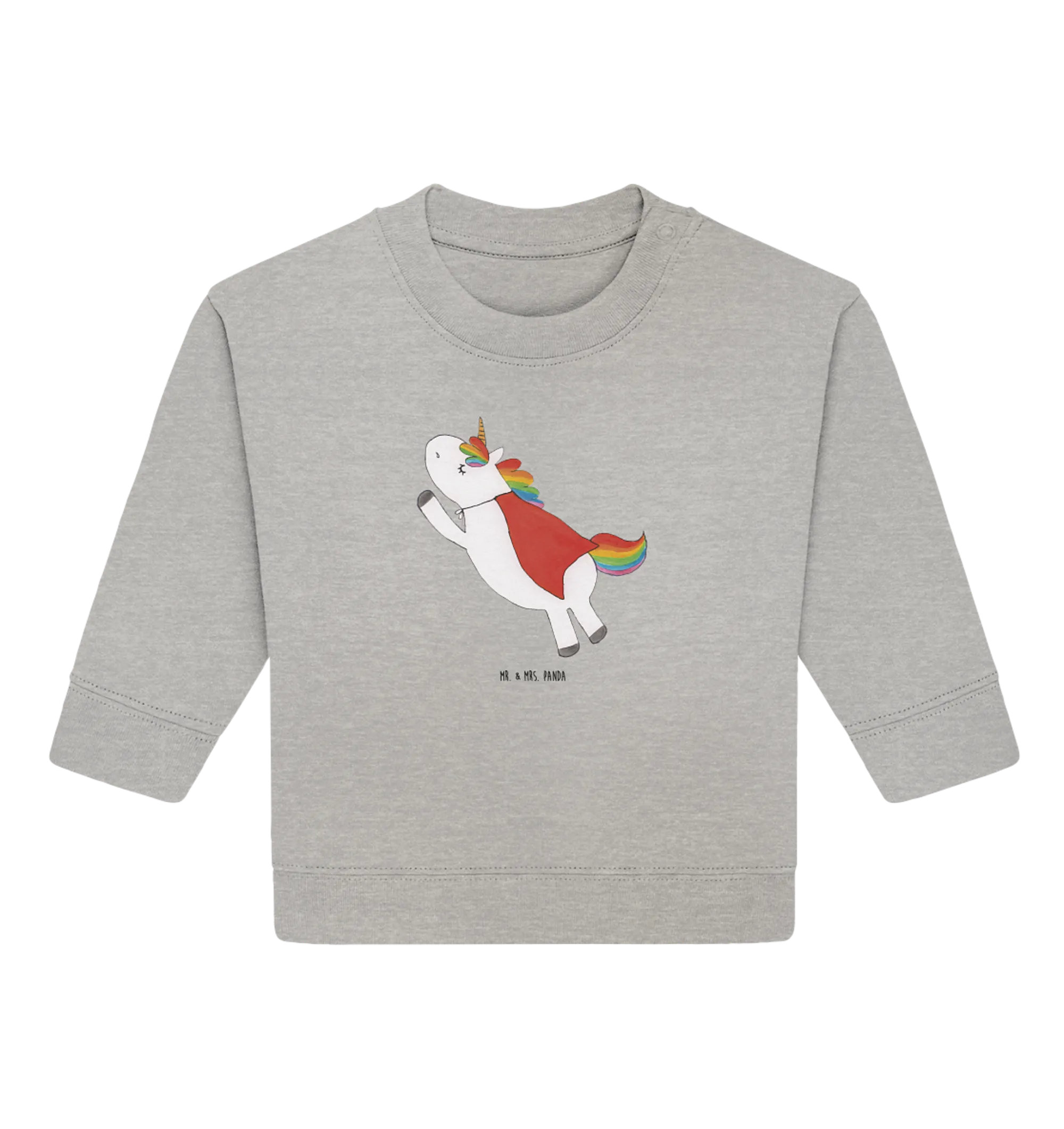 Additionally, being made from eco-friendly organic cotton means that you can feel good about your choice, knowing it’s gentle on the planet and on your baby’s skin. Each motif from the Unicorn - Collection is thoughtfully crafted and exudes love, making it a truly special addition to any baby’s wardrobe. With its heather grey background, this pullover not only keeps your baby looking fashionable, but also sets the stage for countless adventures filled with joy and laughter. Trust Mr. & Mrs. Panda to deliver quality, creativity, and heart in every piece we create. Get ready to dress your little unicorn hero in style and watch them shine!