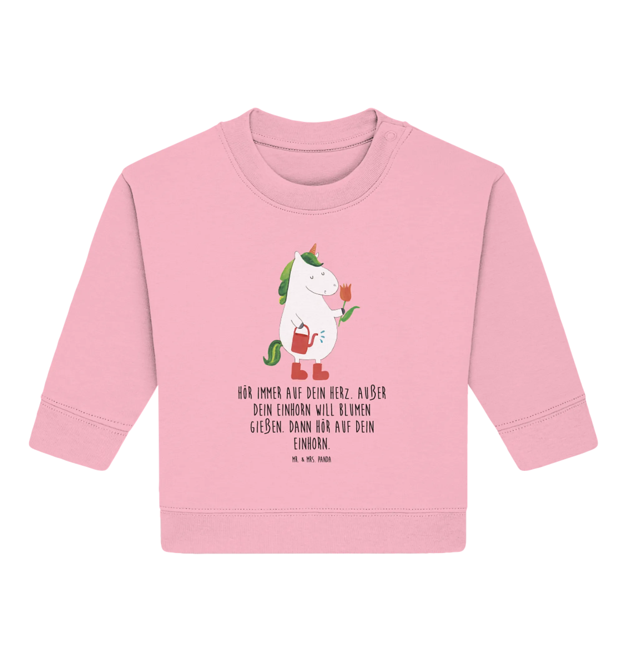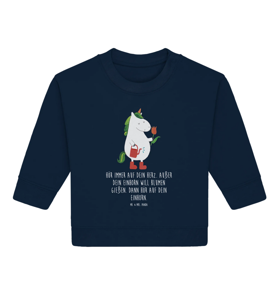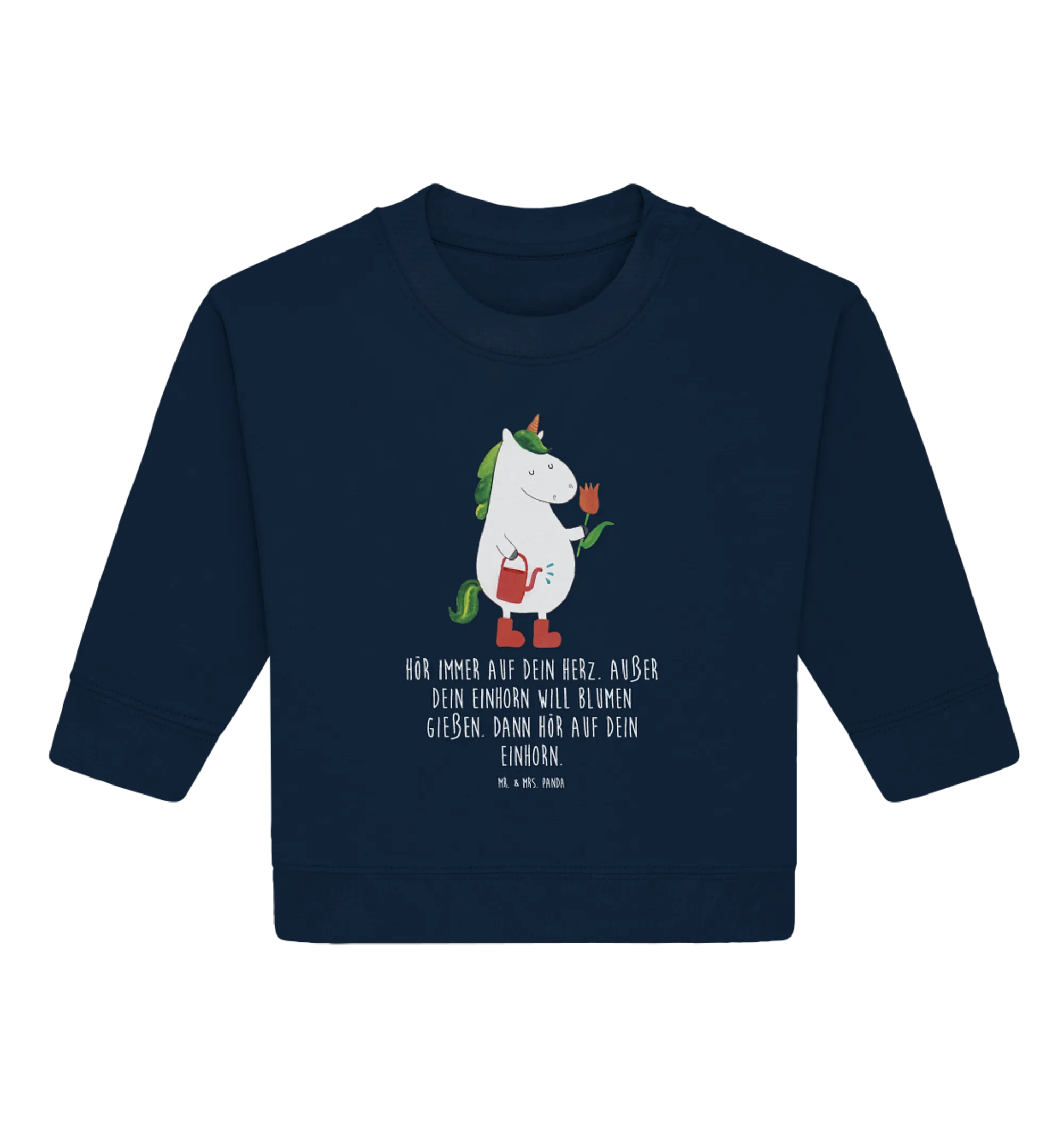 Gift this Organic Baby Pullover to new parents, grandparents, or anyone cherishing the little things in life. Not only does it make for a cute outfit, but it also serves as a reminder to always listen to our hearts, just like our fun slogan says: “Hör immer auf dein Herz. Außer dein Einhorn will Blumen gießen. Dann hör auf dein Einhorn.” This whimsical saying adds a delightful touch to an already special gift.