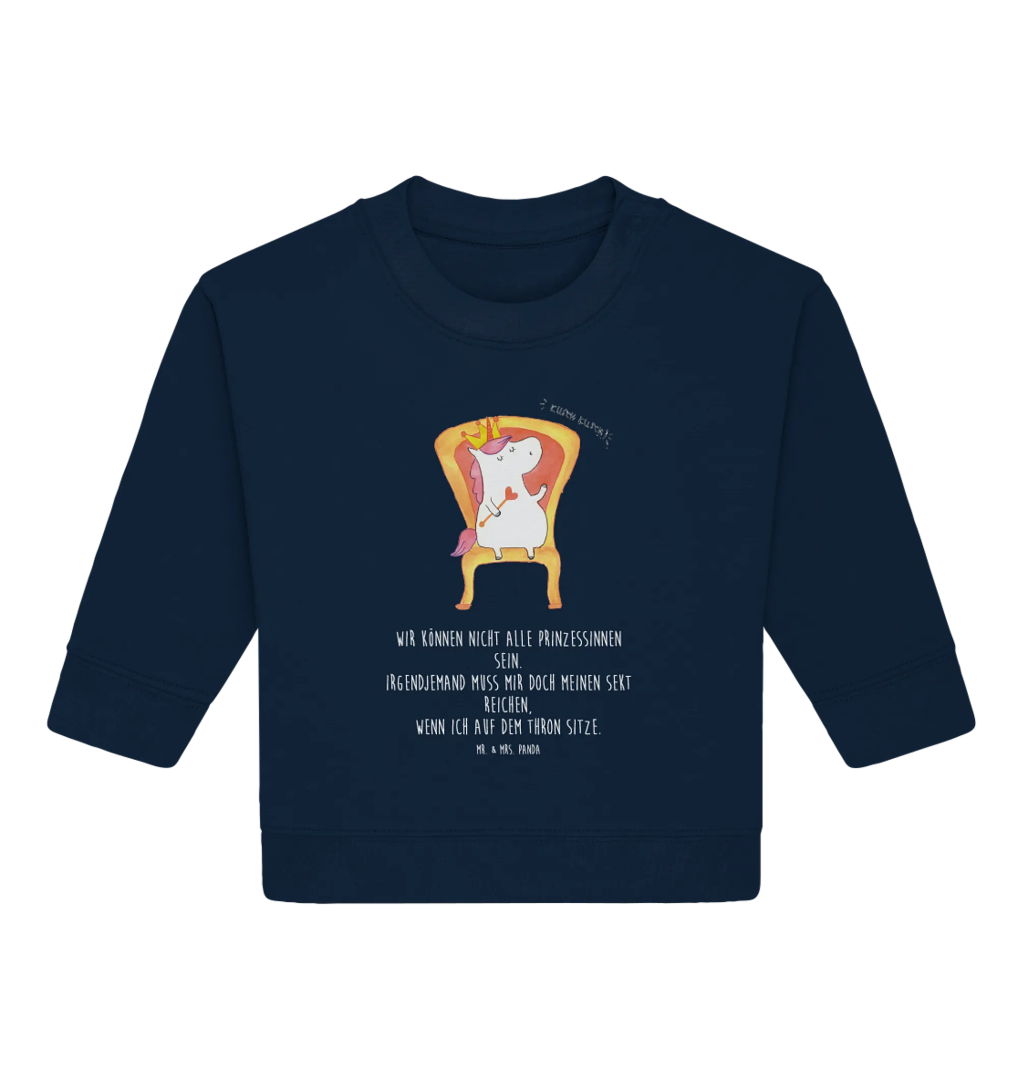 Ob zur Geburt, zur Taufe oder zu einem besonderen Anlass – dieser Pullover ist nicht nur ein modisches Highlight, sondern auch ein echtes Must-Have für alle Einhorn-Fans. Die Botschaft auf dem Pullover spricht jedes kleine Königskind an: "Wir können nicht alle Prinzessinnen sein. Irgendjemand muss mir doch meinen Sekt reichen, wenn ich auf dem Thron sitze." Ein Spruch, der jedes Kinderzimmer verzaubert und zum Schmunzeln bringt.