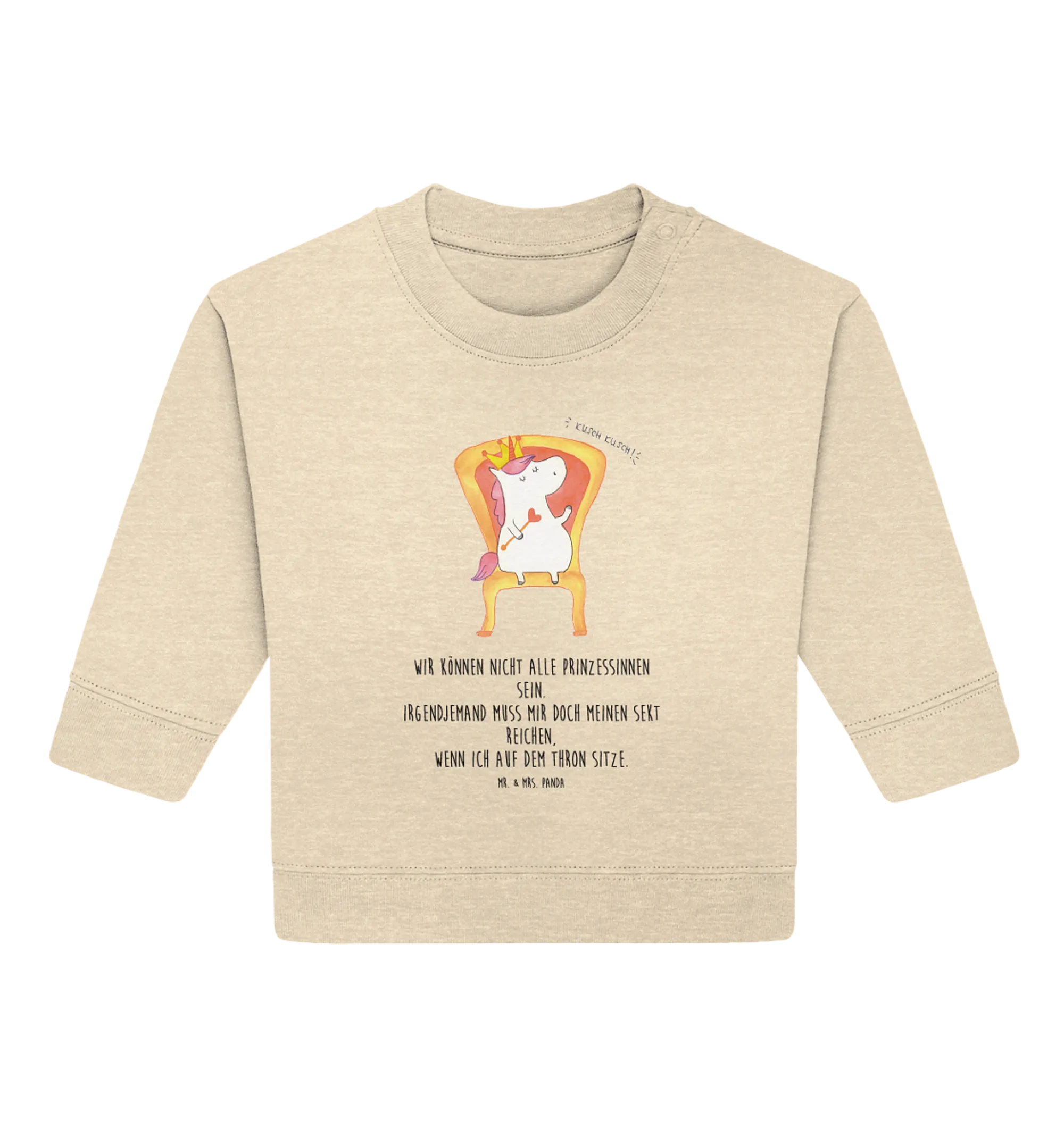 Der einzigartige Druck des Pullovers zeigt ein niedliches Einhorn auf einem Thron, das stolz mit einer glitzernden Krone auf dem Kopf thronen kann. Wer würde nicht gerne wie ein kleiner König oder eine kleine Prinzessin auftreten? Dieser Pullover zaubert jedem ein Lächeln ins Gesicht und ist perfekt für kleine Einhorn-Fans. Die zauberhafte Illustration von Mrs. Panda bringt die magische Welt der Einhörner direkt in den Kleiderschrank deines Babys.