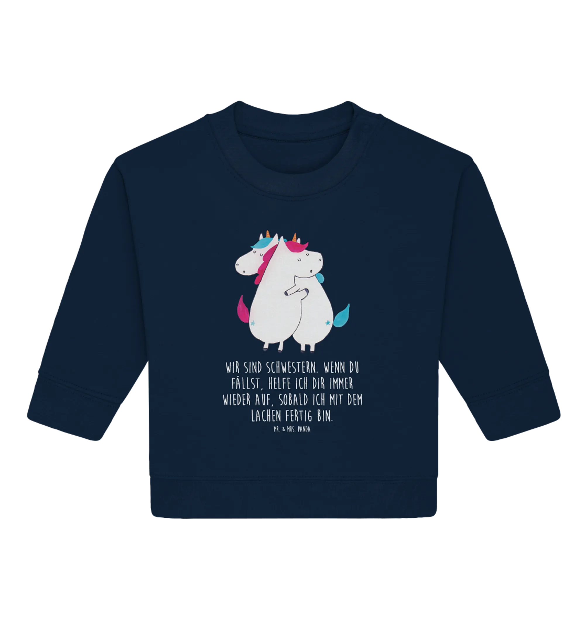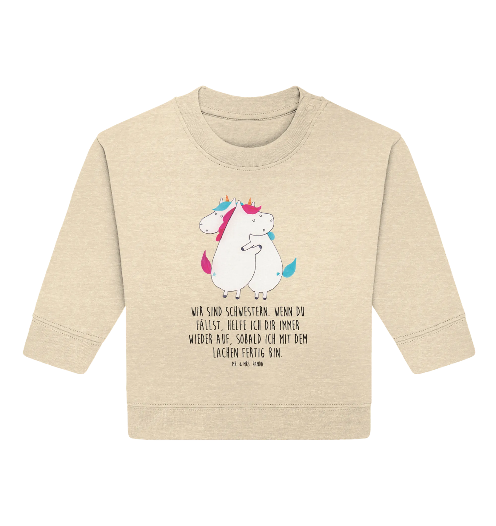 What makes this baby sweatshirt an especially thoughtful gift? It’s perfect for sisters celebrating their bond! Whether it’s for a birthday, baby shower, or just a surprise to show them how much you care, this pullover speaks volumes about sibling love and friendship. After all, what’s better than sharing cute clothes and adorable moments? With the sentiment "Wir sind Schwestern. Wenn du fällst, helfe ich dir immer wieder auf, sobald ich mit dem Lachen fertig bin" (translated: "We are sisters. If you fall, I will help you up again as soon as I am done laughing."), the Unicorns Hug design captures not just the cuteness but also a sense of playful camaraderie that sisters naturally share.