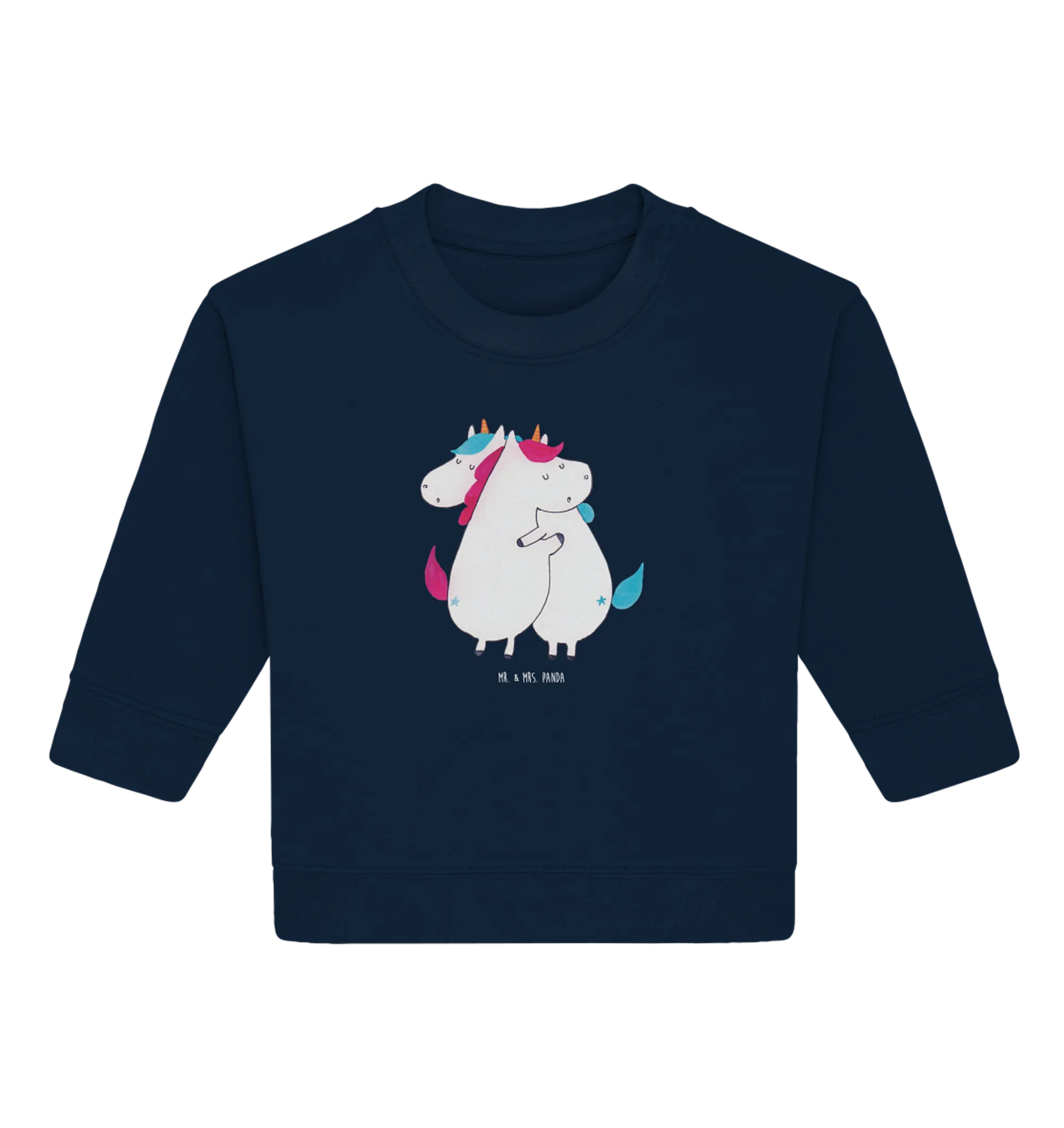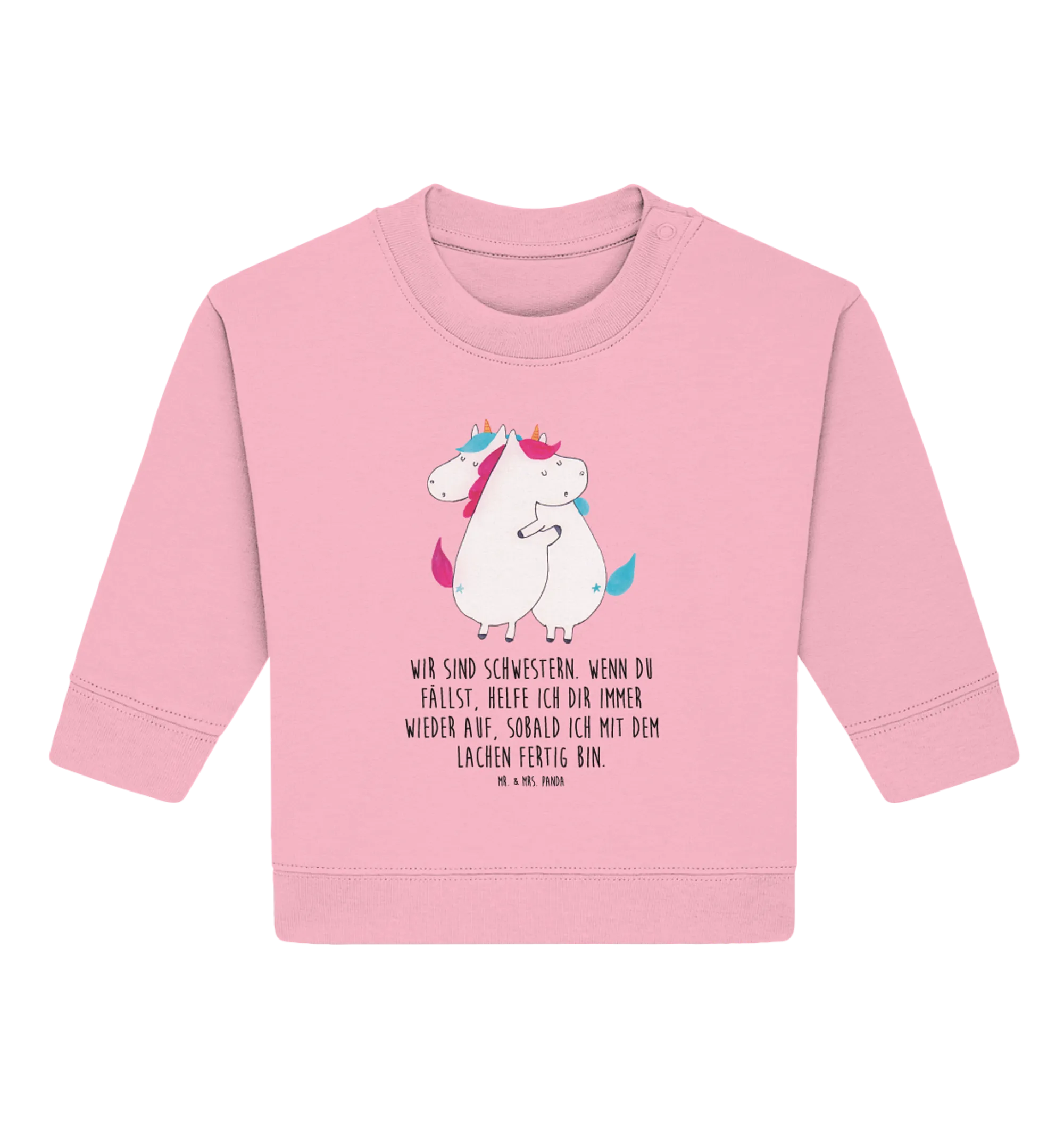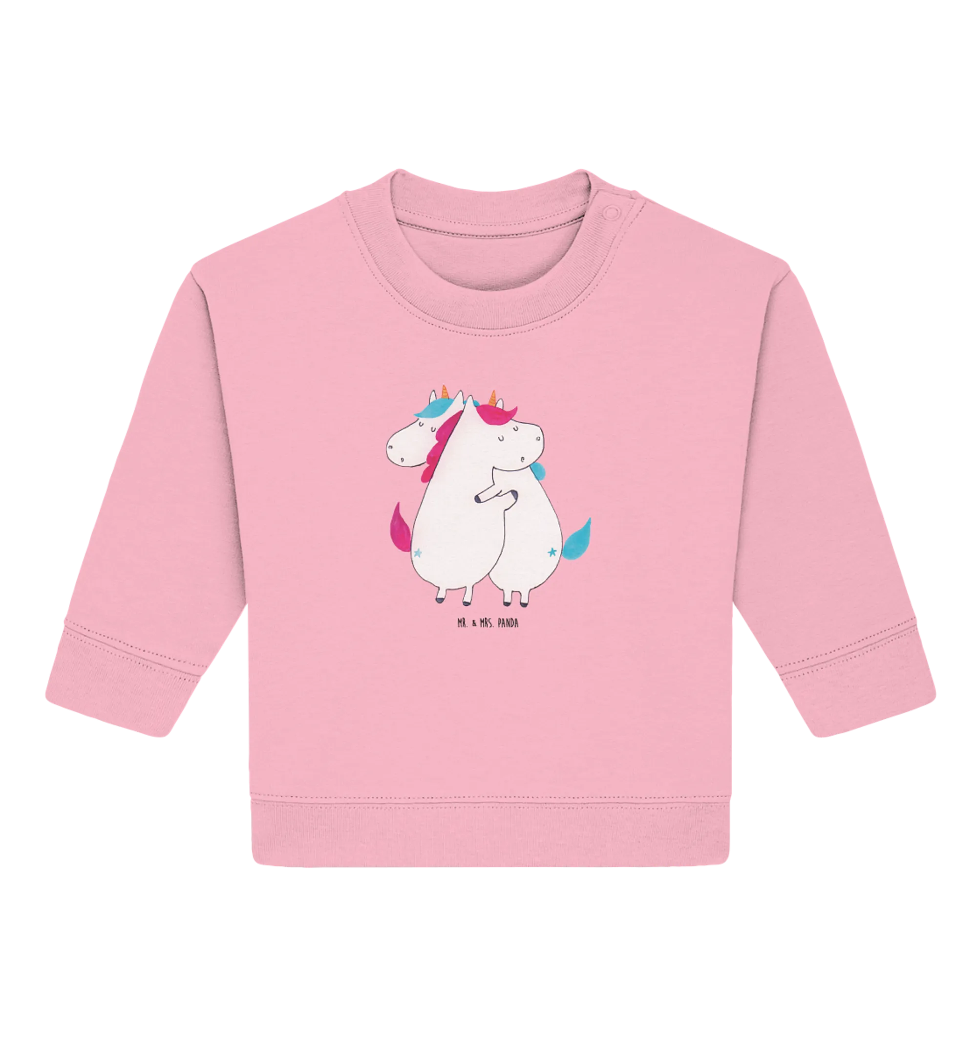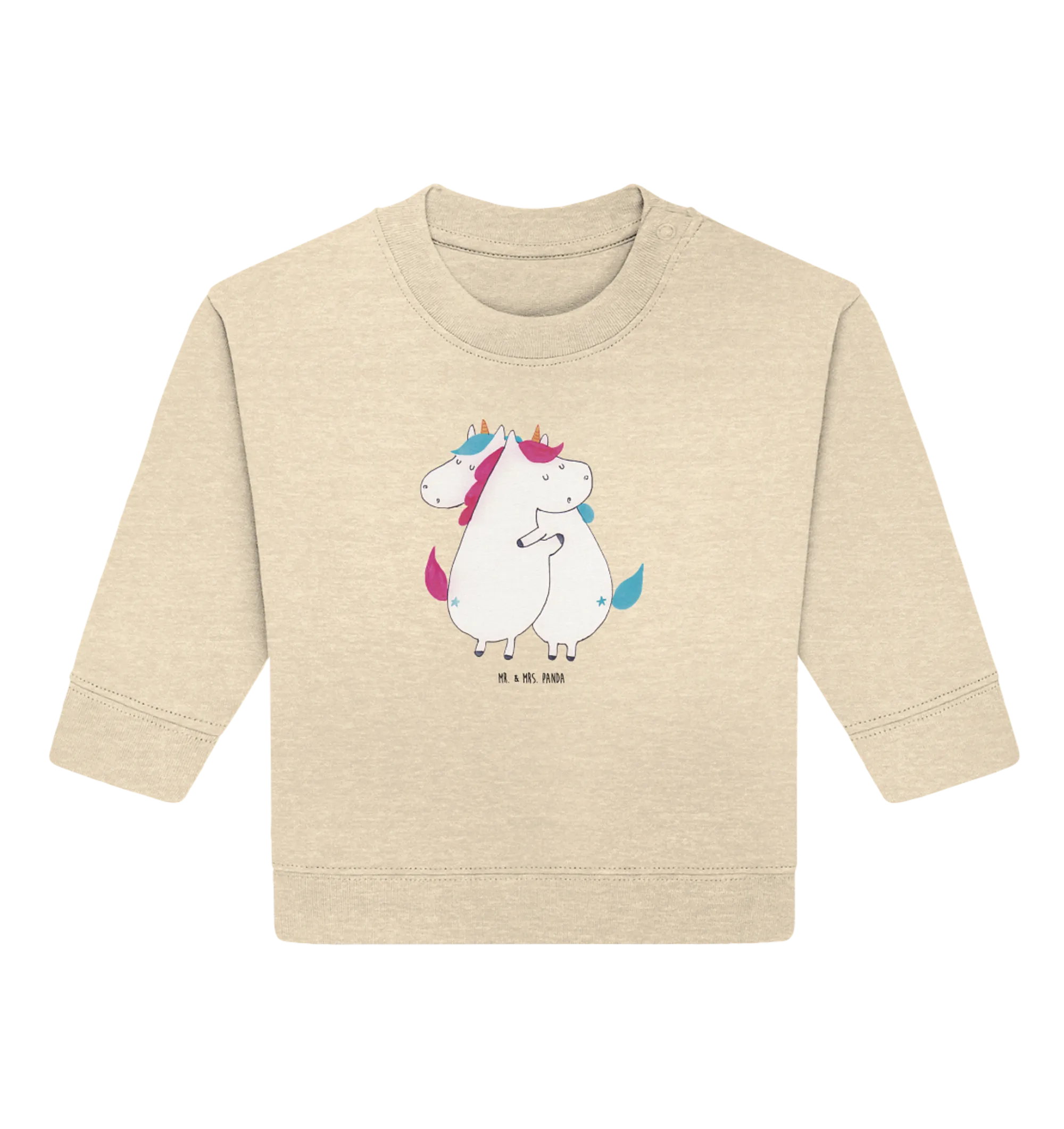 The design showcases two adorable unicorns wrapped in a loving hug, symbolizing friendship, support, and sibling love. Each unicorn motif is hand-drawn with love by Mrs. Panda herself, ensuring that every piece is unique and filled with colorful charm. Crafted from organic cotton, this baby pullover is not only soft and cozy for your little one but also gentle on the planet – a gift that keeps on giving!