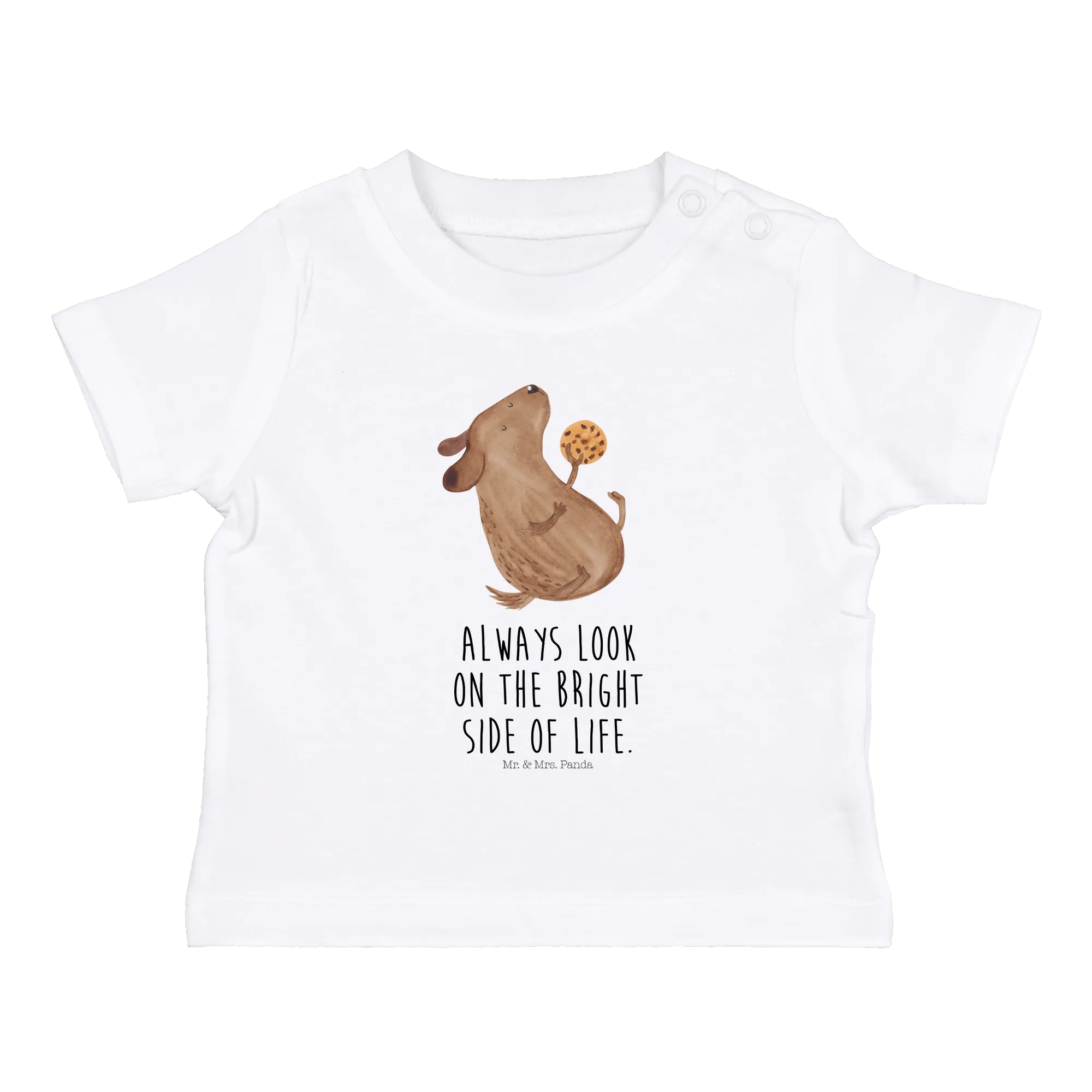 With sizes tailored for babies aged 6 to 12 months, the shirt fits snugly while allowing freedom of movement for those busy little hands. The charming design showcases a sweet dog enjoying a tasty biscuit, sure to bring smiles to every face. Every detail, from the soft fabric to the playful print, has been crafted with love by Mr. & Mrs. Panda.