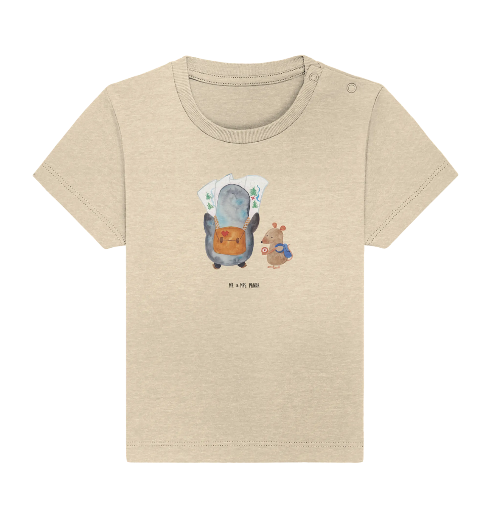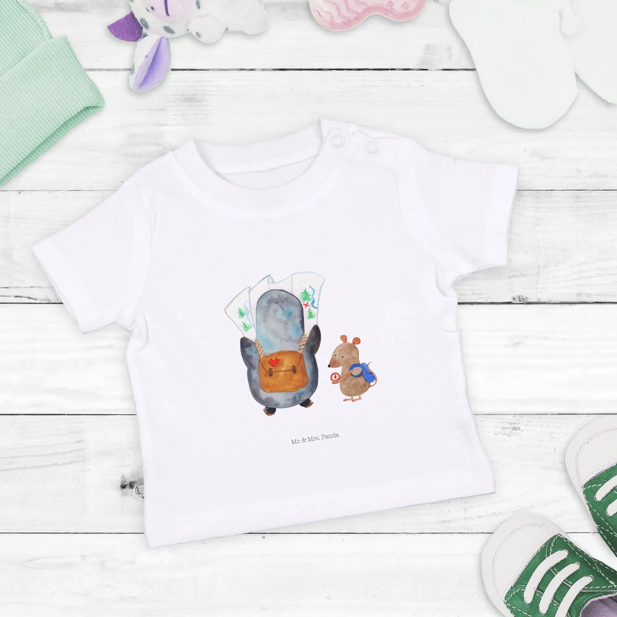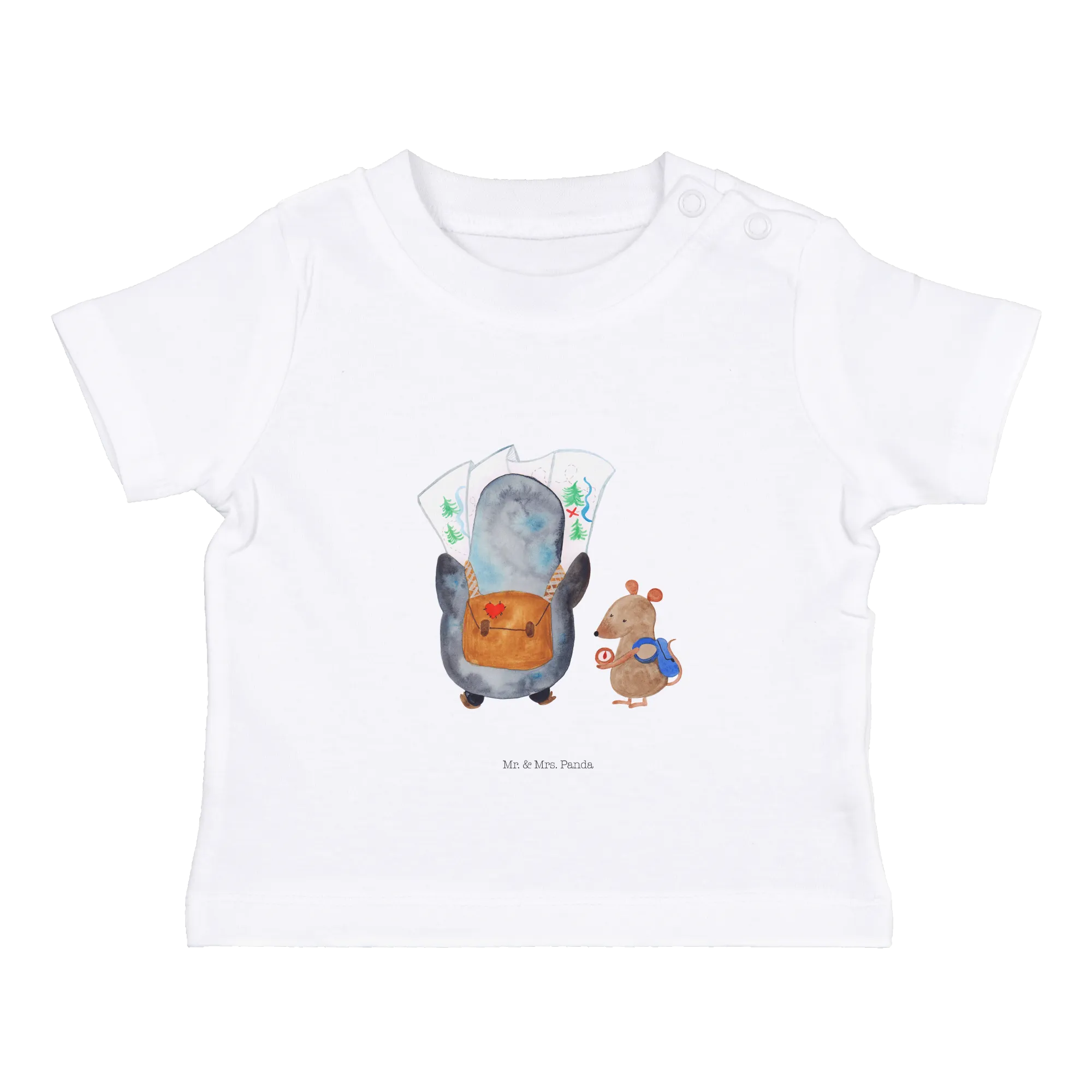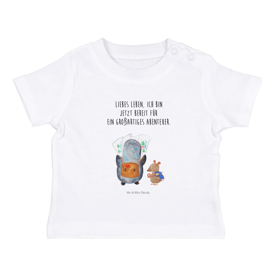 Crafted from soft, eco-friendly cotton, this baby t-shirt ensures that your little one feels comfortable while looking absolutely delightful. The unique design showcases a curious penguin peering at a detailed map while a clever mouse checks the compass, symbolizing exploration, adventure, and wanderlust! This hand-drawn masterpiece by Mr. & Mrs. Panda adds a touch of charm that is truly special.