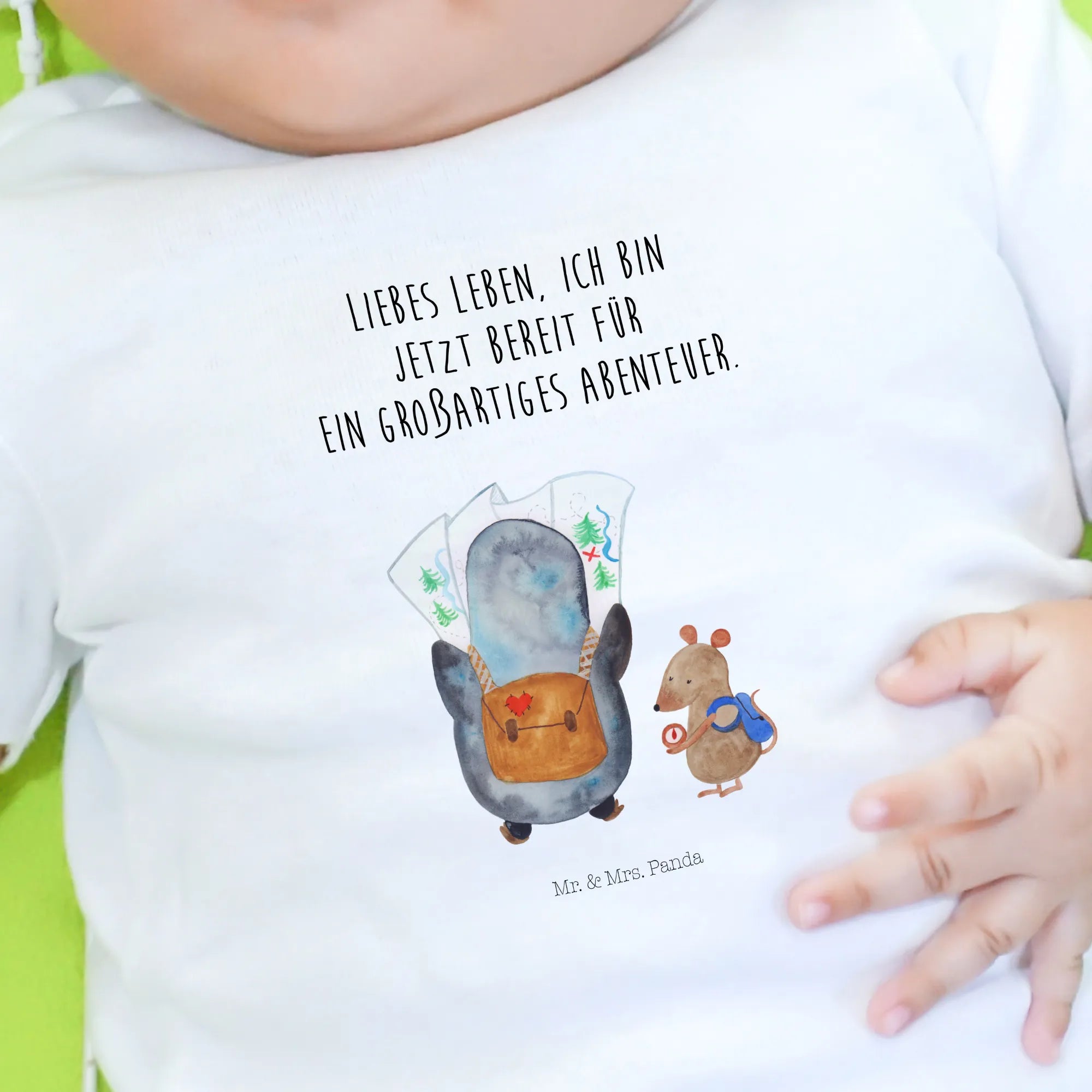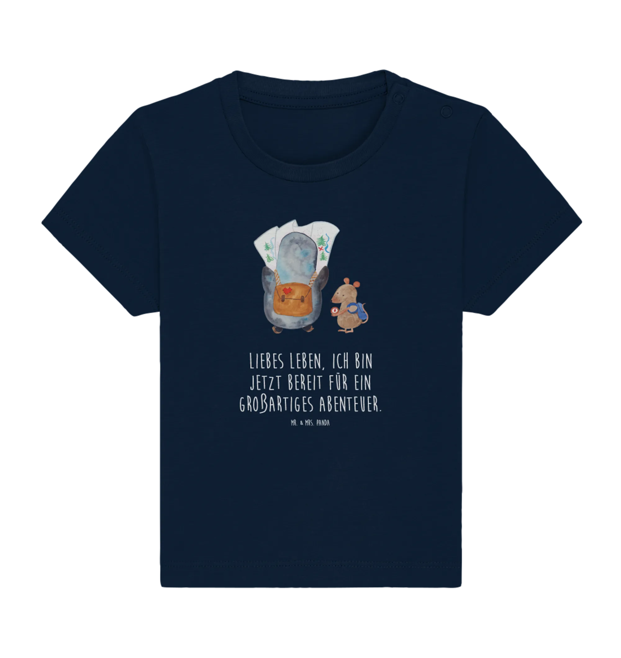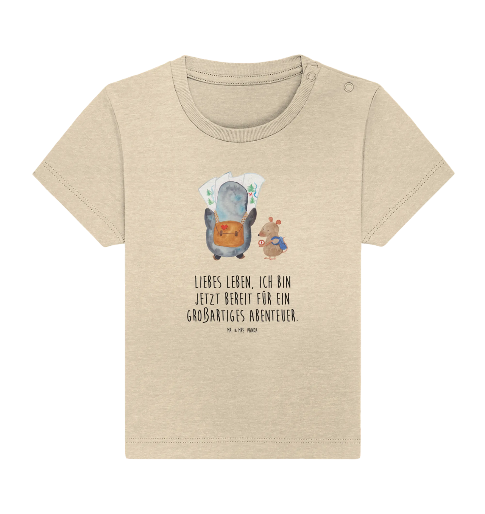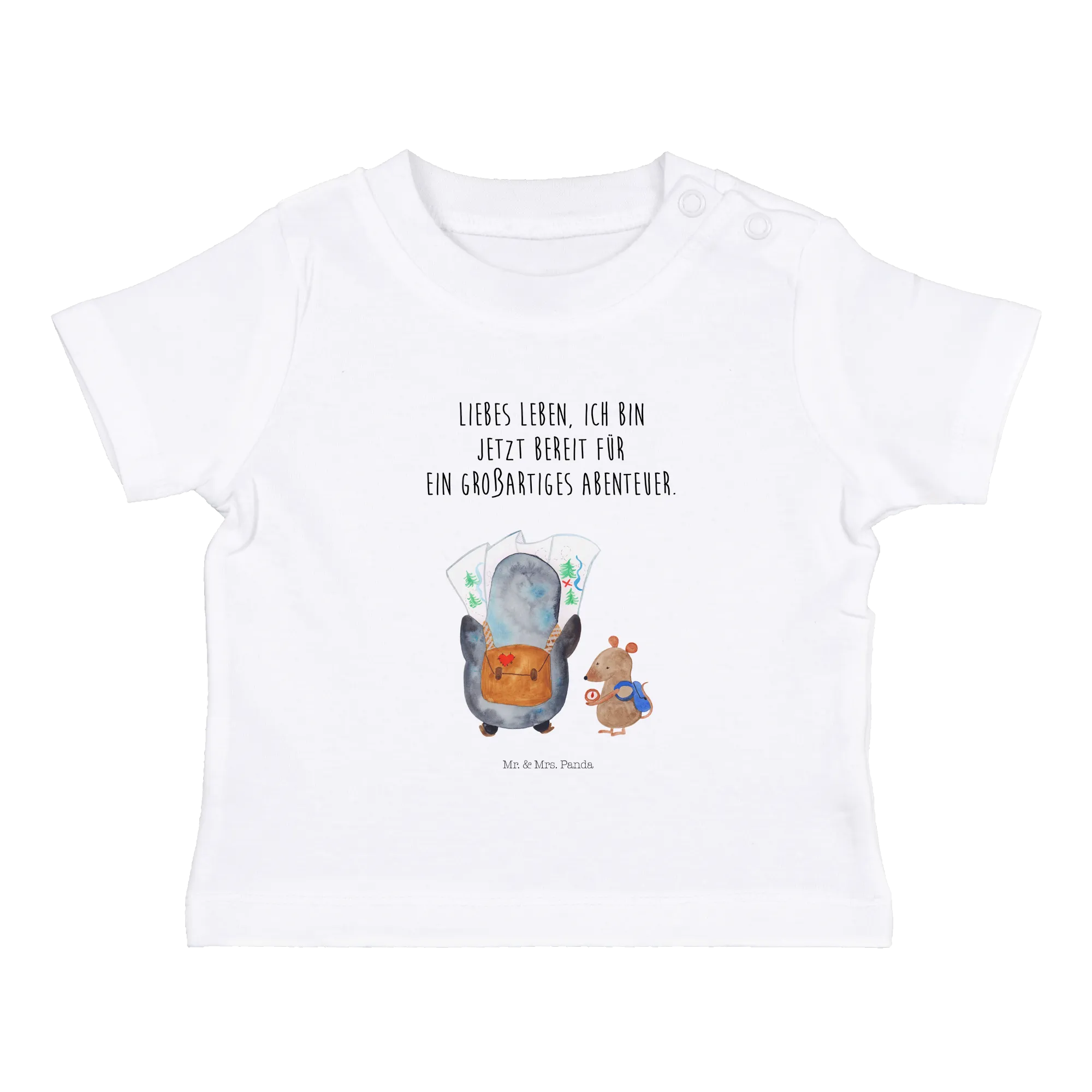 Crafted from soft, eco-friendly cotton, this baby t-shirt ensures that your little one feels comfortable while looking absolutely delightful. The unique design showcases a curious penguin peering at a detailed map while a clever mouse checks the compass, symbolizing exploration, adventure, and wanderlust! This hand-drawn masterpiece by Mr. & Mrs. Panda adds a touch of charm that is truly special.