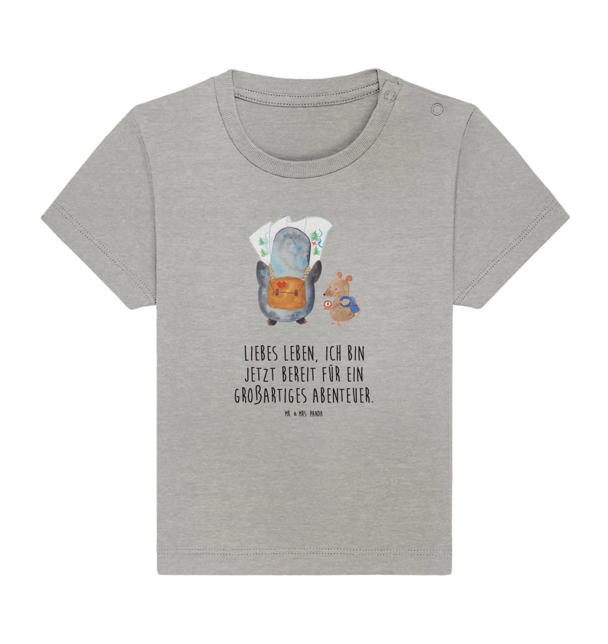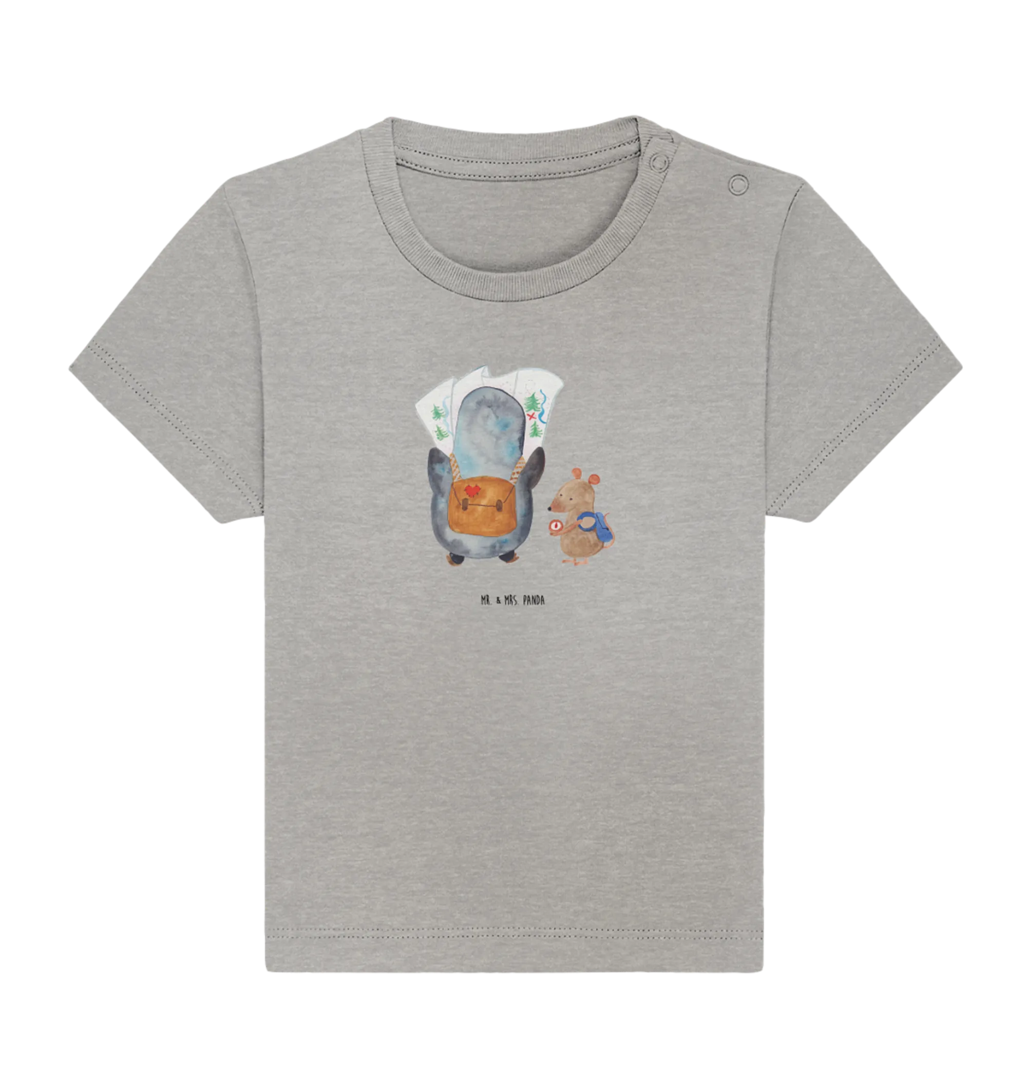 Imagine dressing your little explorer in this snuggly 100% organic cotton baby shirt, sized perfectly for ages 12 to 18 months. The lovely heather grey background sets the stage for the hand-drawn illustration of a cute penguin gazing curiously at a detailed map while a clever mouse checks the compass. What a heartwarming design! This shirt inspires children to look forward to their first hikes and road trips, instilling a sense of wanderlust and adventure from an early age.