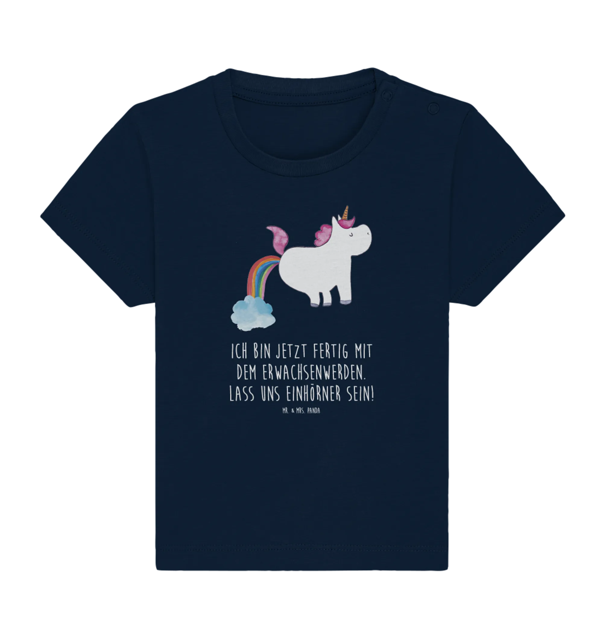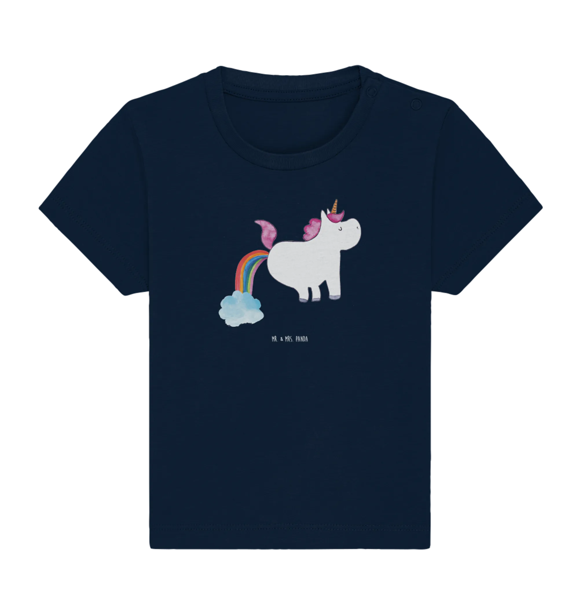 Adorned in a beautiful French Navy background, this ethical and stylish shirt showcases a unique watercolor illustration, crafted with love by Mrs. Panda in Hanover, Germany. Each clothing item from the Unicorn - Collection is made with care, ensuring that your baby not only looks good but feels good too!