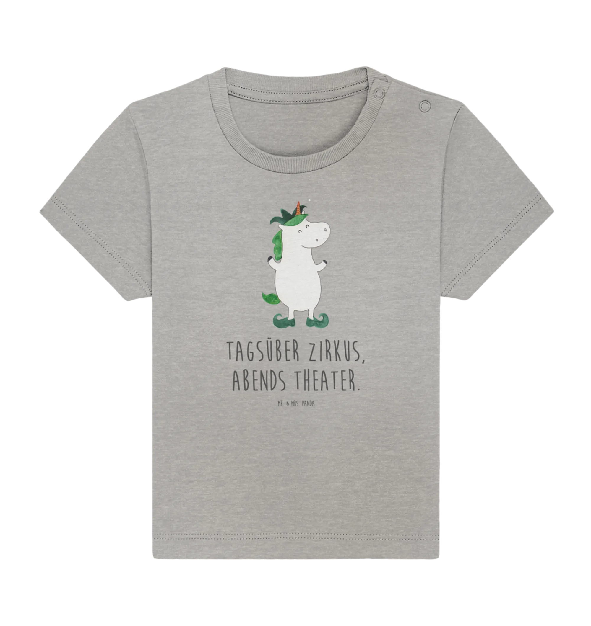 Every motif by Mr. & Mrs. Panda is hand-drawn with love in Hanover, Germany. The design showcases a cute unicorn dressed as a jester, playfully juggling in a delightful portrait style that captivates hearts. Plus, our shirts come in a soothing Heather Grey, perfect for any little adventurer!