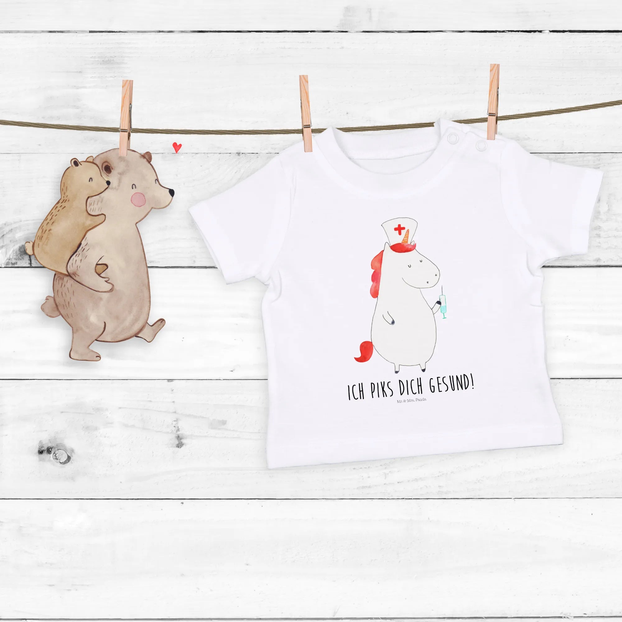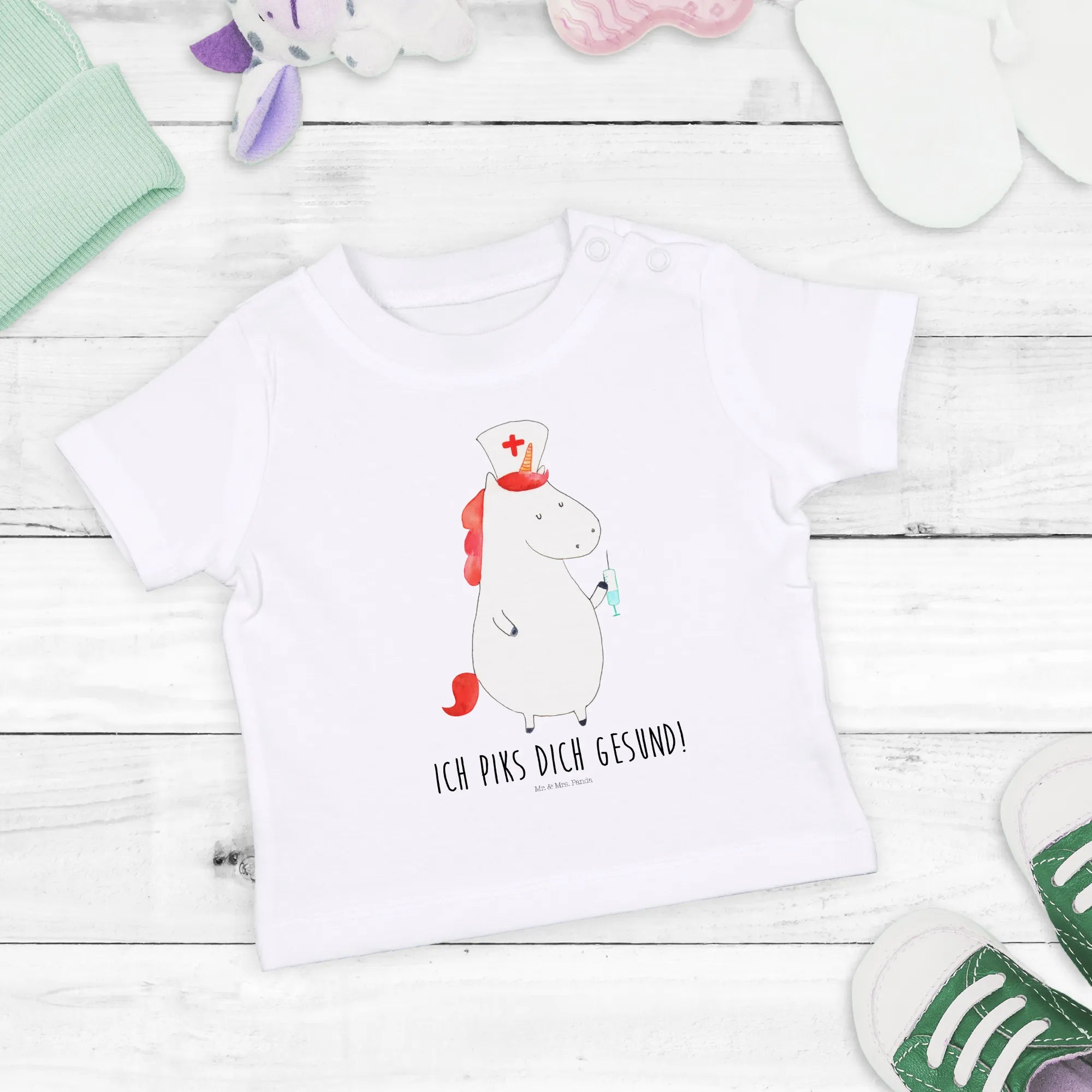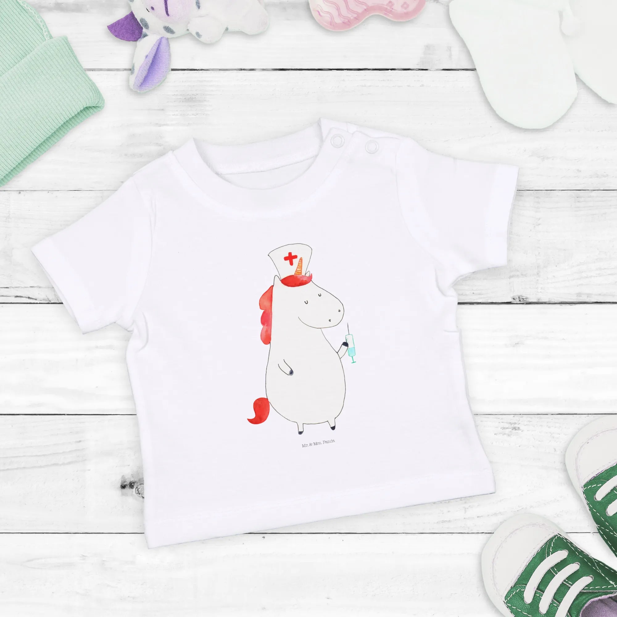 Introducing the charming Organic Baby Shirt Unicorn Nurse from the delightful Unicorn Collection by Mr. & Mrs. Panda! This adorable shirt features a whimsical unicorn in a nurse's outfit, perfect for your little one or as a heartwarming gift for new parents. Made from 100% organic cotton, this shirt is not only soft and gentle on your baby's skin but also eco-friendly, making it a wonderful choice for environmentally conscious families.