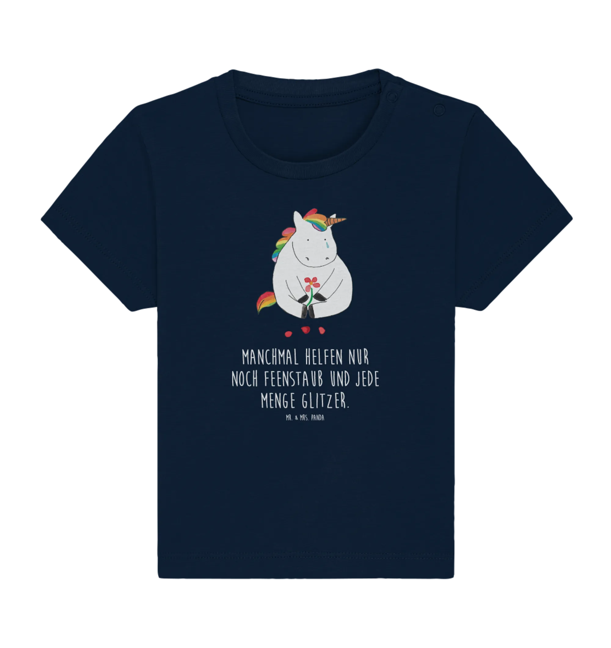 Made from organic cotton, this baby shirt is gentle on delicate skin, making it the perfect gift for newborns, infants, and toddlers aged 0 to 6 months. Whether you’re celebrating a new arrival, a baby shower, or just looking to sprinkle a bit of magic into a baby’s wardrobe, this shirt speaks volumes. The adorable Unicorn Sad motif is a reminder that while there may be moments of sadness, they are often accompanied by glitter and fairy dust—just like our slogan says, 'Manchmal helfen nur noch Feenstaub und jede Menge Glitzer.'