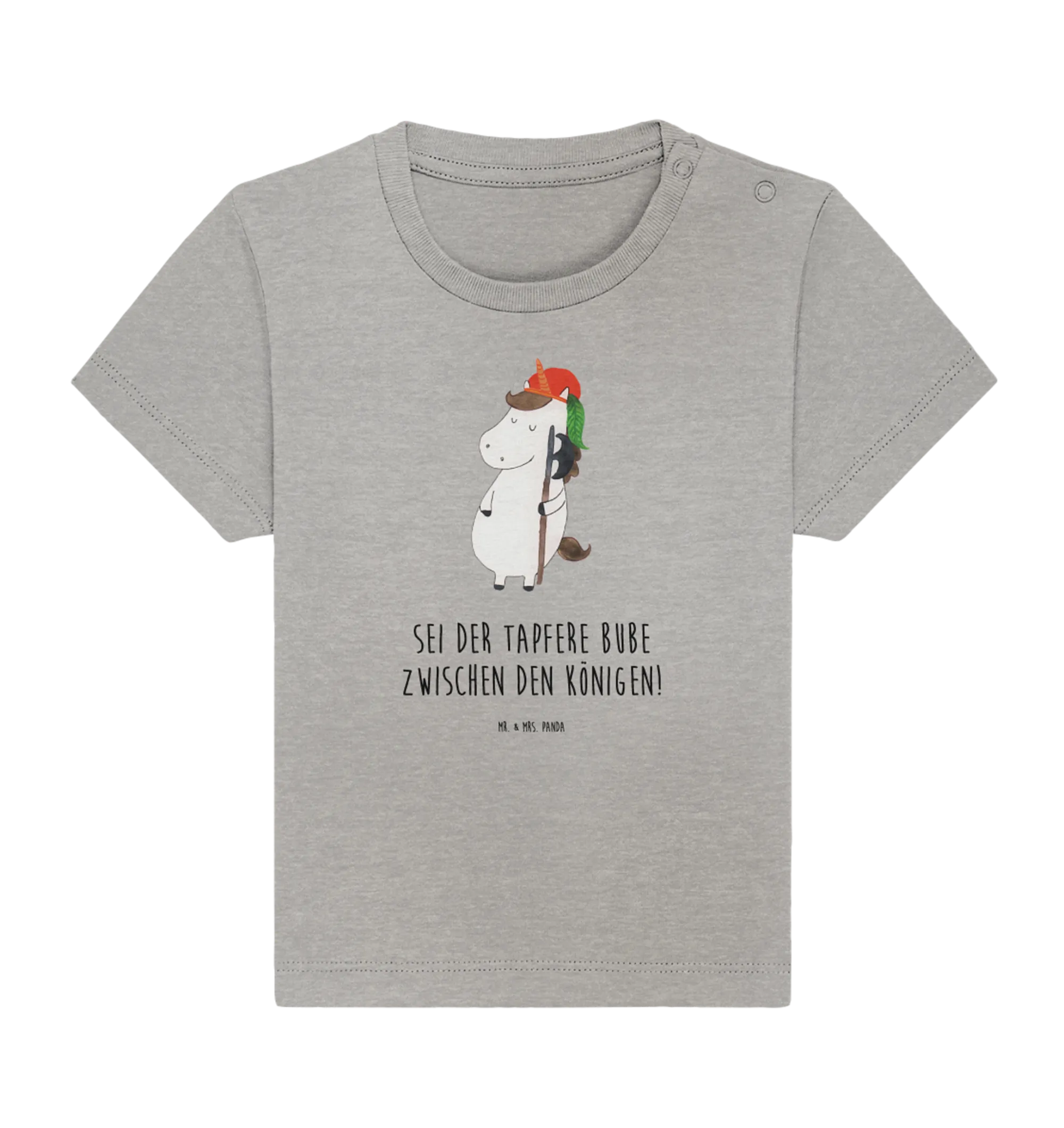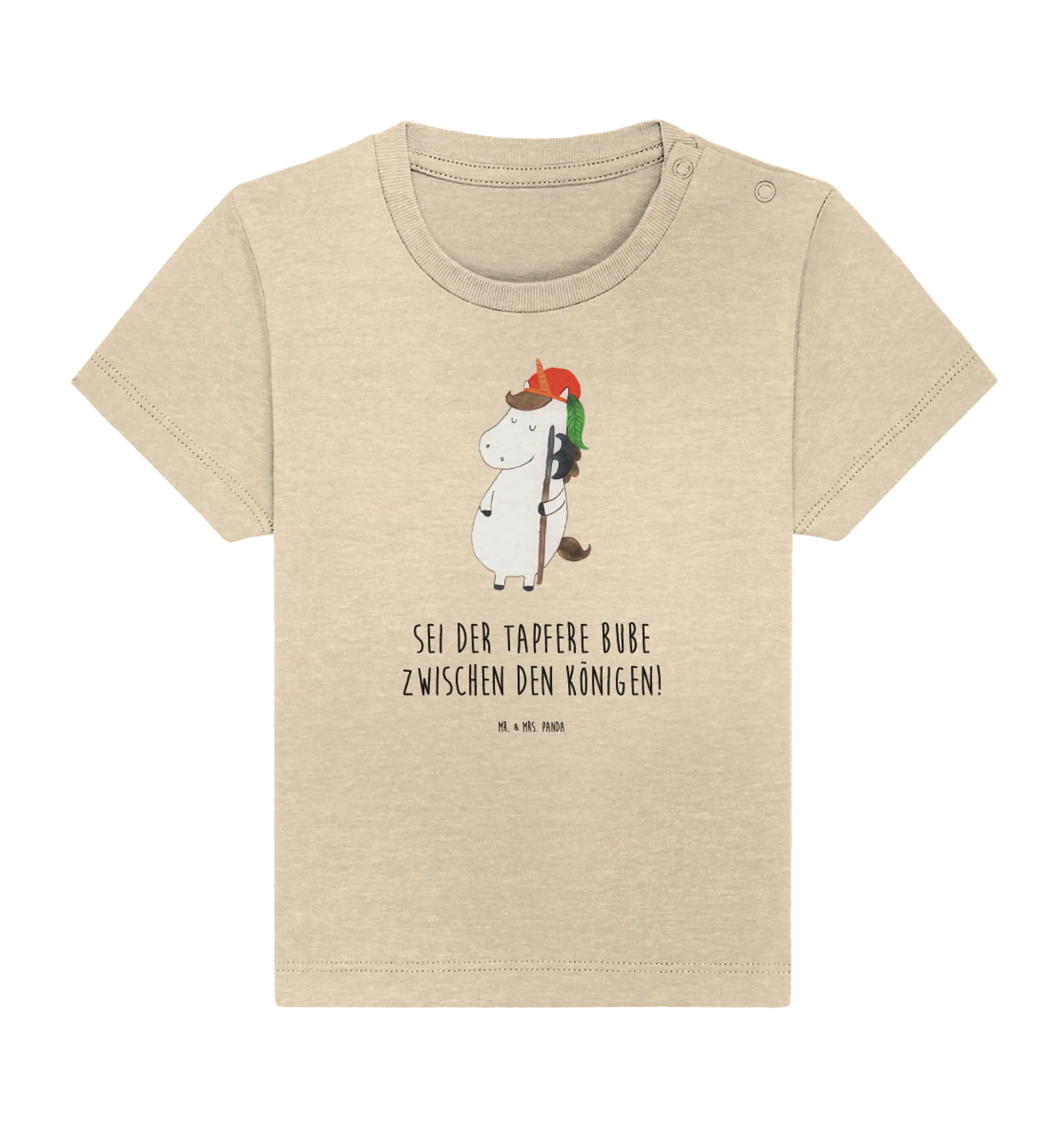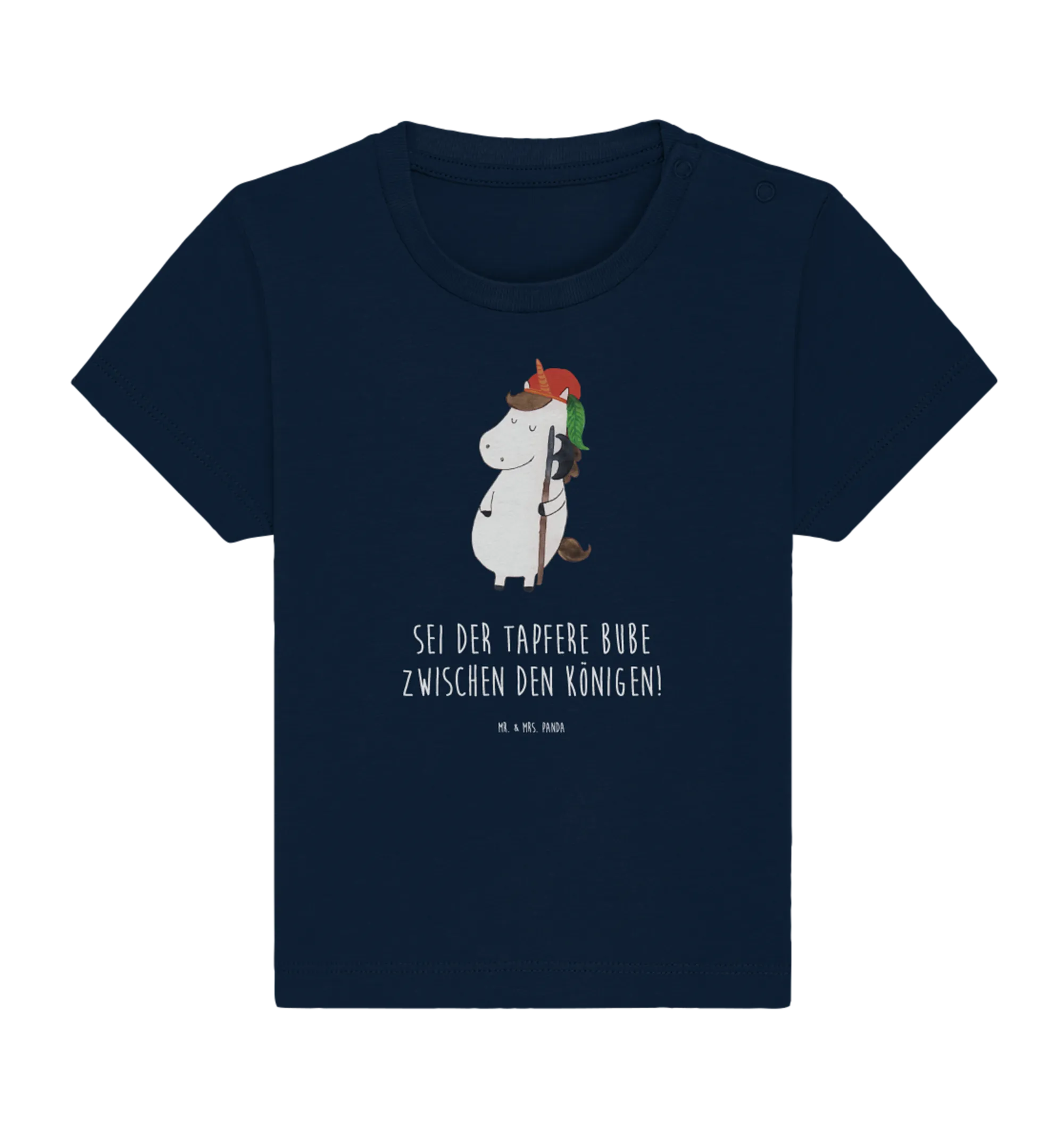 As part of the exclusive Unicorn Collection by Mr. & Mrs. Panda, this shirt represents artisanal quality and style. Each design is hand-drawn with love, ensuring that your baby is not only dressed in a unique piece of art but also feels comfortable throughout the day. This collection aims to inspire joy, courage, and creativity in every little one wearing it, with the slogan "Sei der tapfere Bube zwischen den Königen!" inspiring your child to be the brave little hero among friends.