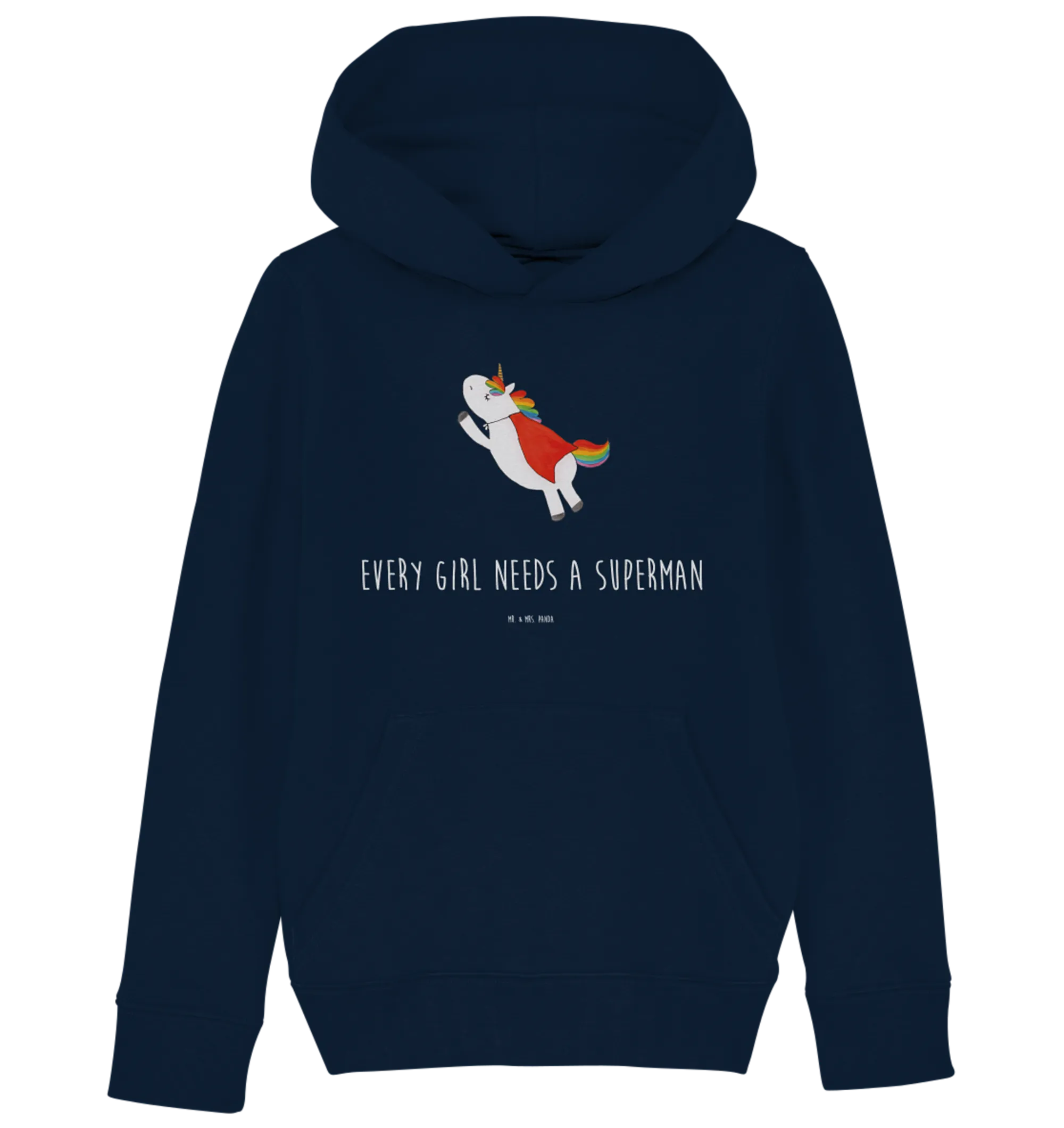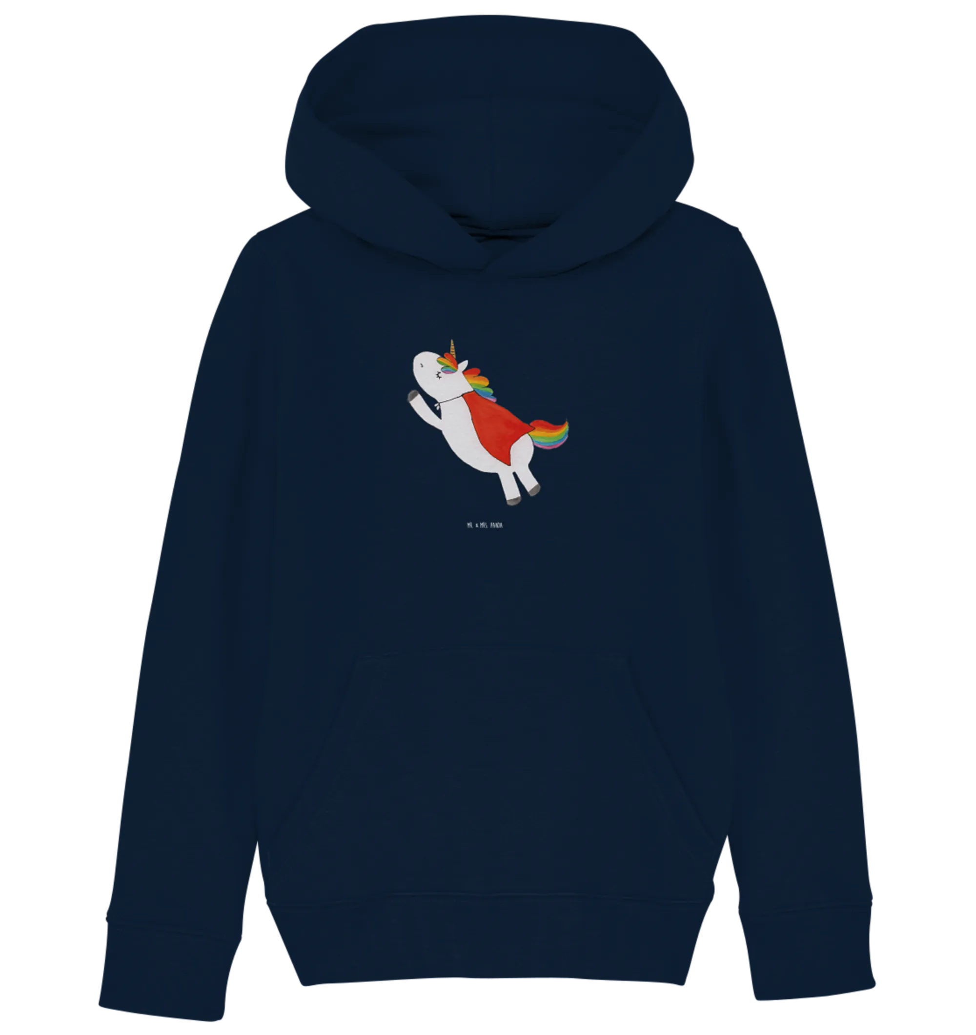 Made from soft, organic cotton, this hoodie is not just stylish; it's also environmentally friendly, ensuring that your child feels comfortable while looking adorable. The fabric is gentle on the skin, making it suitable for all-day wear, whether she’s at school, playing with friends, or snuggling up at home. The French Navy color serves as a beautiful backdrop for the enchanting unicorn design, which has been lovingly hand-drawn by Mrs. Panda. Each hoodie is a testament to creativity, with vibrant colors and intricate details that make this piece a work of art.