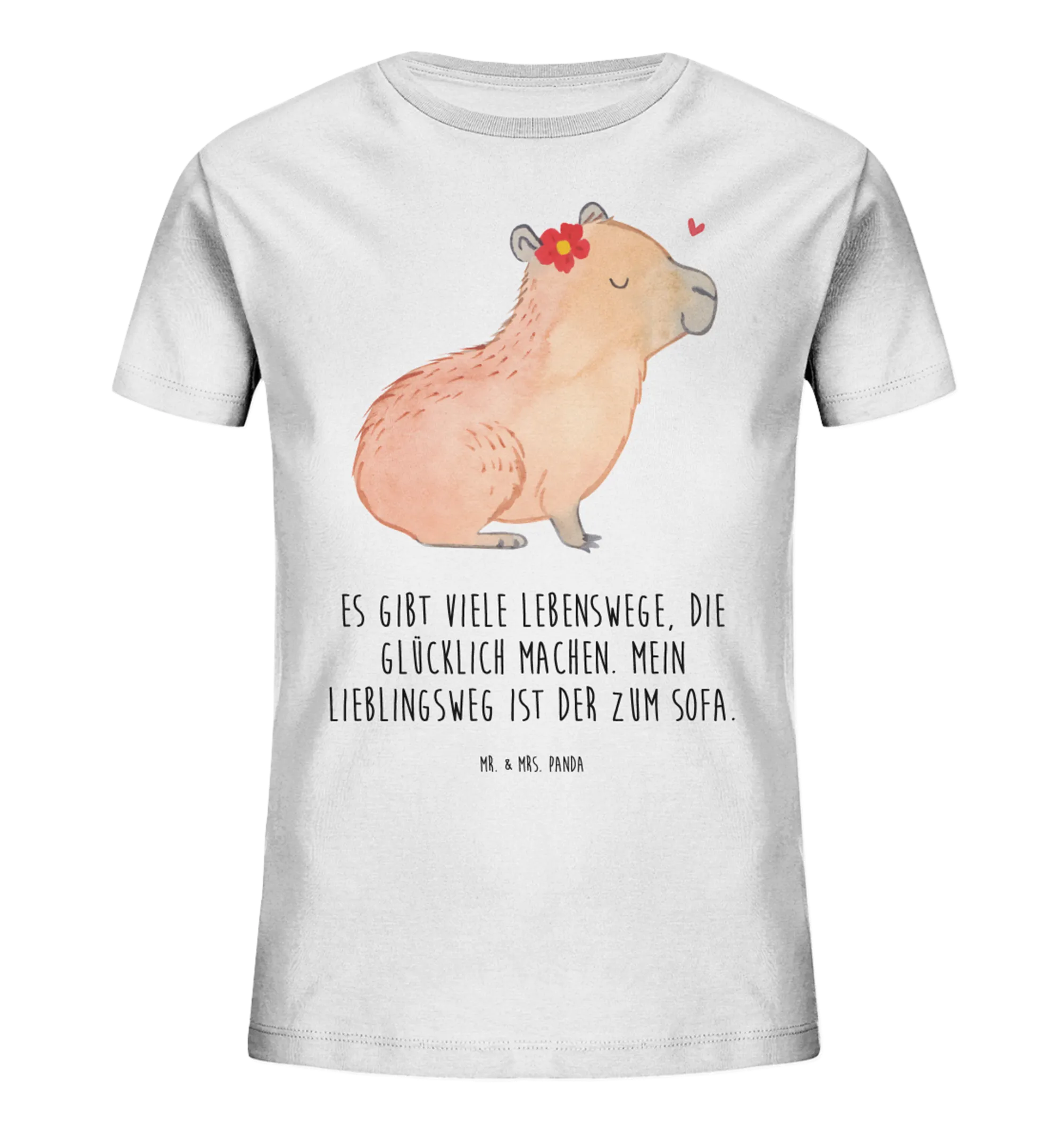 Welcome to the world of Capybara Flower! This delightful motif showcases a tranquil capybara, eyes shut in serene bliss, topped with a vibrant red flower. Its sunny yellow center and gentle floating heart remind us of life’s sweetest moments. This capybara embodies the joy of simply being, perfectly in line with our mantra: Es gibt viele Lebenswege, die glücklich machen. Mein Lieblingsweg ist der zum Sofa. So, here’s to finding joy in the quiet spaces and embracing relaxation!