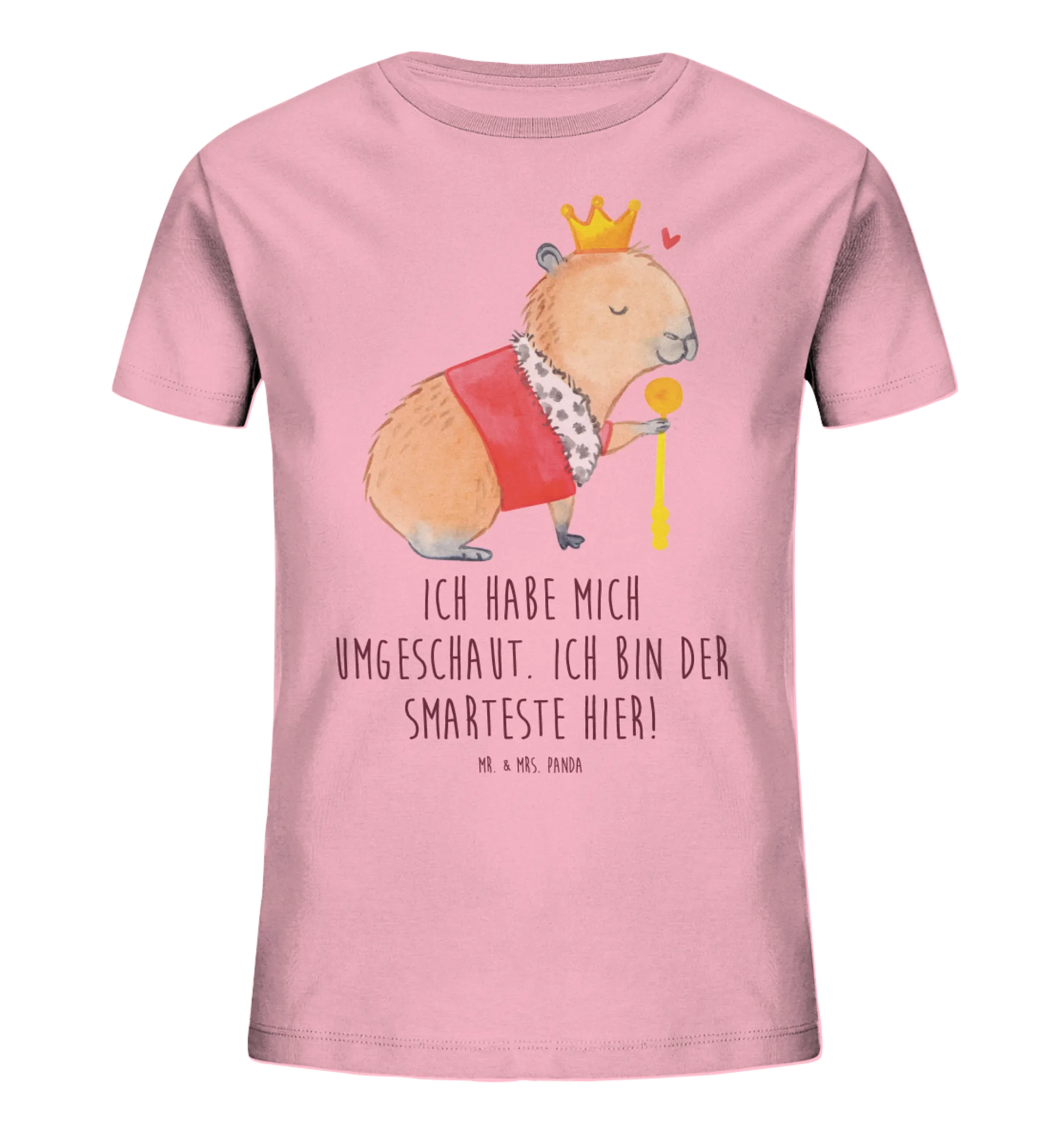 Say hello to the Capybara King, the epitome of serenity in royal attire! Resplendent with a golden crown and a rich purple cloak adorned with a fluffy white collar, he sits proudly, holding his golden scepter like a true ruler. His peaceful expression reminds us to find calm amidst life’s challenges. A delicate heart floats next to him, a testament to the joy he brings. As he wisely declares, 'Ich habe mich umgeschaut. Ich bin der Smarteste hier!' – let this be a reminder that confidence stems from understanding ourselves and our strengths.