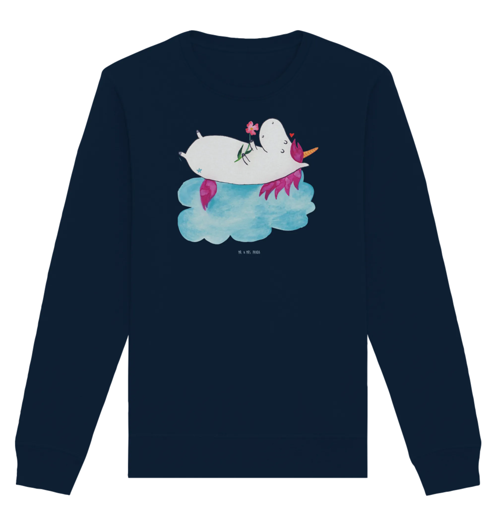 The enchanting design features a charming unicorn cuddling on a fluffy cloud, radiating bliss and affection. This adorable motif, exclusive to our Unicorn Collection, is thoughtfully hand-drawn by Mrs. Panda, ensuring each piece is truly unique. There's something undeniably special about wearing a pullover that feels like a warm embrace from your favorite fantasy creature!