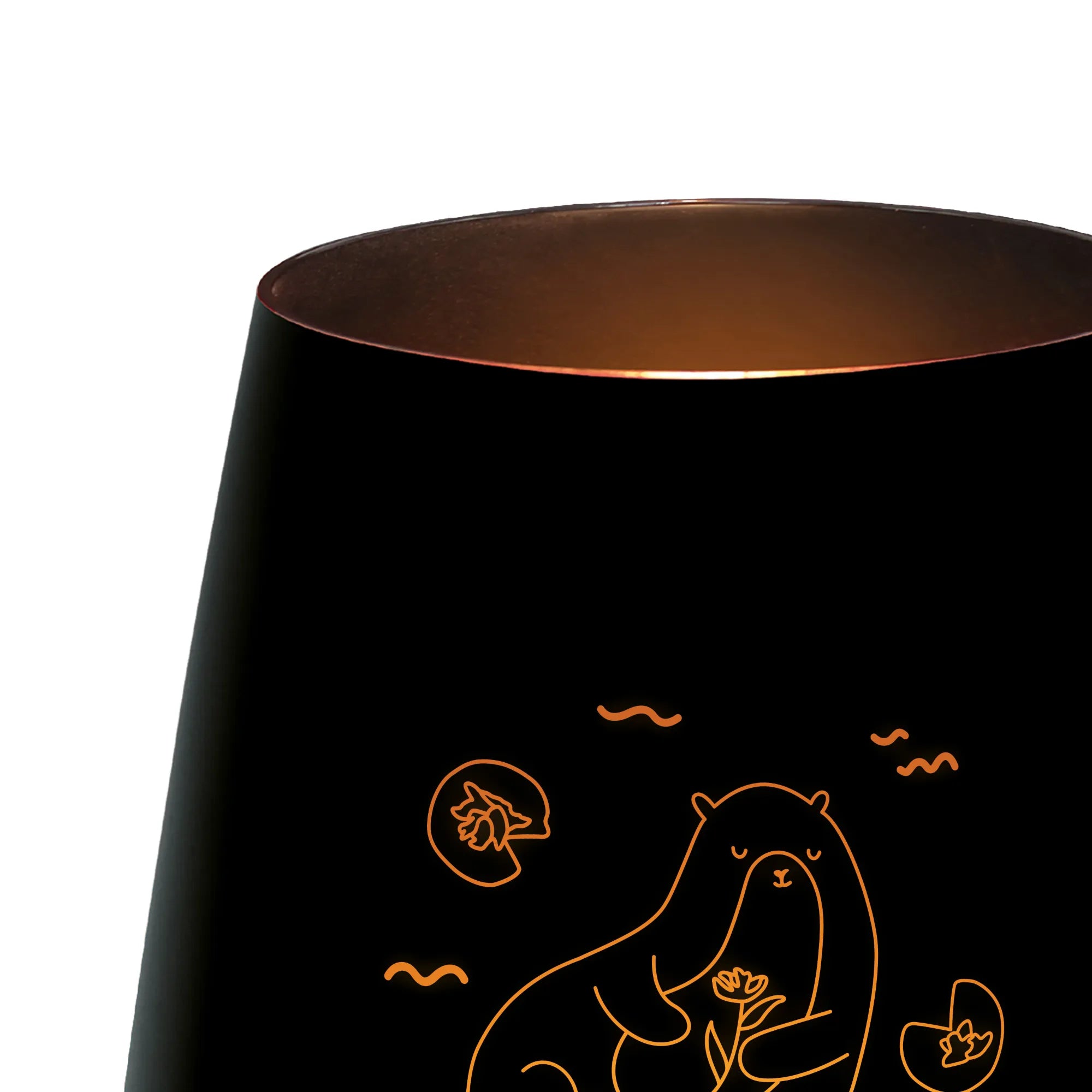 Das personalisierte Gold Windlicht mit dem bezaubernden Otter-Motiv und der Seerose von Mr. & Mrs. Panda ist das perfekte Geschenk für alle, die es lieben, ihre Räume mit einem Hauch von Individualität zu bereichern. Ob für einen vertrauten Abend mit Freunden, einen romantischen Moment zu zweit oder einfach nur zur Verschönerung deiner eigenen vier Wände - dieses Windlicht sorgt für eine wohltuende und gemütliche Stimmung.