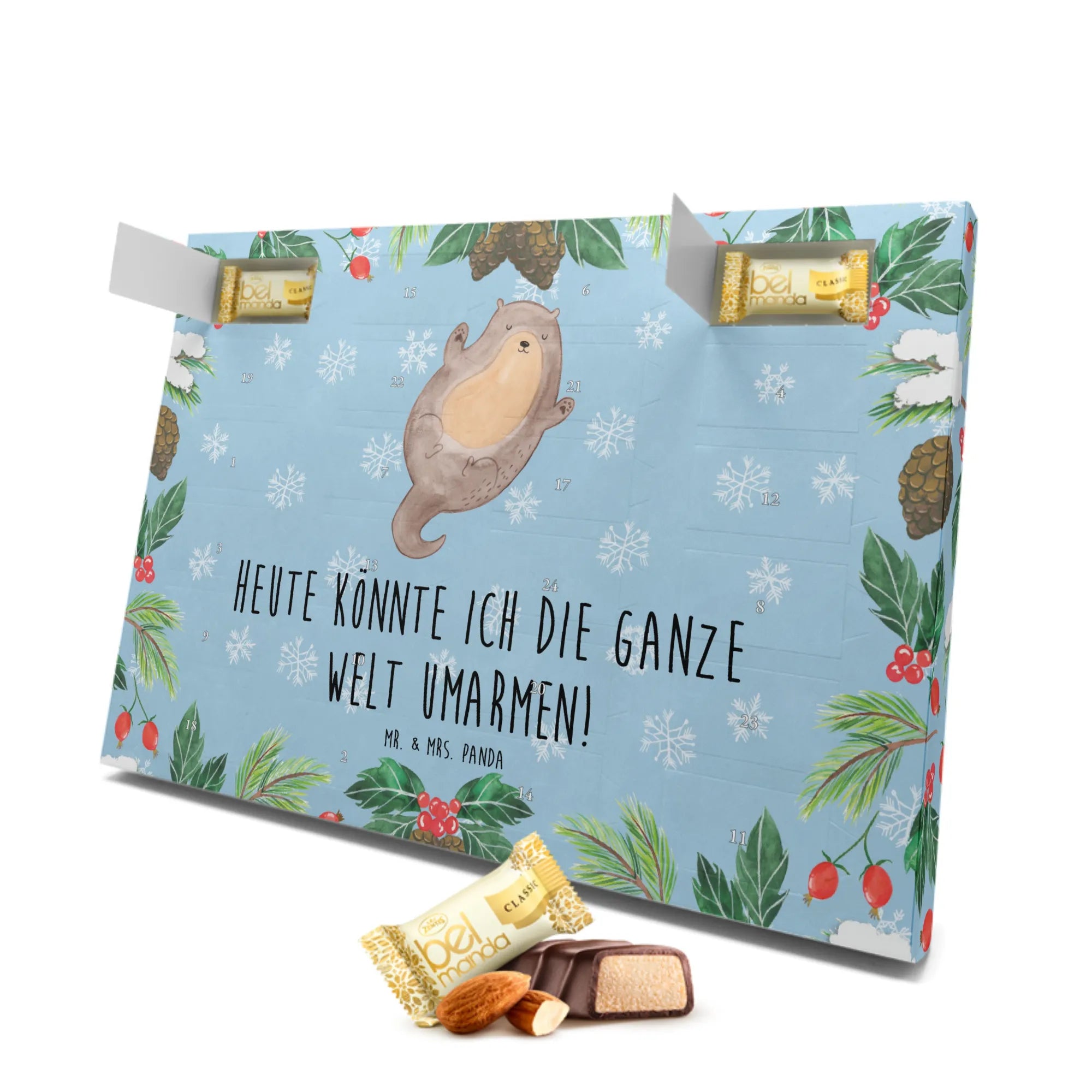 Entdecke den bezaubernden Marzipan Adventskalender mit dem Motiv "Otter Umarmen" aus der Otter-Kollektion von Mr. & Mrs. Panda! Dieser wundervolle Adventskalender ist nicht nur ein echter Blickfang, sondern auch ein köstliches Highlight in der Vorweihnachtszeit. Inspiriert von der lebensfrohen Natur der Otter, zeigt das liebevoll gestaltete Design einen süßen Otter, der auf dem Rücken schwimmt und seine Arme ausbreitet, um das Leben zu umarmen. Die Aufschrift "Heute könnte ich die ganze Welt umarmen!" bringt nicht nur ein Lächeln auf dein Gesicht, sondern verbreitet auch pure Vorfreude auf das Weihnachtsfest.