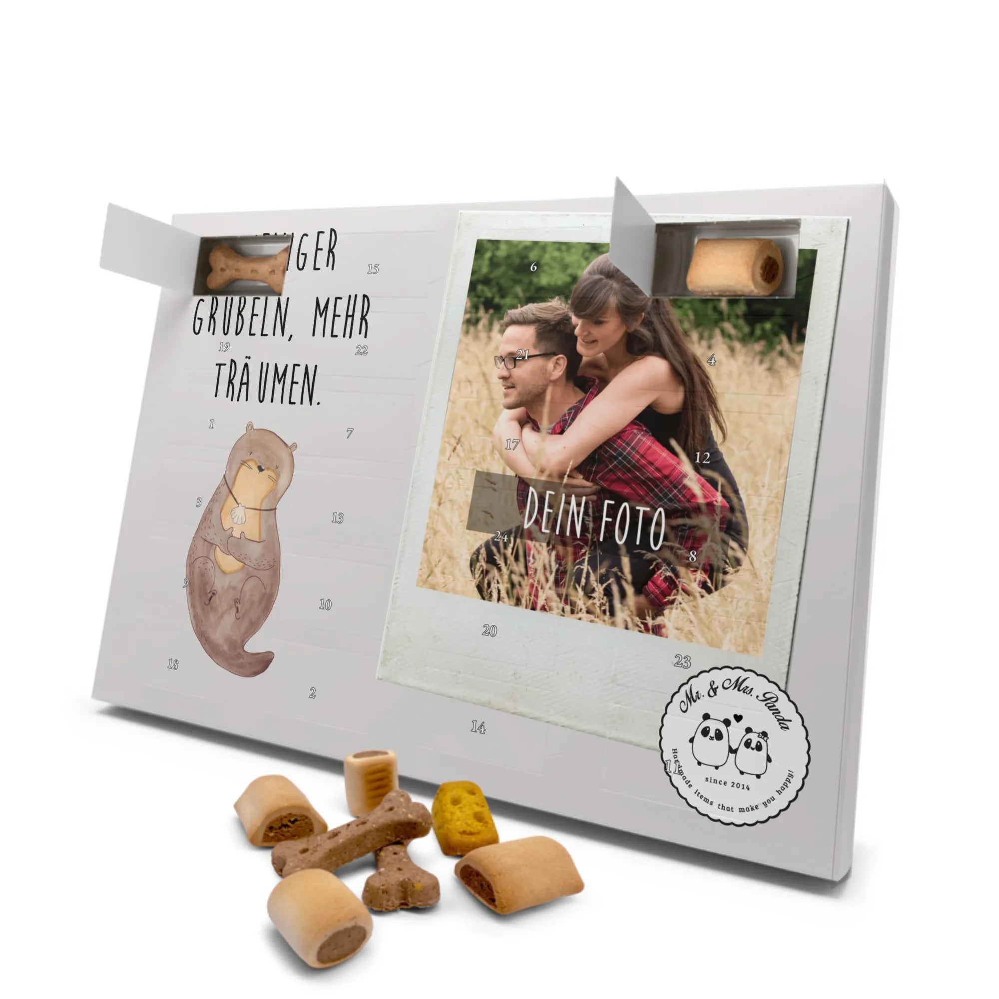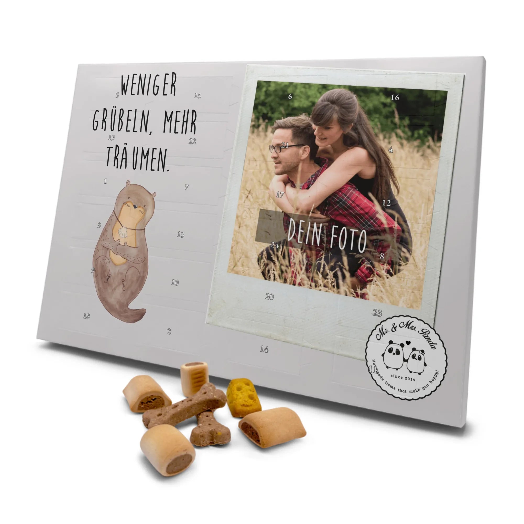 Der personalisierte Hunde Foto Adventskalender "Otter mit Muschelmedaillon" von Mr. & Mrs. Panda ist das perfekte Geschenk für Hunde- und Tierliebhaber. Jeder Tag im Advent wird zu einem besonderen Erlebnis, denn hinter jedem Türchen verbirgt sich ein leckerer Hundekeks, der aus hochwertigen und gesunden Zutaten besteht.