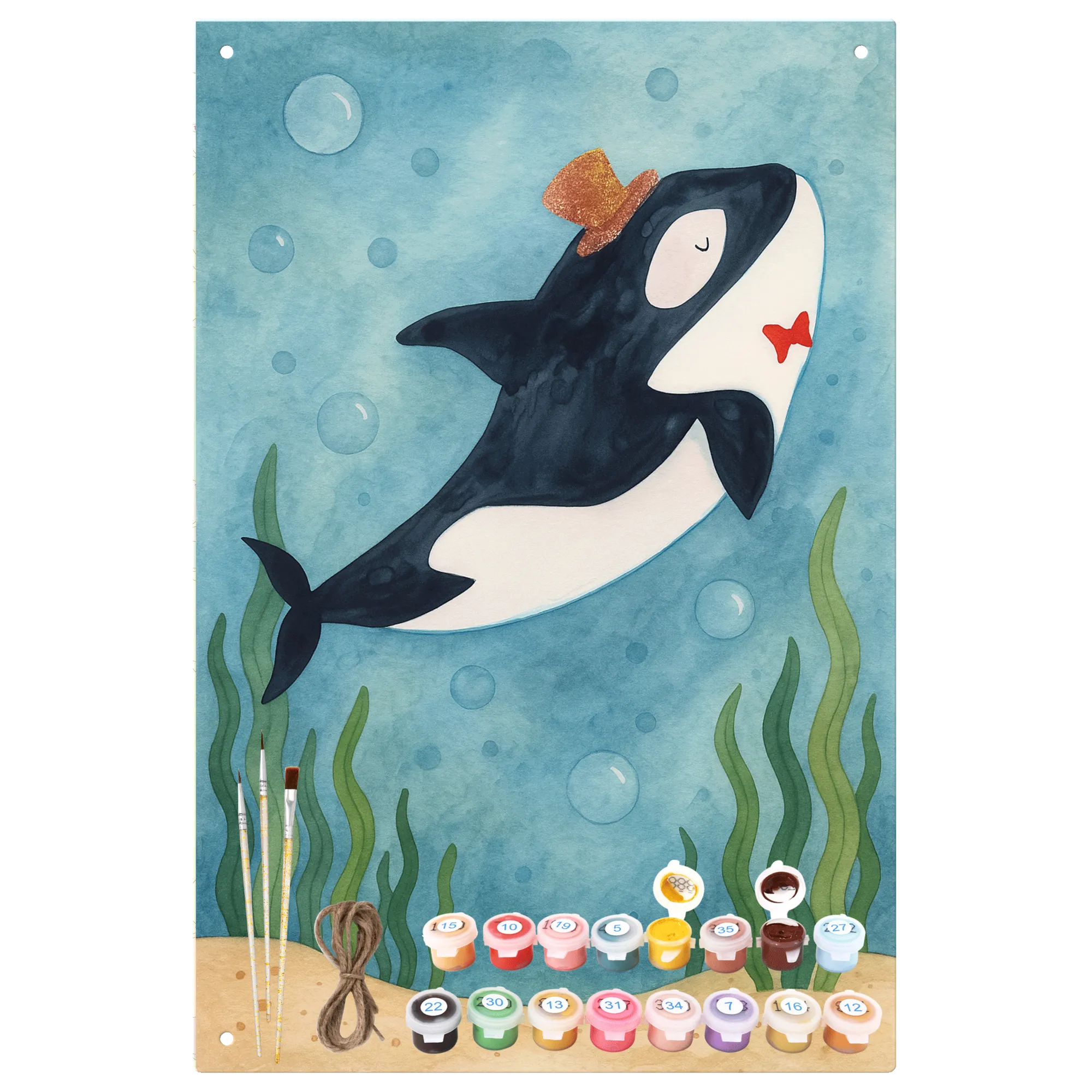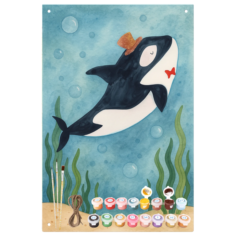 Step into a joyful celebration with our fabulous orca motif! Captured in a playful pose and accented by a dashing floral cylinder, this orca radiates happiness and charm. The contrast of its sleek black and white body with the vibrant little red fish adds a wonderful dynamic to the scene. Putting this design up is like welcoming a wave of joy into your home! Perfect for birthdays or any special gathering, it's an artistic reminder to celebrate life's little wins and big adventures. Let's spread some glitter and confetti while we indulge in delicious treats and laughter. This orca is here to remind us to enjoy every moment and create lasting memories with friends and family!