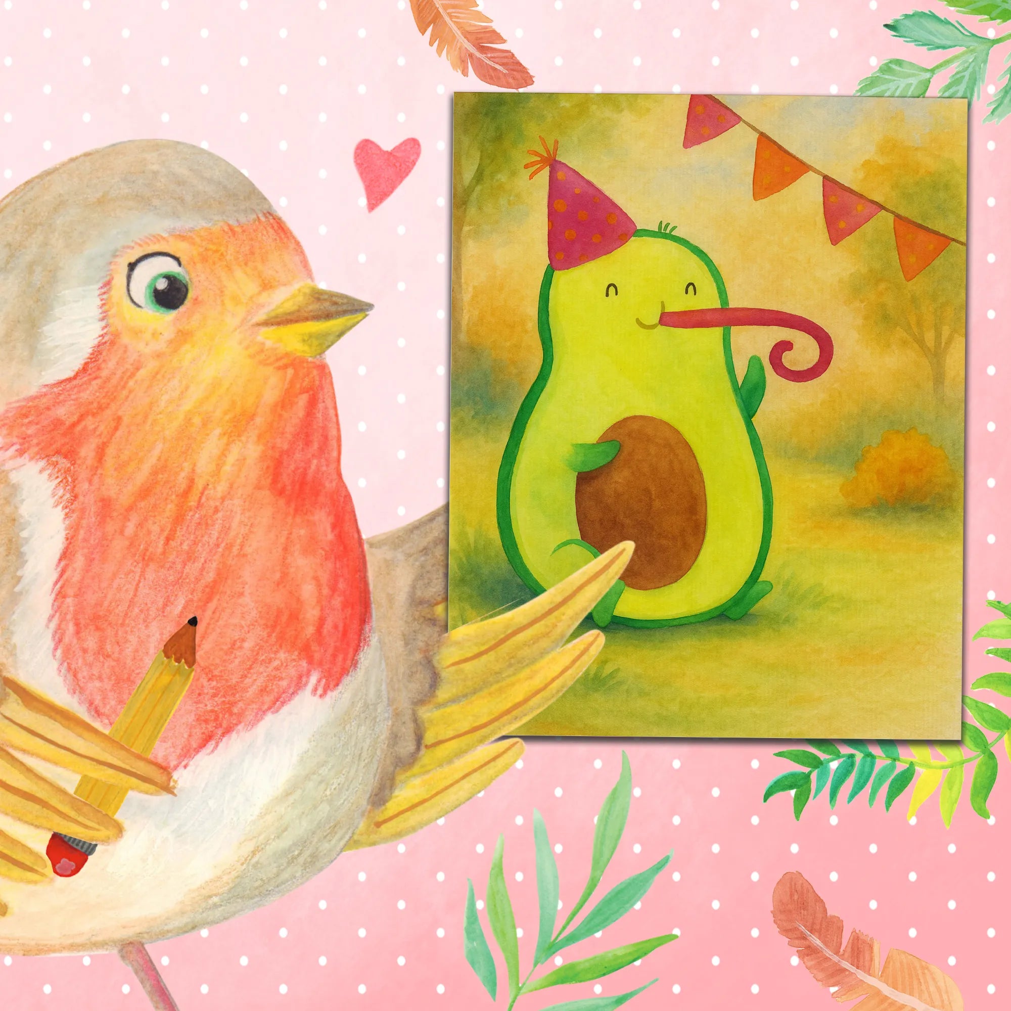 Frohes Feiern mit der süßen Avocado im Partyhut! Diese fröhliche kleine Frucht steht für jede Menge Spaß und gute Laune. Mit der Partypfeife im Mund ist sie bereit, jede Feier aufzupeppen und die Gäste zum Lachen zu bringen. Sie erinnert uns daran, dass das Leben eine große Feier ist und wir jeden Moment genießen sollten. Was gibt es Schöneres, als zusammen mit Freunden zu lachen, zu tanzen und einfach den Augenblick zu genießen? Lass die Avocado dein Freund sein, während ihr zusammen unvergessliche Erinnerungen schafft und die positiven Vibes verbreitet. Feier das Leben und jede Gelegenheit mit einem Lächeln!