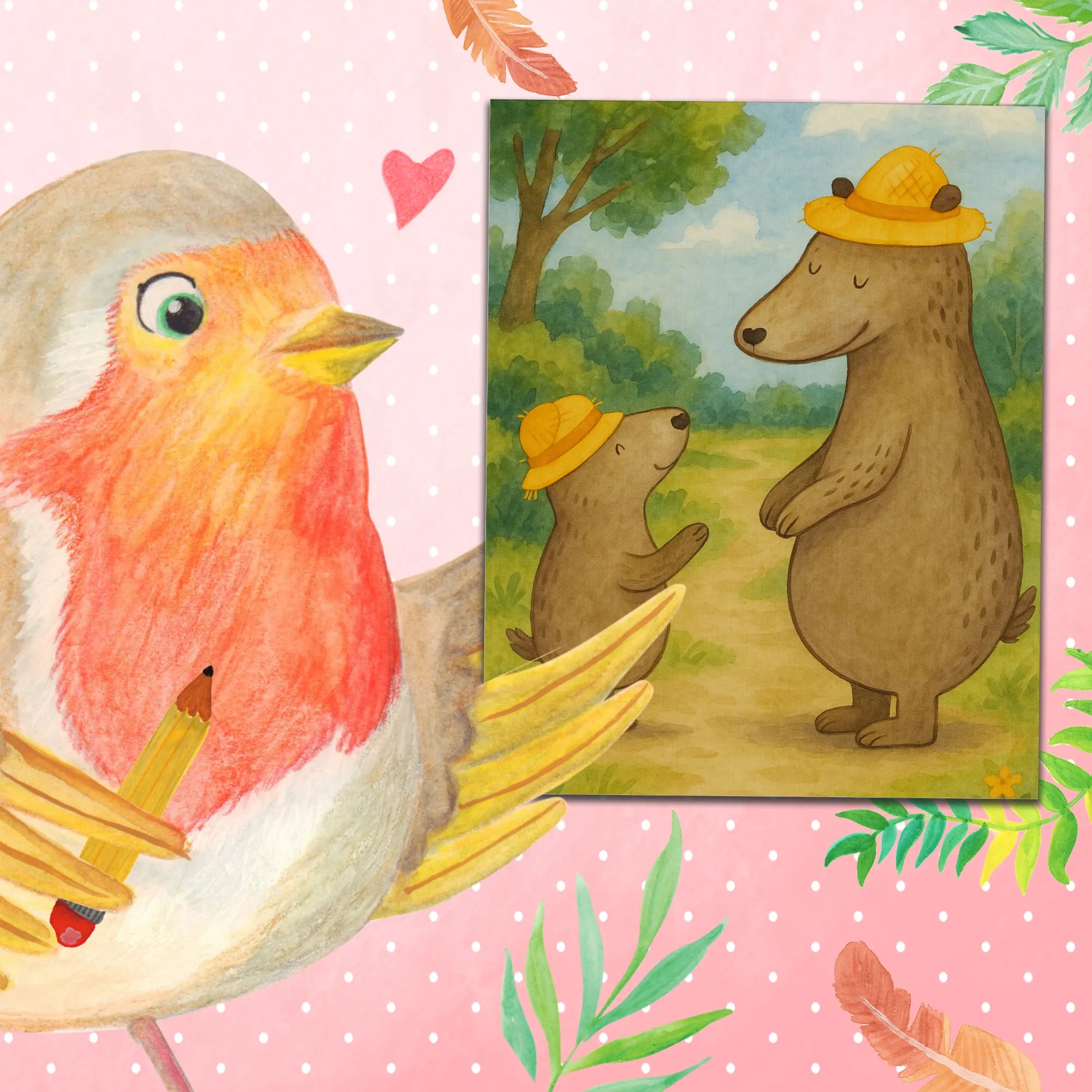 Diese zwei Bären unterstreichen mit ihrem freundlichen Gesichtsausdruck und den modischen gelben Hüten, was es bedeutet, eine Familie zu sein. Wie ein Vater, der stolz sein Kind ansieht, lädt uns diese Szene ein, die Momente zu schätzen, die das Leben lebenswert machen. Sie erinnern uns daran, dass Geschichten über Liebe und Zusammenhalt unsere Leben bereichern können. An diesem Vatertag wird es zum perfekten Motiv, um den Einfluss eines Vaters auf das Leben seines Sohnes zu feiern. Diese Bären sind mehr als nur Charaktere, sie spiegeln die Werte wieder, die uns am Herzen liegen: Zusammenhalt, Freude und das Abenteuer, das wir Familie nennen.