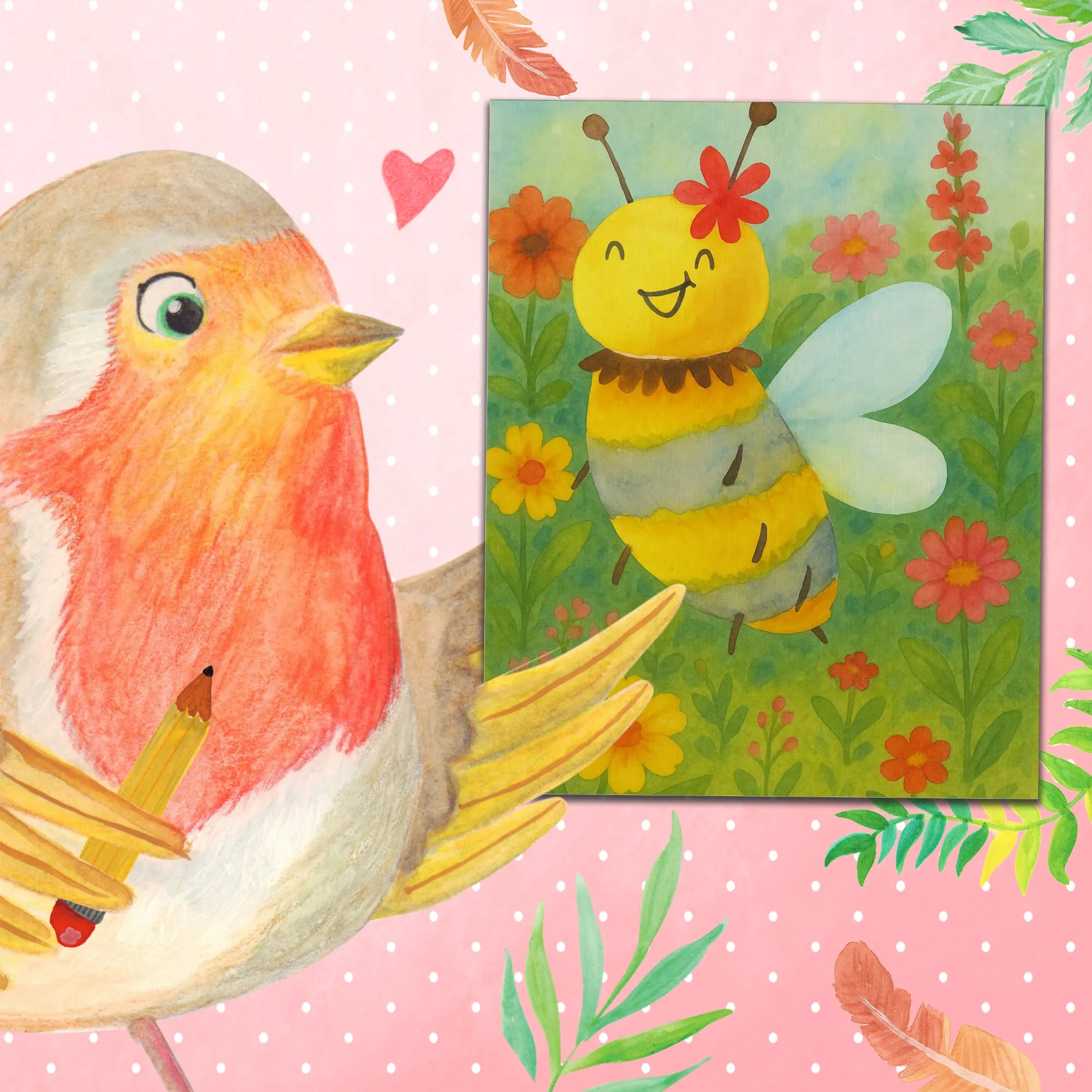 Meet the sweetest little bee, gracefully soaring through the air with a radiant flower on its head! This delightful motif showcases the playful essence of nature, celebrating the beauty and joy surrounding us. Our buzzing friend embodies the spirit of hard work, while the flower symbolizes love and blooming potential. Together, they paint a picture of joy that brightens the heart and surrounds us with positivity. This charming illustration is perfect for inspiring your day, urging you to find happiness in the little things that make life special. Whether it’s enhancing your home decor or serving as a delightful gift, this motif carries a message of warmth and cheer. Dive into the whimsical world of this charming bee and flower, and let them bring a splash of joy to your everyday life!