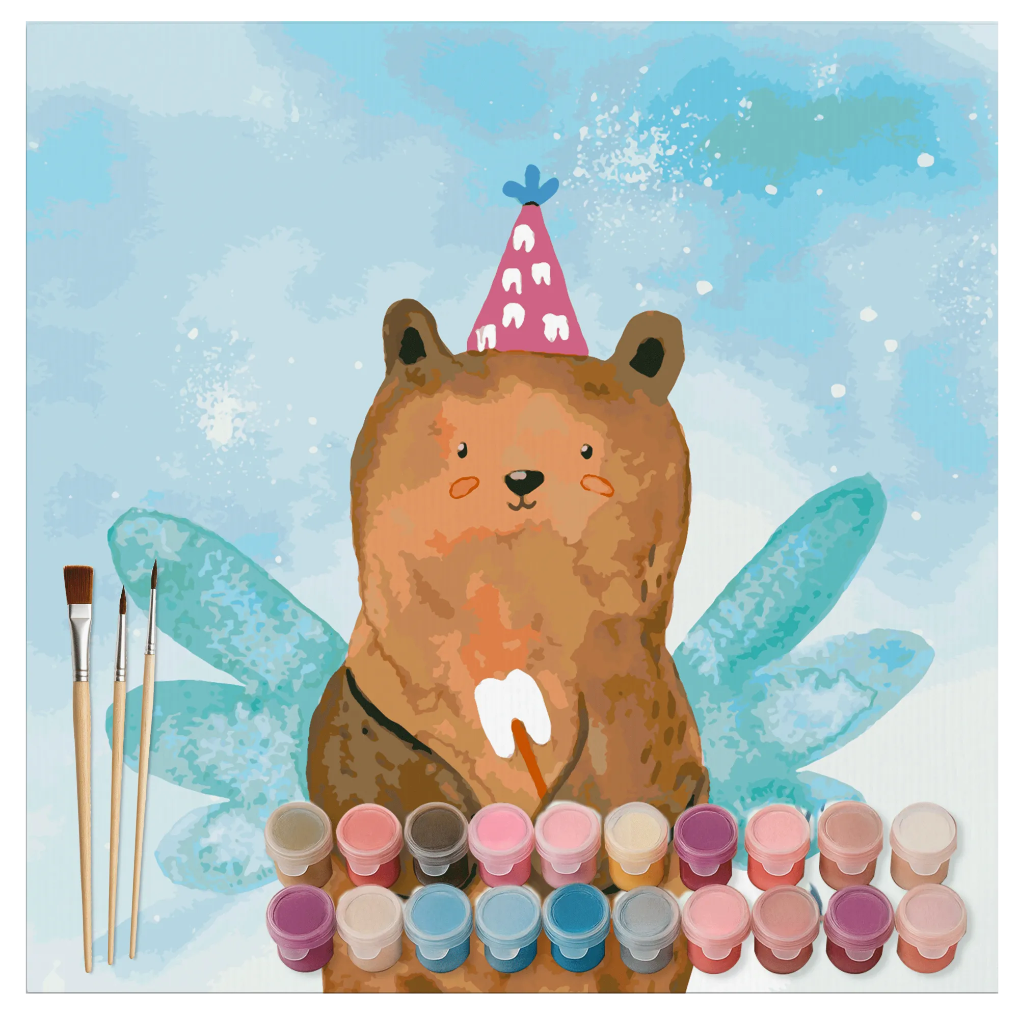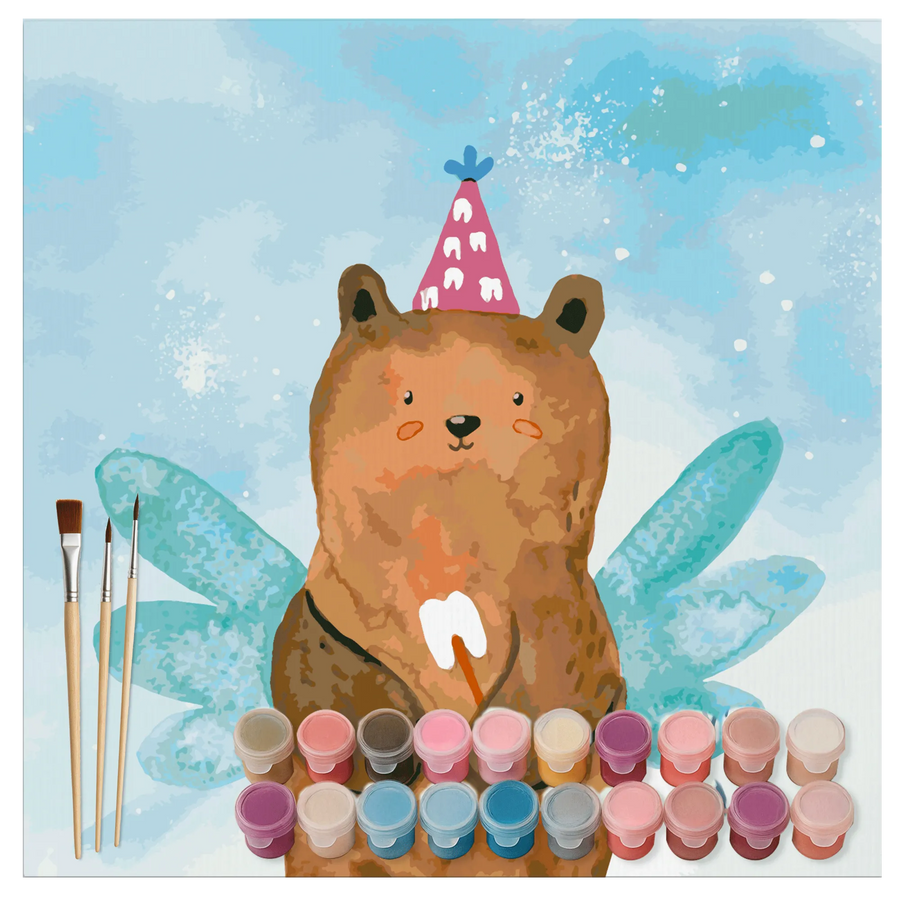 The whimsical bear, adorned with tiny wings and a charming fairy hat, is ready to collect those precious milk teeth with magical flair! This captivating Paint by Numbers set, with its adorable Tooth Fairy Bear design, is perfect for children celebrating their first lost tooth and provides a fantastic way to commemorate the occasion. It combines creativity with the excitement of the tooth fairy tradition—making every brush stroke a step closer to creating a delightful masterpiece.
