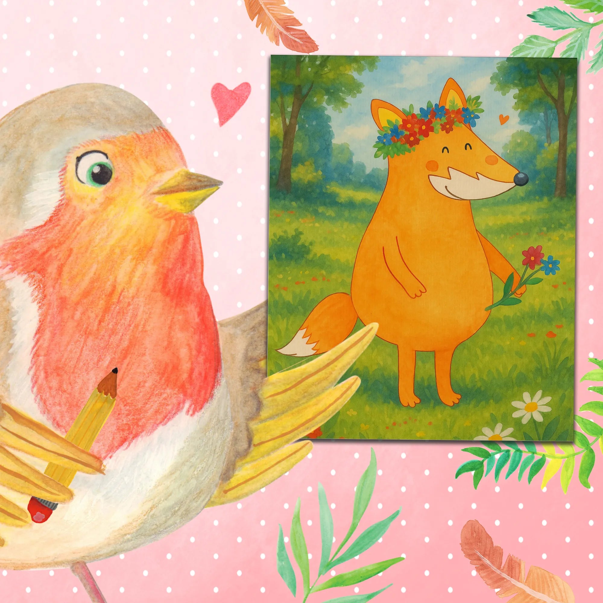 Ein lebhafter Fuchs mit einer hübschen Blumenkrone auf dem Kopf und einer Blume in seiner Pfote ist das perfekte Symbol für die blühenden Freundschaften in unserem Leben! Dieser Fuchs symbolisiert die Zuneigung zu unseren Freunden und die Freude, die wir mit ihnen teilen. Jeder Blick auf dieses Motiv erinnert uns daran, wie wichtig es ist, Liebe und Freude in jede Beziehung zu bringen. Die Blumen, die diesen charmanten Fuchs umgeben, stehen für die bunte Vielfalt der Freundschaft und das kleine Glück, das in den alltäglichen Momenten steckt. Der Fuchs ist nicht nur ein liebenswerter Charakter, sondern auch ein echter Motivator, uns zu daran zu erinnern, den Wert von Freundschaft und Selbstliebe zu schätzen. Er will uns ermutigen, die Blumen der Freude wortwörtlich zu ernten und die Farben des Lebens zu genießen, die wir durch wertvolle Verbindungen erhalten. Lass dich von diesem Fuchs zu einem Leben voller Freude und bunter Momente inspirieren – denn das sind die Blumen, die das Leben lebenswert machen!