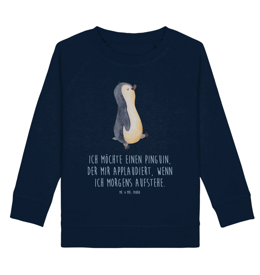 Hergestellt aus hochwertiger Bio-Baumwolle, ist der Pullover nicht nur besonders weich, sondern auch umweltfreundlich. Die elastischen Bündchen sorgen dafür, dass der Pullover perfekt sitzt und mitwächst. Jeder Pullover wird mit viel Liebe von Mr. & Mrs. Panda entworfen und handgezeichnet, was jedem Kleidungsstück einen einzigartigen Charme verleiht. Der Spruch "Ich möchte einen Pinguin, der mir applaudiert, wenn ich morgens aufstehe." macht jeden Tag ein wenig heller und vermittelt ein positives Gefühl.