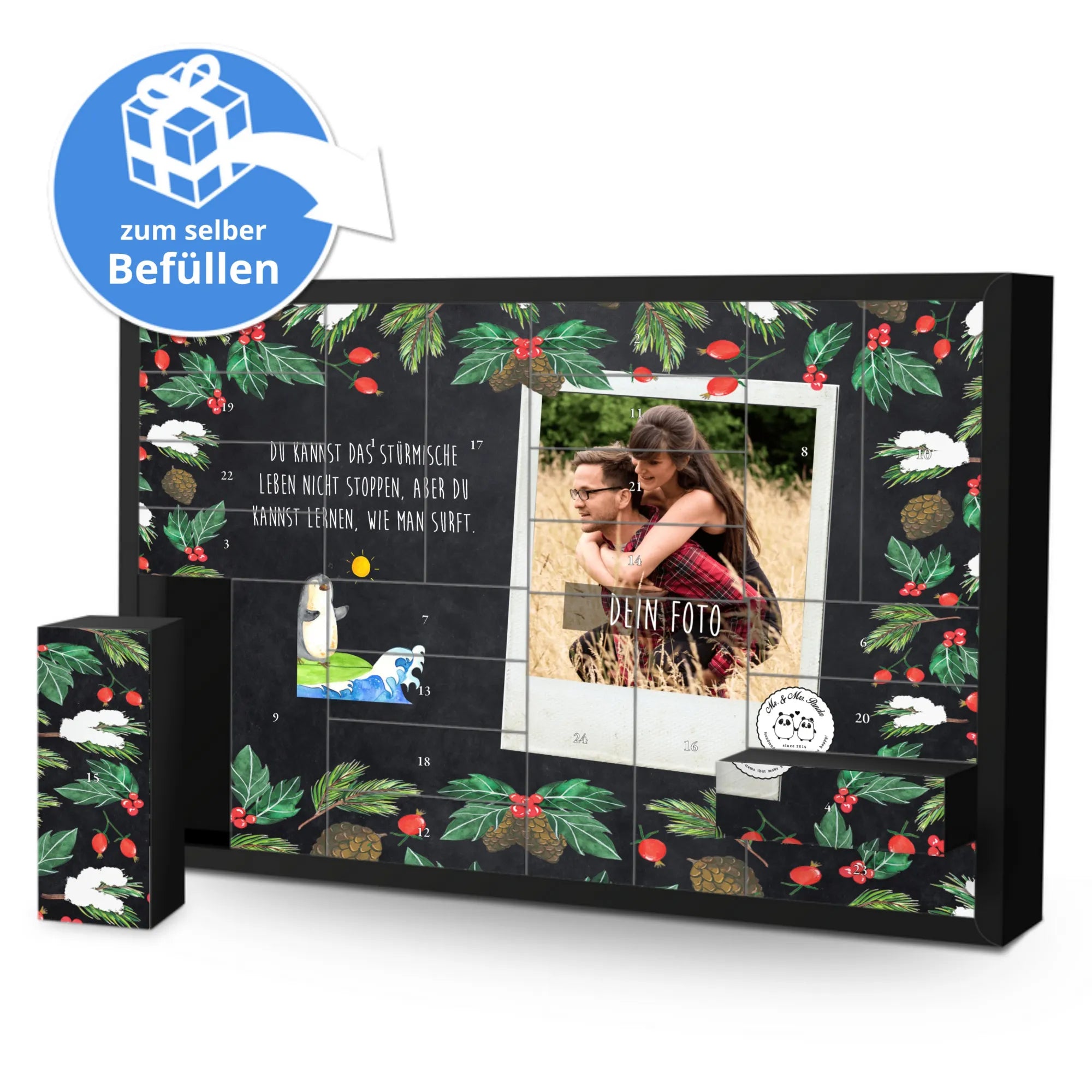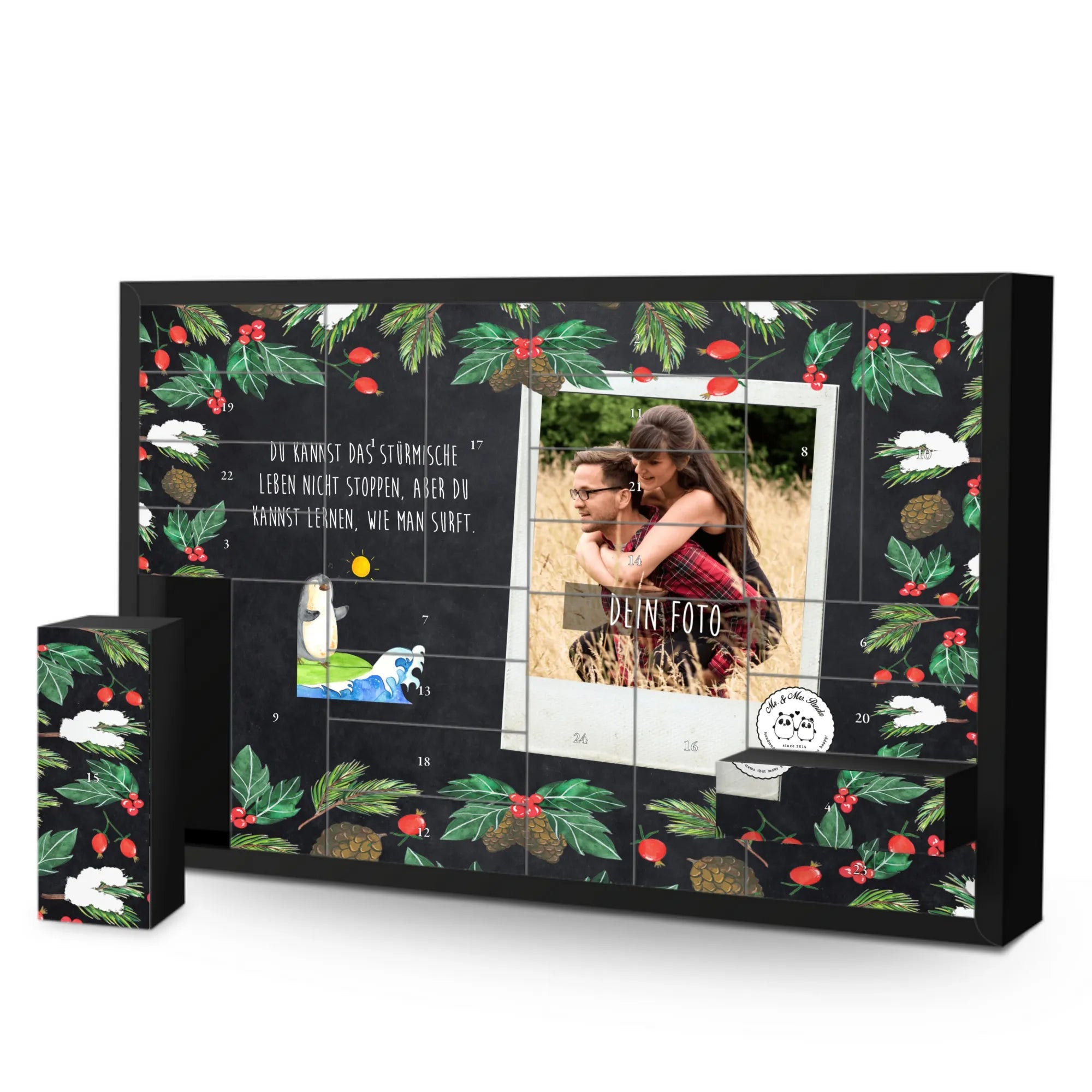 Turn the pre-Christmas season into a truly personal experience with the Personalized Fillable Photo Advent Calendar from Mr. & Mrs. Panda. This unique calendar not only allows you to fill it with your own sweets or small gifts, but also personalize it with a special photo. The photo is beautifully showcased thanks to brilliant print quality on a silk matte surface. Photo quality and selection guidelines ensure your image is optimally presented, while charming illustrations and sayings from Mr. & Mrs. Panda adorn the rest of the calendar.