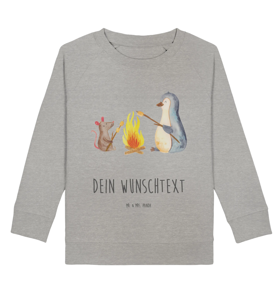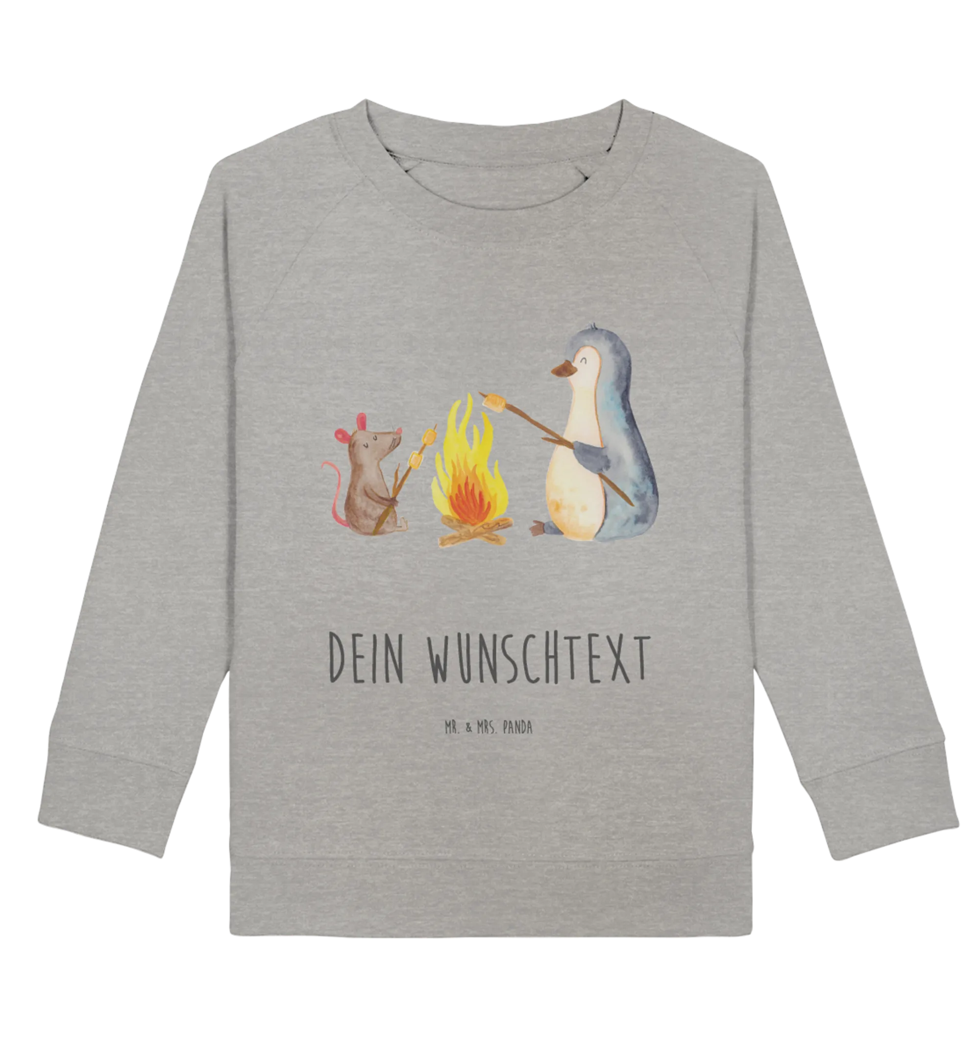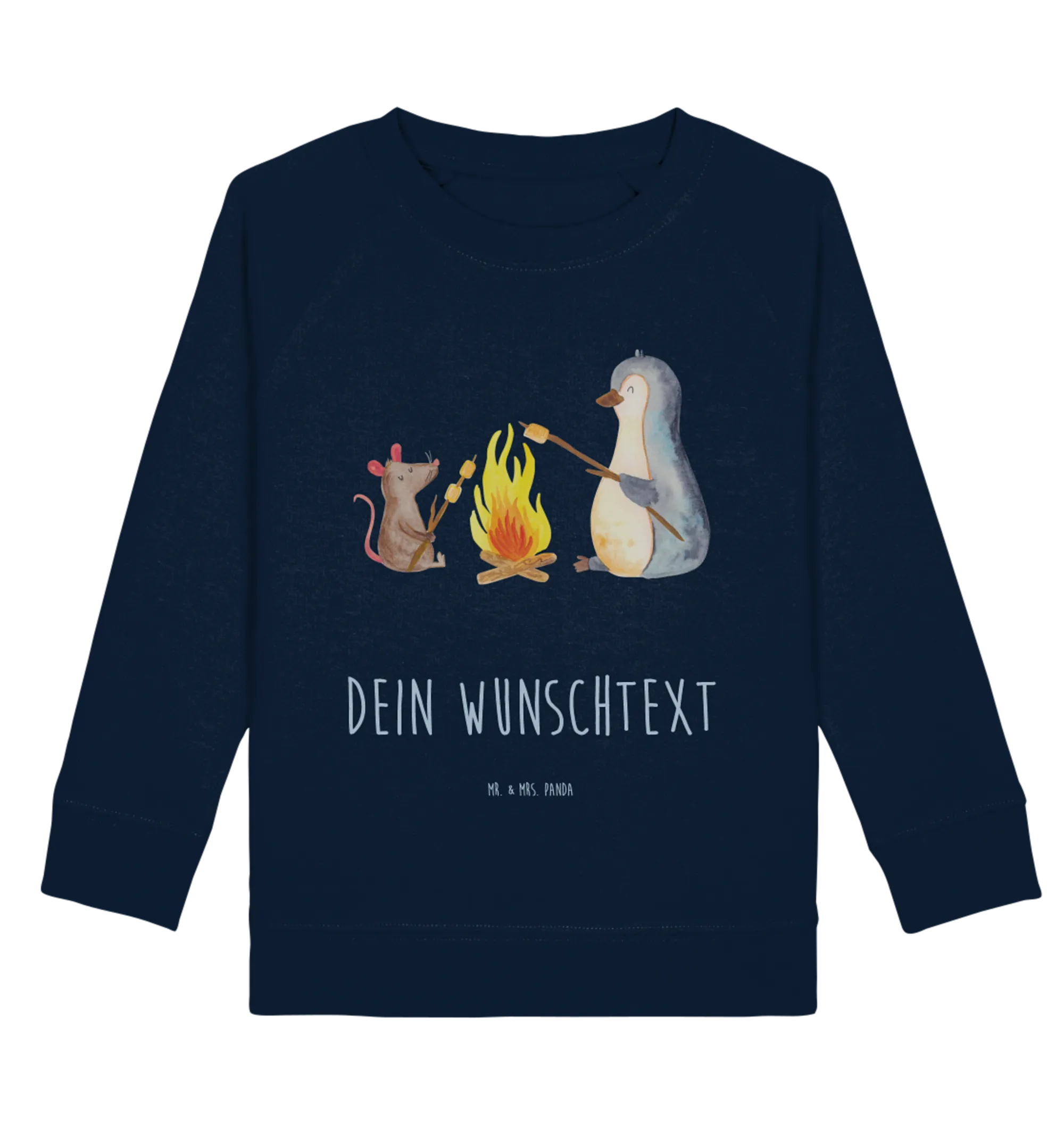 Das Motiv zeigt einen lächelnden Pinguin und eine Maus, die zusammen am Lagerfeuer sitzen und köstliche Marshmallows rösten. Die entzückenden Details sind von Mr. & Mrs. Panda liebevoll handgezeichnet und lassen Kinderaugen strahlen. ❤️ Ob zum Geburtstag, zu Weihnachten oder einfach so - dieser Pullover ist ein wunderbarer Begleiter für jeden Anlass!