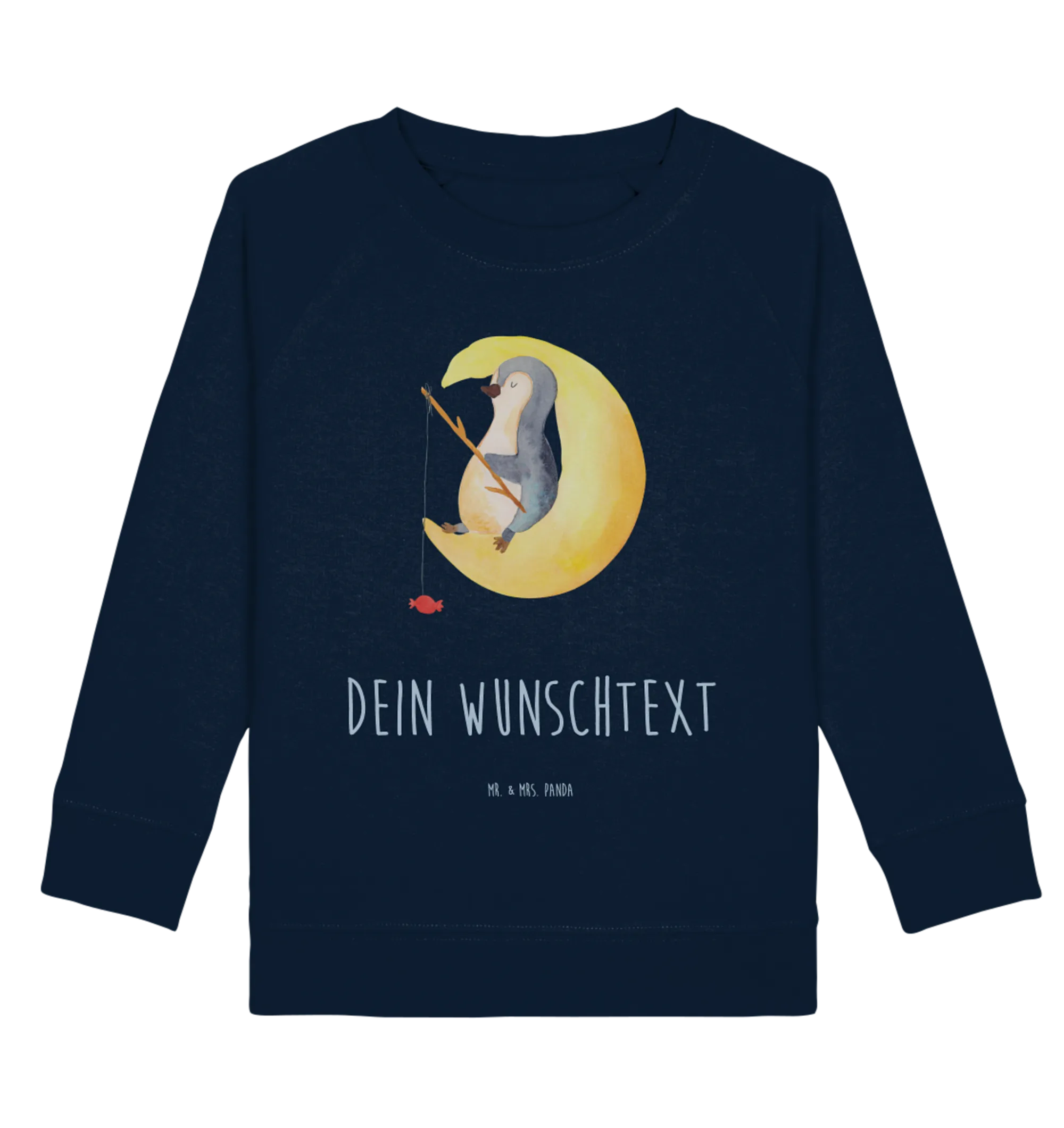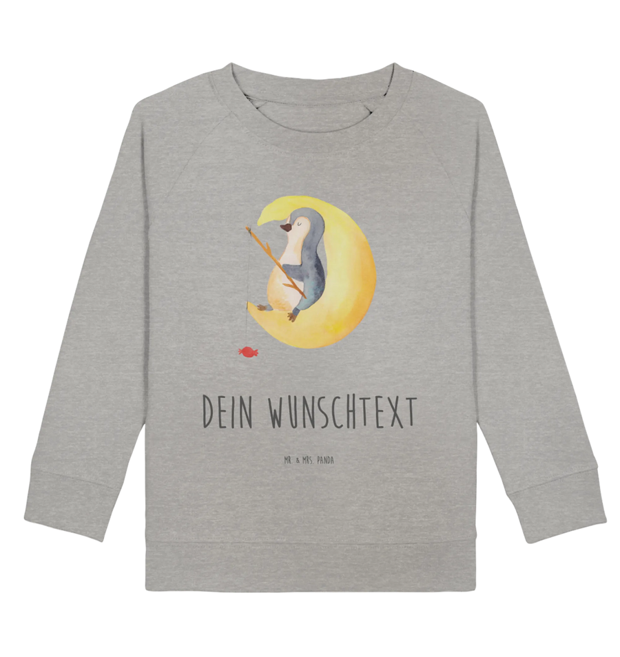 Personalisierter Kinder Pullover „Pinguin Mond“ – aus der liebevollen Pinguin - Kollektion von Mr. & Mrs. Panda. Ein süßer Pinguin hat es sich auf einer Mondsichel gemütlich gemacht und angelt nach Sternen. An seiner Angel hängt ein Bonbon. Dazu der freche Spruch: „Ich und mein Körper wollen schlafen, aber mein Kopf will wissen, ob Pinguine Knie haben...“ – ein kleiner Lacher für die Abendroutine, der Kinder beim Einschlafen begleitet.