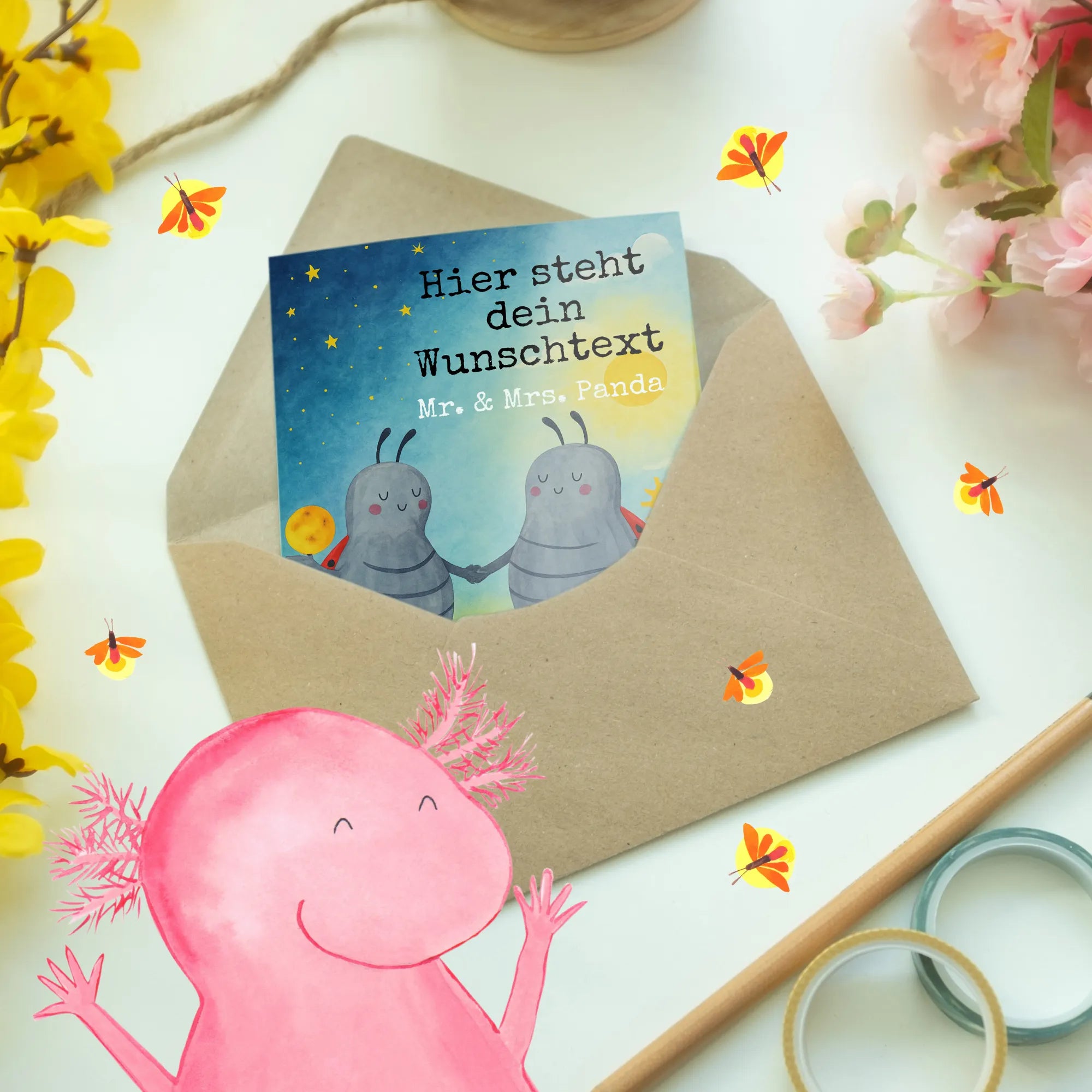 Gestalte deine Grüße einzigartig mit der personalisierten Grußkarte von Mr. & Mrs. Panda! Diese bezaubernde Karte hat eine Größe von 148 mm x 105 mm und besteht aus hochwertigem Karton, der langlebig ist. Auf der Vorderseite der Karte kannst du deinen Wunschnamen oder Wunschtext hinzufügen, während die Innenseite blanko bleibt für deine kreativen Gedanken. Die Karte ist perfekt für jeden feierlichen Anlass, sei es ein Geburtstag, eine Hochzeit oder einfach nur um jemandem zu zeigen, wie wichtig er dir ist. Die glänzend veredelte Außenseite verleiht der Karte einen eleganten Touch, und der edle Umschlag sorgt dafür, dass dein Gruß stilvoll überreicht wird.