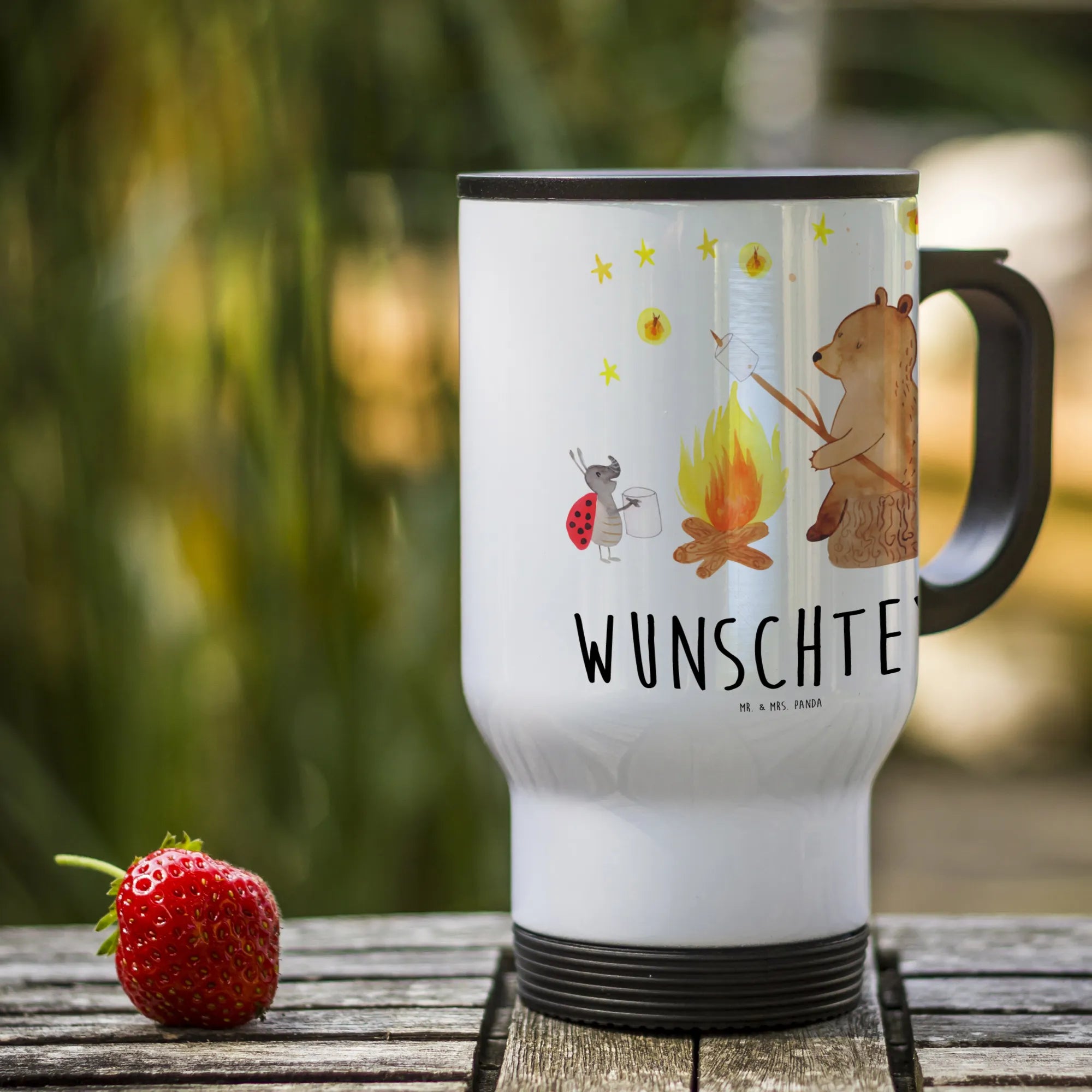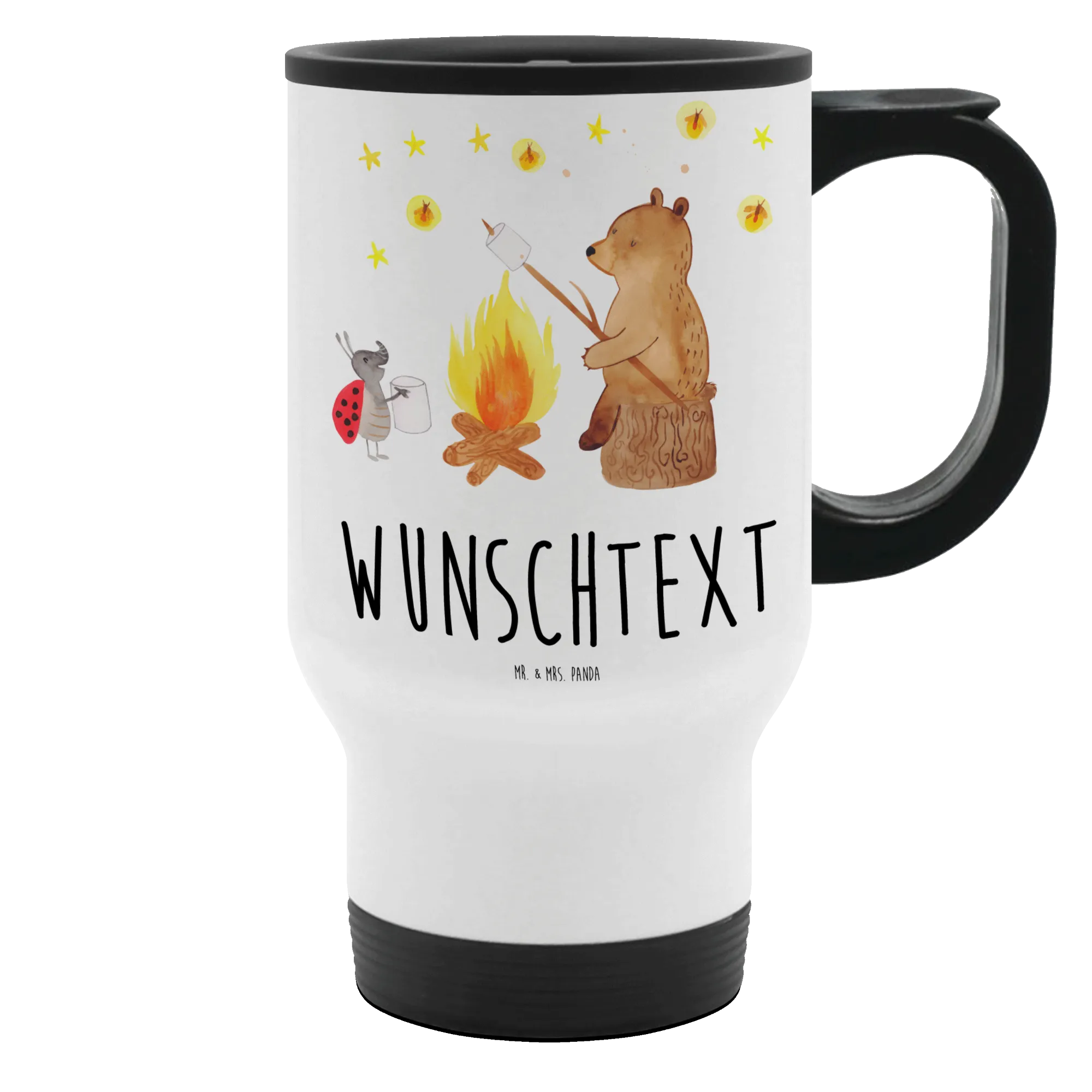 Personalised insulated mug Bear & Ladybird campfire
