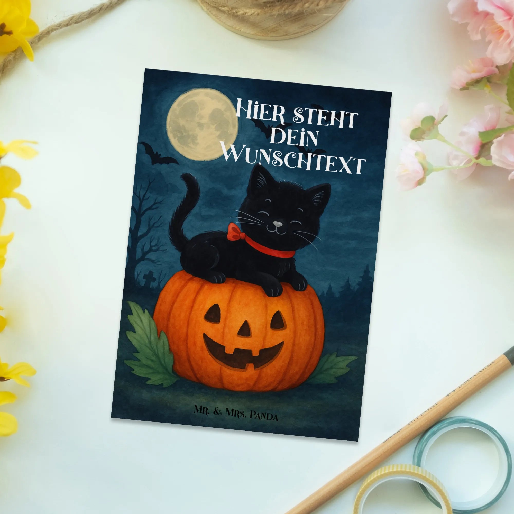 Schwarze Katze mit roter Schleife auf einem Lächelnden Kürbis - Halloween Deko für dein Zuhause