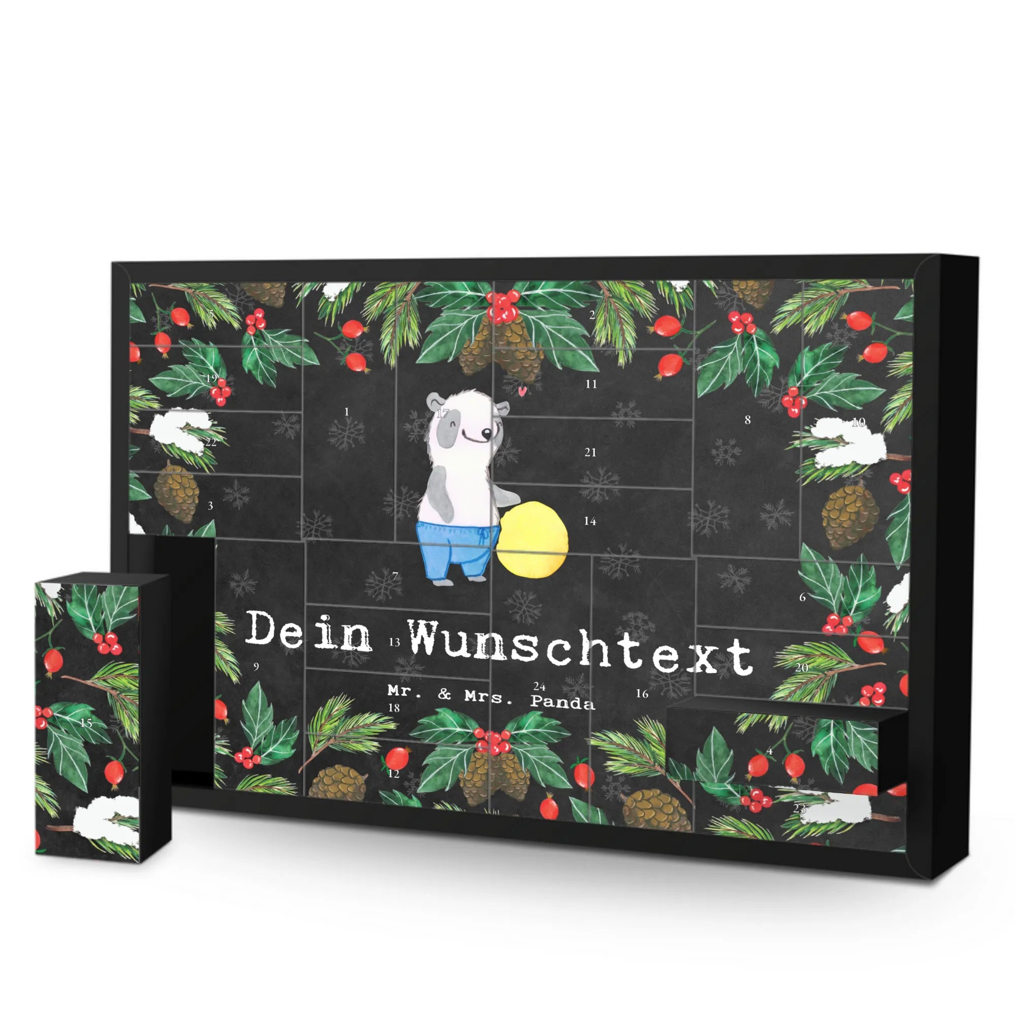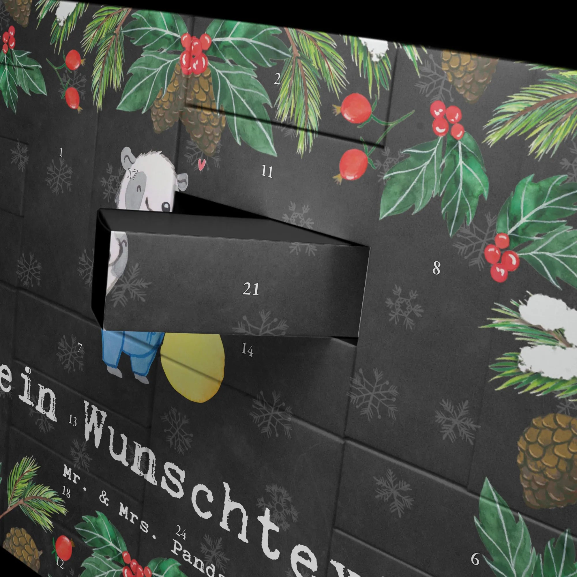 Personalisierter Befüllbarer Adventskalender von Mr. & Mrs. Panda – dein perfekter Begleiter durch die Vorweihnachtszeit! Dieser liebevoll gestaltete Adventskalender ist bedruckt mit wunderschönen Sprüchen und Motiven von Mr. & Mrs. Panda und lässt sich ganz nach deinem Geschmack personalisieren: Trage deinen Wunschnamen oder Wunschtext ein, und wir drucken ihn auf die Vorderseite. Auf der Frontseite findest du eine zauberhafte Zeichnung von Mrs. Panda, die dem Kalender einen warmen, persönlichen Touch verleiht. Der Kalender verfügt über 24 praktische Schachteln zum Selbstbefüllen, ideal für kleine Überraschungen, Süßigkeiten oder liebe Botschaften. Material: stabiler Adventskalender Karton mit brillanter Druckqualität und seidenmatter Oberfläche für eine hochwertige Optik. Besonderheit: inklusive Aufstellvorrichtung, sodass du den Kalender überall dekorativ platzieren kannst. Besonderer Hinweis: wird ohne Füllung geliefert – so kannst du ihn individuell bestücken. Maße: Breite: 619 mm, Höhe: 405 mm, Tiefe: 50 mm. Ein tolles Geschenk für Familie, Freunde oder als persönliche Deko für dein Zuhause. Bestelle jetzt deinen personalisierten Adventskalender und erfreue deine Liebsten jeden Tag im Dezember mit kleinen Überraschungen!