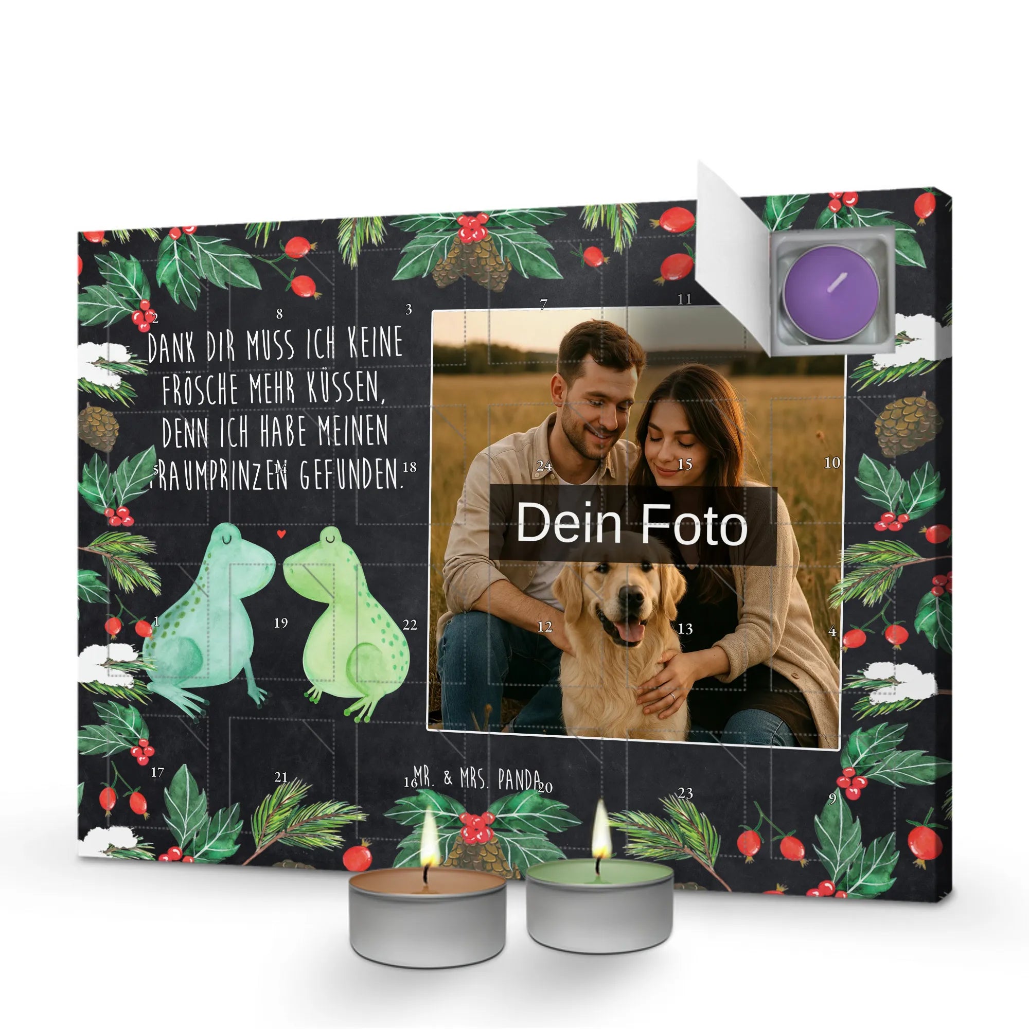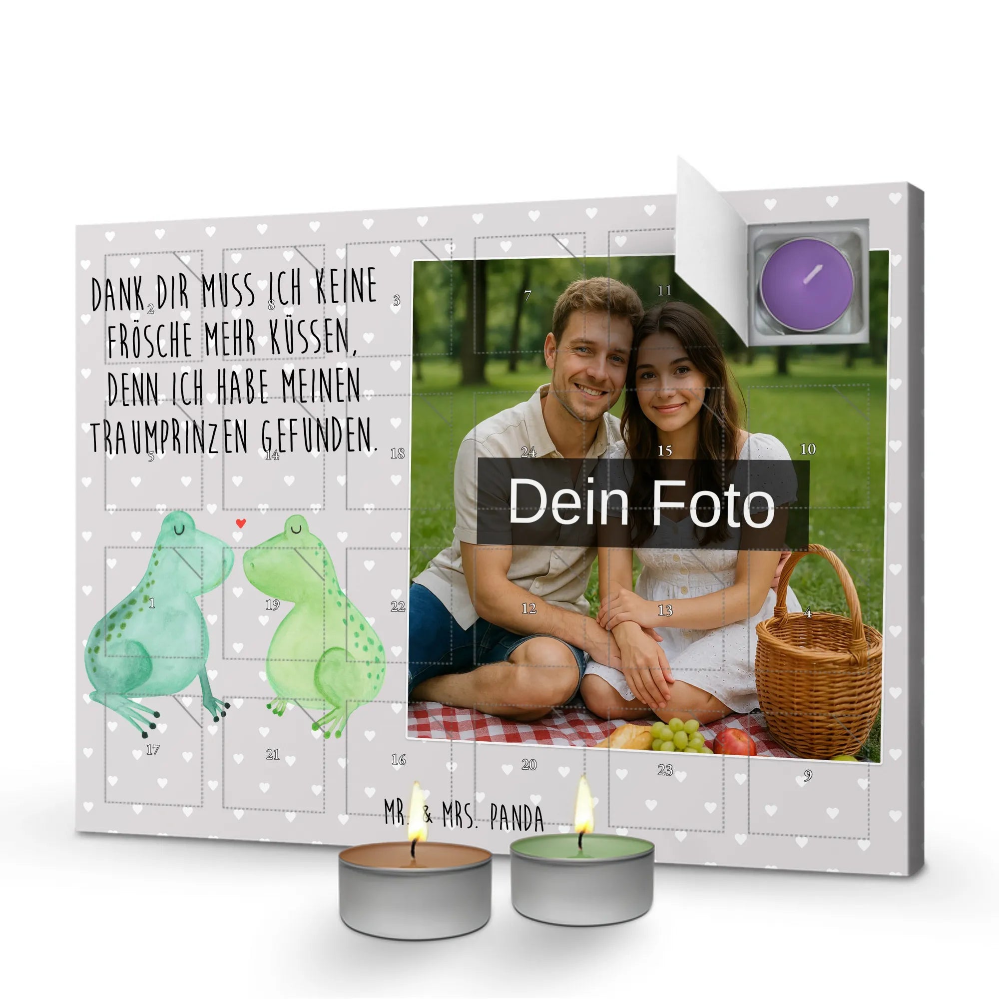 Entdecke den wunderschönen personalisierten Duftkerzen Foto Adventskalender 'Frosch Liebe' von Mr. & Mrs. Panda, das perfekte Geschenk für all jene, die die Liebe feiern möchten. Dieser bezaubernde Adventskalender kombiniert die süßesten Frösche, die sich verliebt gegenüberstehen, mit einem liebevollen Spruch, der das Herz höher schlagen lässt: 'Dank dir muss ich keine Frösche mehr Küssen, denn ich habe meinen Traumprinzen gefunden.'
