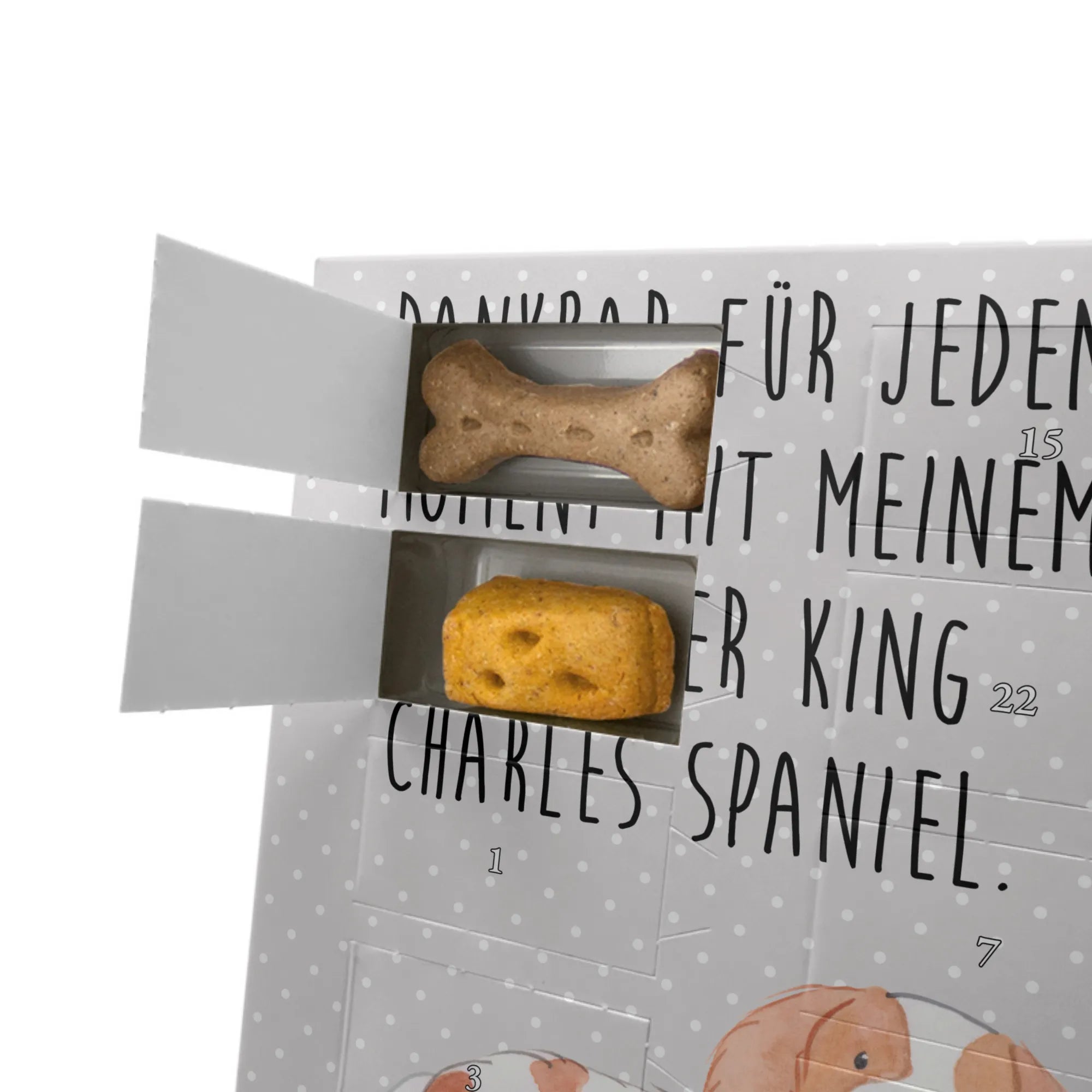Der personalisierte Hunde Foto Adventskalender mit dem Motiv "Cavalier King Charles Spaniel" von Mr. & Mrs. Panda ist das perfekte Geschenk für Hundehalter und Tierfreunde. Specially for you, this calendar combines the joy of counting down to Christmas with the love for your furry friend. Auf jedem der 24 Türchen wartet eine köstliche Überraschung in Form von premium Hundekeksen - genau das Richtige für deinen treuen Begleiter!