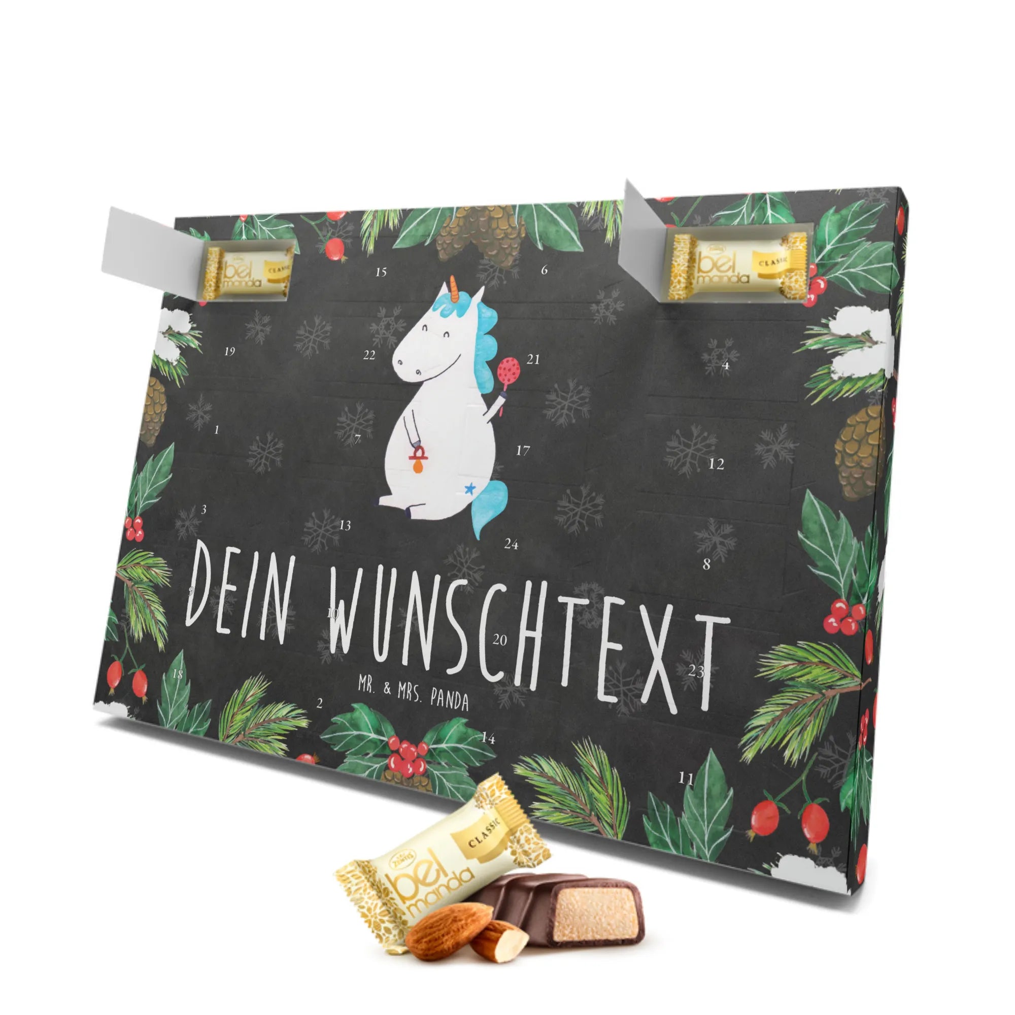 Der personalisierte Marzipan Adventskalender Einhorn Baby von Mr. & Mrs. Panda ist das perfekte Geschenk für frisch gebackene Eltern und kleine Einhorn-Fans. Mit seinem bezaubernden Motiv von einem süßen Baby-Einhorn, das einen Schnuller hält, bringt dieser Kalender nicht nur Freude, sondern auch eine Portion Einhornzauber in die Vorweihnachtszeit.