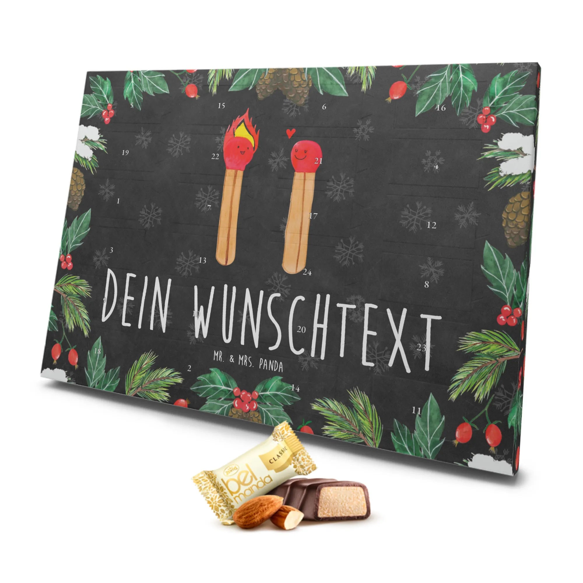 Entdecke den personalisierten Marzipan Adventskalender von Mr. & Mrs. Panda – das perfekte Geschenk für Verliebte! Mit dem einzigartigen Motiv der Streichhölzer ist dieser Adventskalender nicht nur ein festlicher Genuss, sondern auch eine liebevolle Überraschung für deinen Partner oder deine Partnerin.