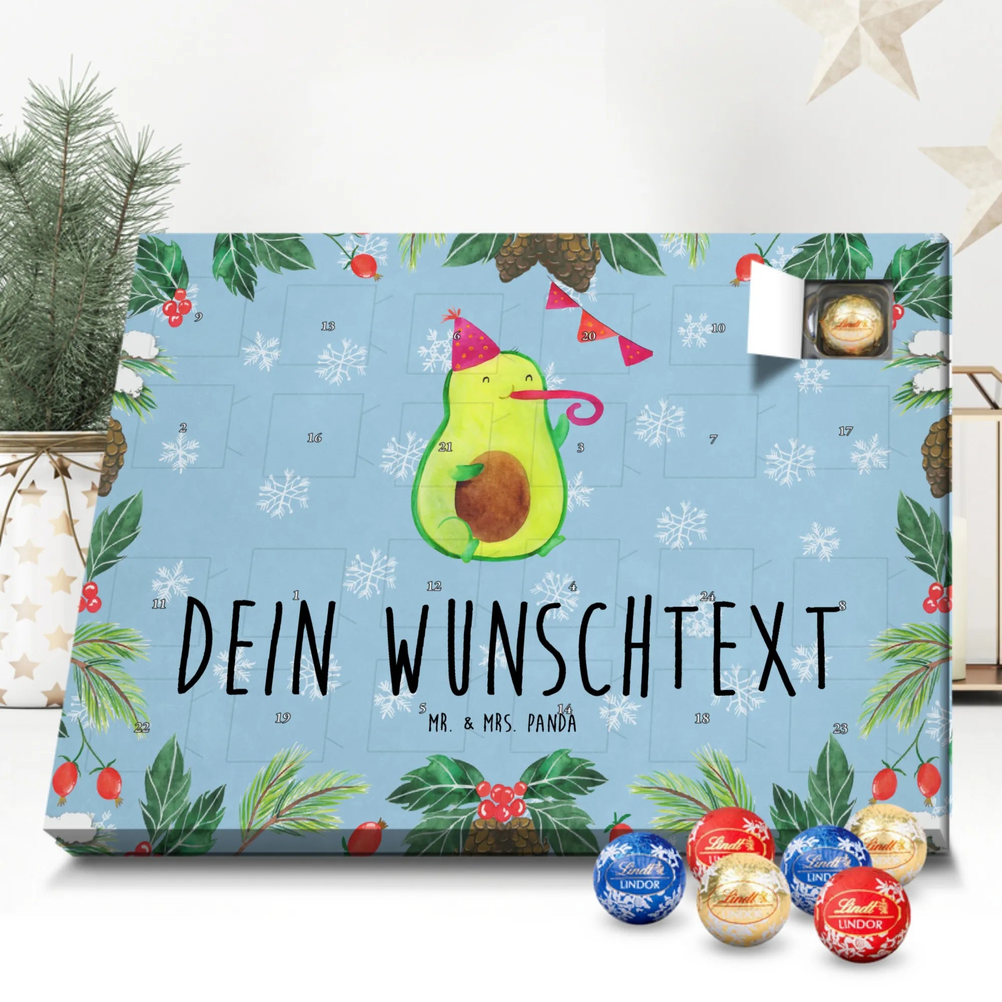 Make the Advent season even more special with the personalized chocolate Advent calendar from Mr. & Mrs. Panda. This unique Advent calendar is printed with your desired name or a custom text and features exclusive designs and sayings from the renowned designer duo. It's not only a visual highlight but also delights taste buds with 24 high-quality chocolate balls in various colors. The brilliant print quality and the silk-matte finish make this calendar a true eye-catcher during the Christmas season.