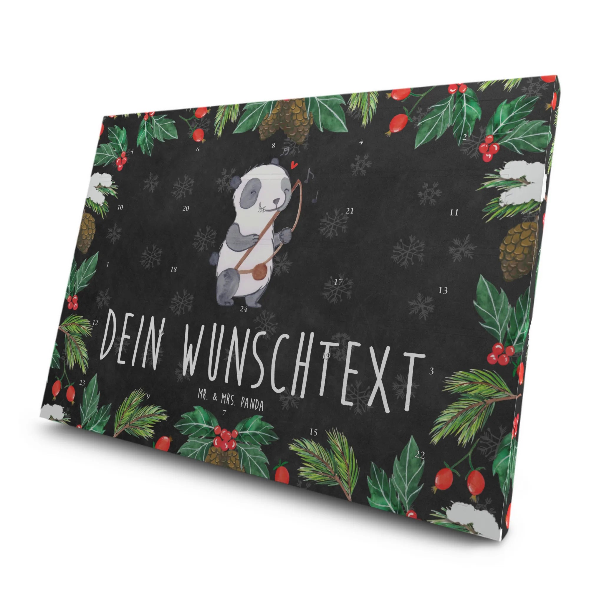 Der personalisierte Tee Adventskalender "Panda Berimbau" von Mr. & Mrs. Panda ist das perfekte Geschenk für Musikliebhaber und Teefreunde. Mit seinem einzigartigen Design, das einen fröhlichen Panda zeigt, der mit einem Berimbau, einem traditionellen brasilianischen Musikinstrument, spielt, bringt dieser Adventskalender Freude und Gemütlichkeit in die besinnliche Weihnachtszeit. Er besteht aus hochwertigem, 300 Gramm schwerem Karton, der seidenmatt veredelt ist und eine brillante Druckqualität bietet.