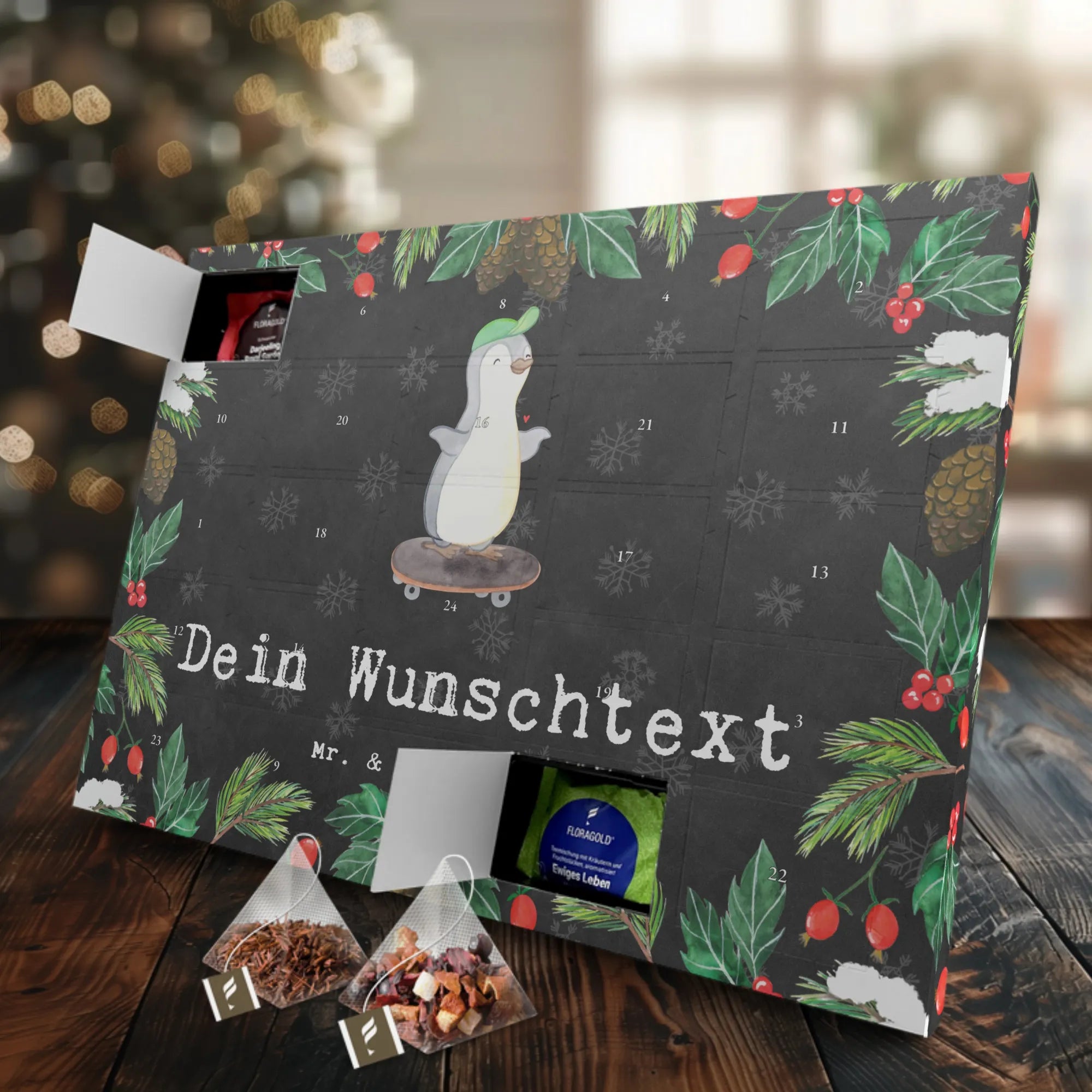 Der personalisierte Tee Adventskalender Pinguin Skateboarden Medizin von Mr. & Mrs. Panda ist das perfekte Geschenk für Skater und Sportliebhaber. Dieses liebevoll gestaltete Stück kommt mit einem süßen Pinguin-Motiv, der mit einem Skateboard durch die Welt rollt und einer fröhlichen Botschaft: "Skateboarden ist meine Medizin." Der Adventskalender bringt Freude und Spannung in die Vorweihnachtszeit und begeistert sowohl Kinder als auch Erwachsene, die Skaten als ihr Hobby oder ihre Leidenschaft entdecken.