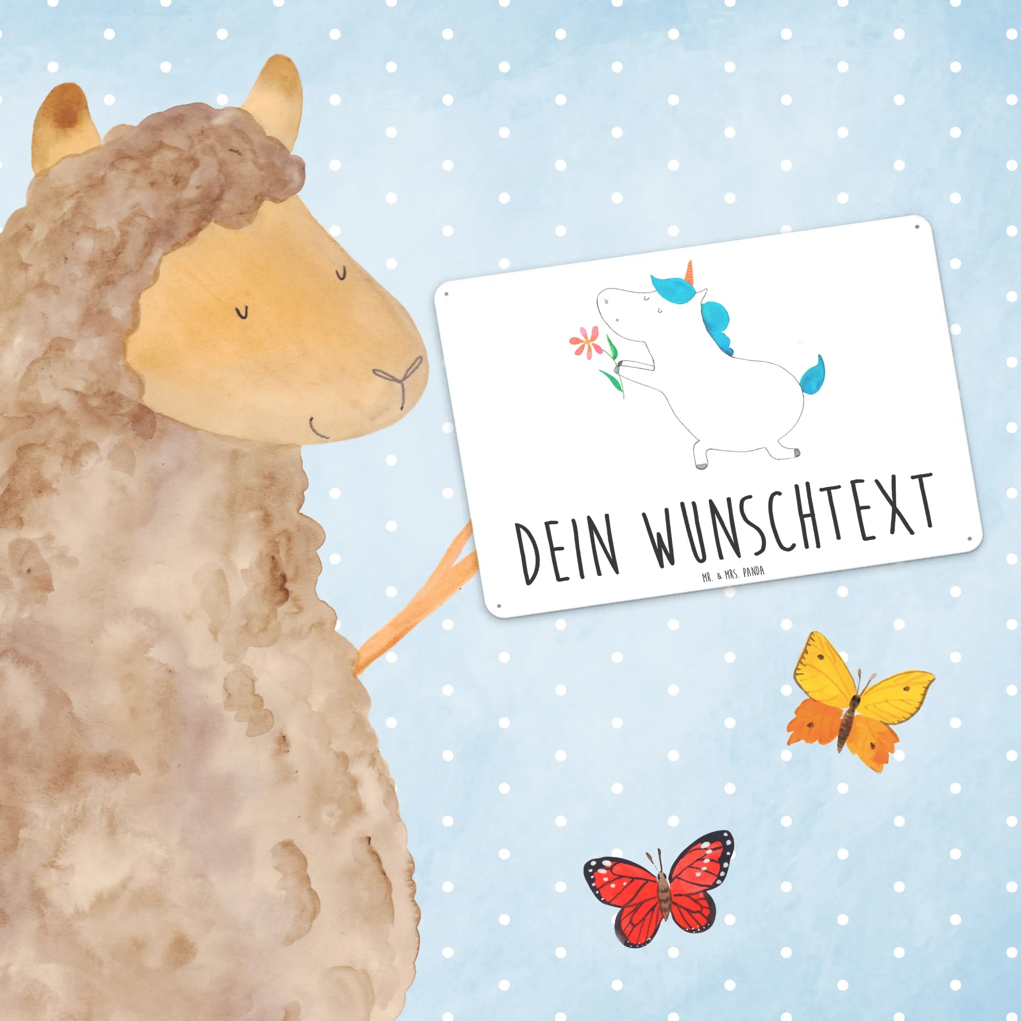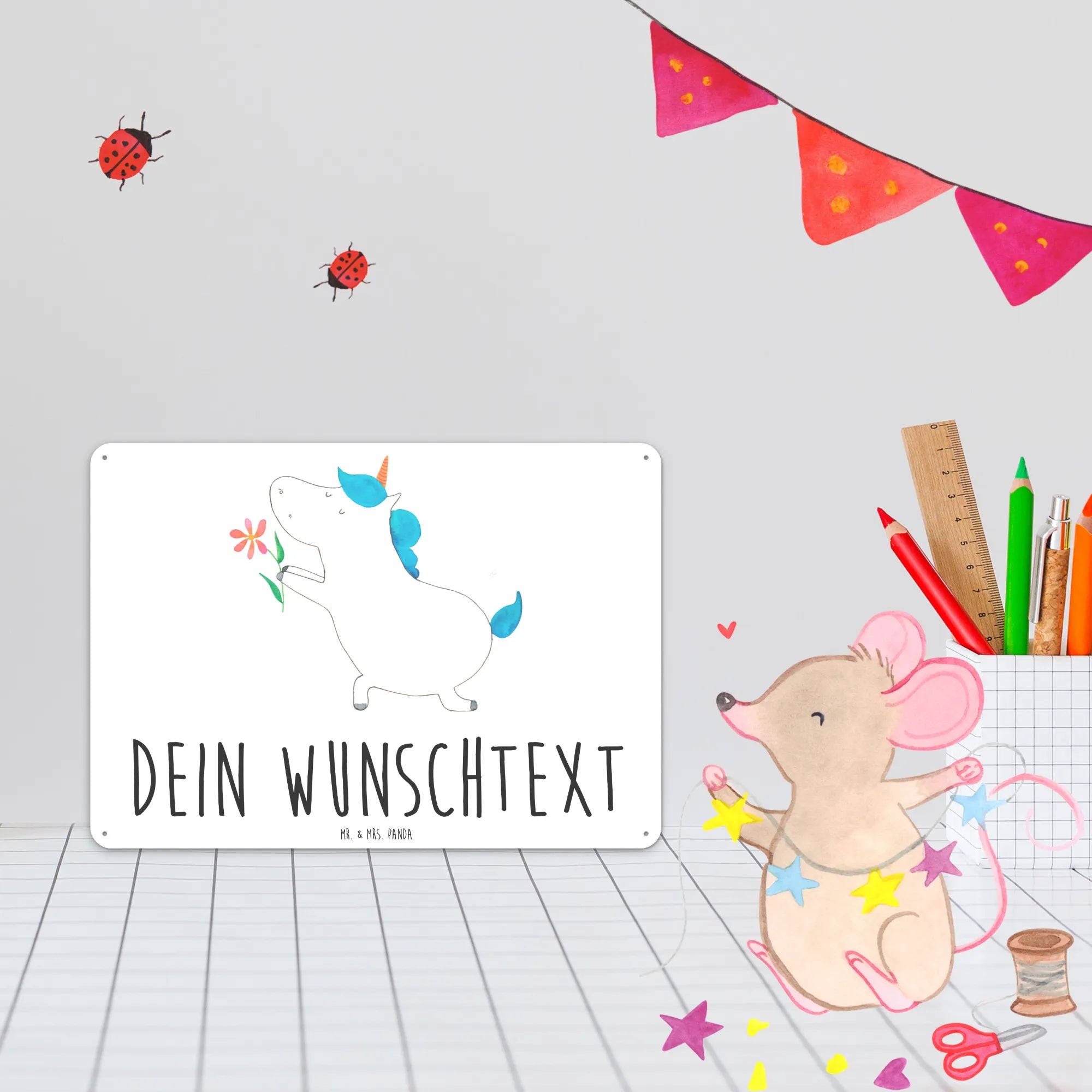 Das personalisierte Blechschild "Einhorn Blume" aus der bezaubernden Einhorn-Kollektion von Mr. & Mrs. Panda ist das perfekte Geschenk für alle Einhornliebhaber! Mit einer Größe von DIN A6 und gefertigt aus hochwertigem Stahlblech, strahlt dieses Schild Eleganz und Qualität aus.